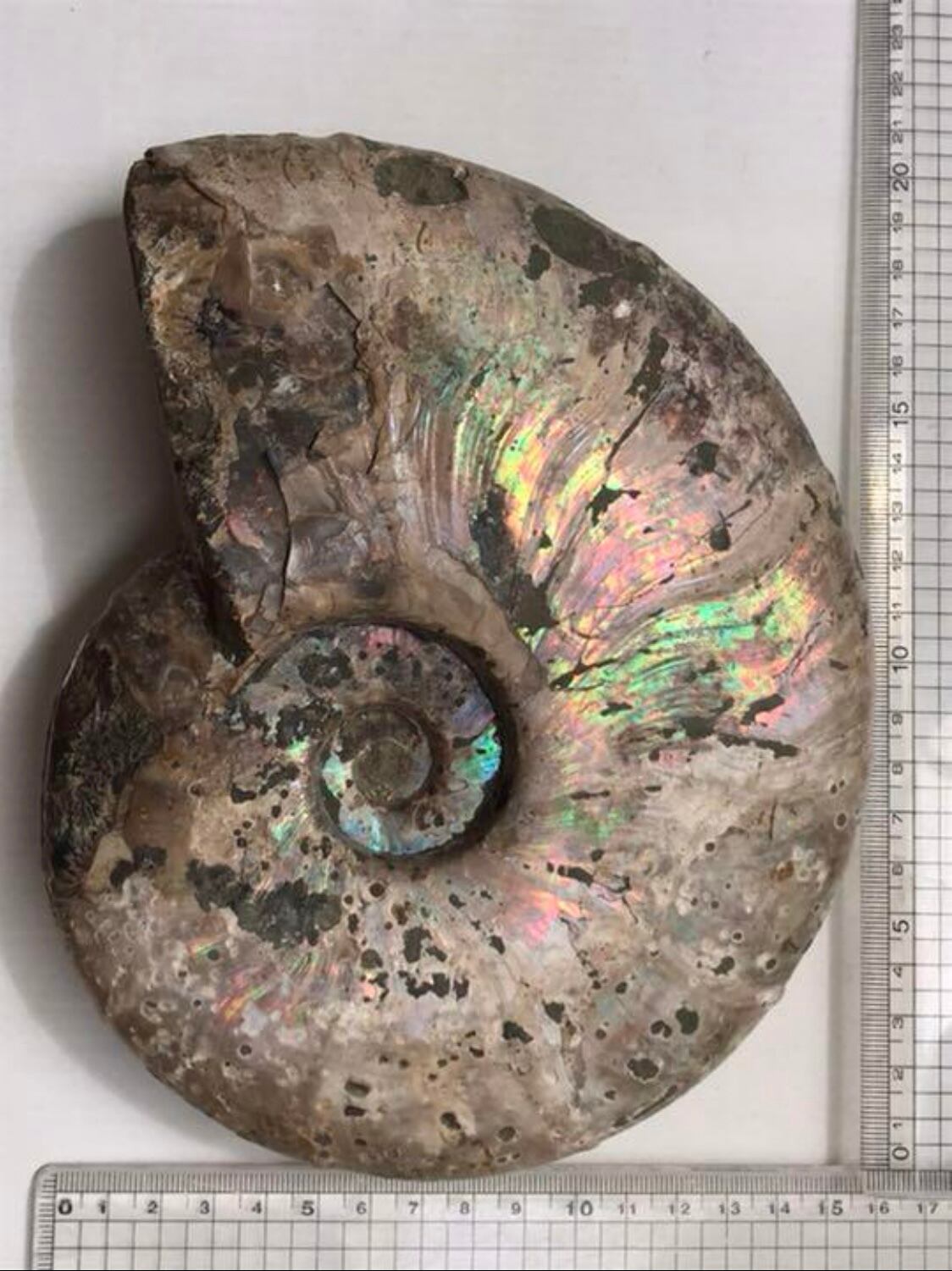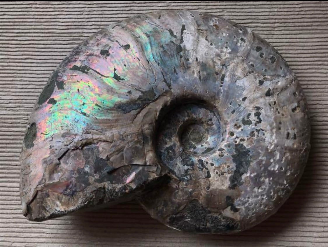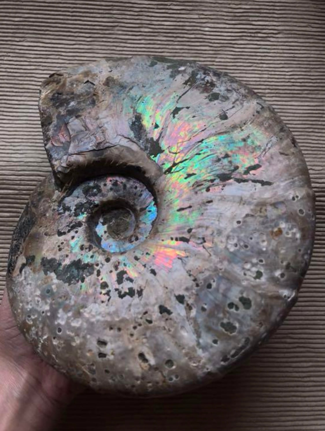 ⭐︎ビューダンティセラスの特大サイズです。厚みもあり、かなりの大きさと重さに圧倒されます。両面ともおへそ中心まで綺麗にくり抜かれ、剥がれも少なく、盛り上がった肋も綺麗に浮き出ています。両面とも強烈な虹色遊色が見られます。特大サイズでこれほど状態の良い個体は貴重です。コレクションにいかがでしょうか。剥がれ等の状態は写真にてご確認ください。