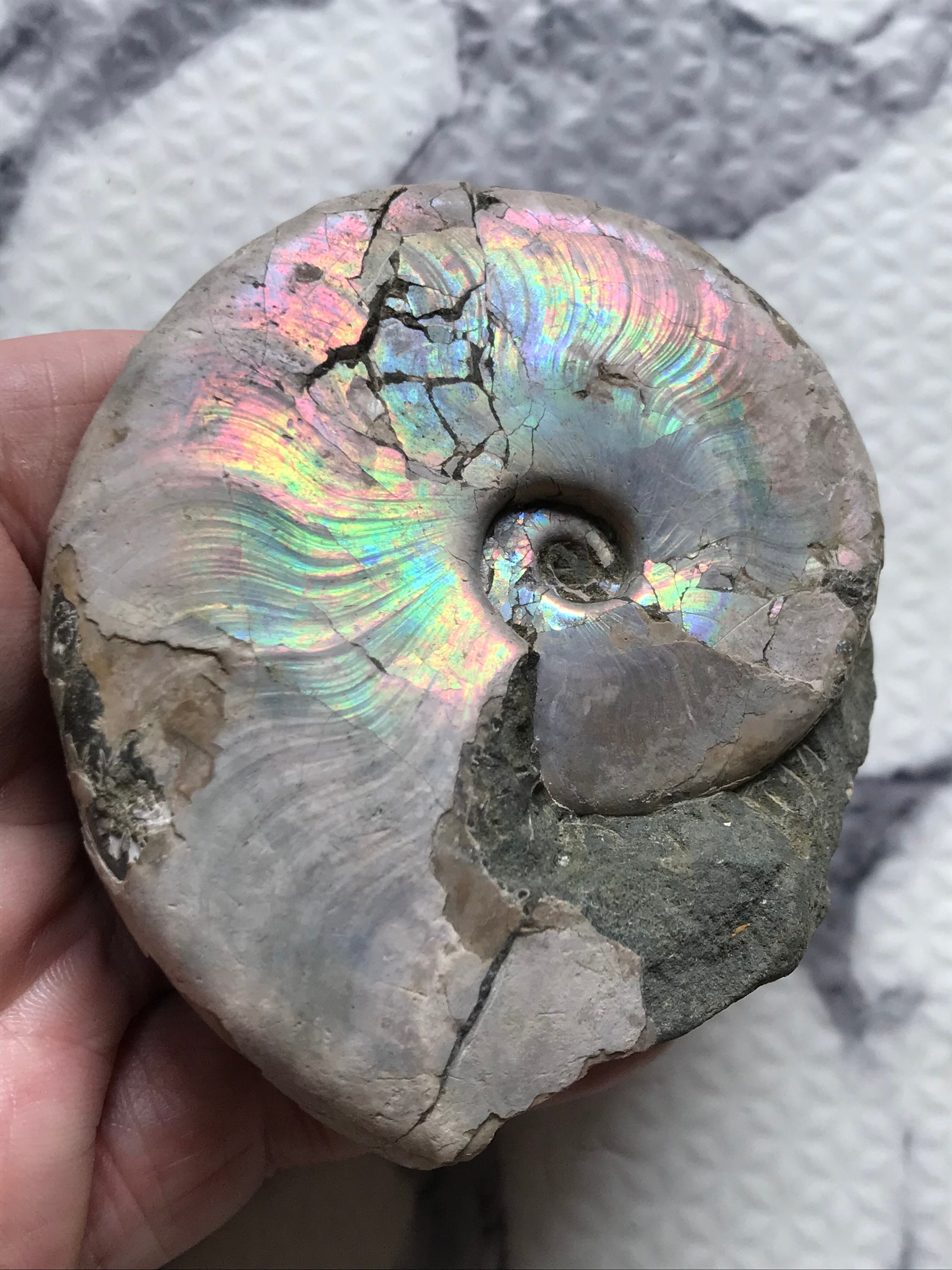 虹色の遊色効果があるアンモナイトです。殻表面が日光や照明にあたる角度によって青、緑、紫、ピンク等に輝き飽きがきません。カラフルな色彩の個体をお探しの方や、プレゼントとしての化石をお考えの方はこの機会にいかがでしょうか。
