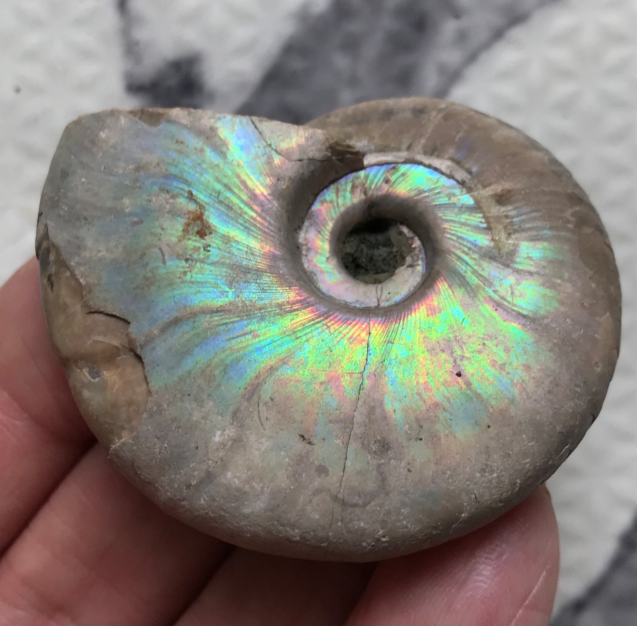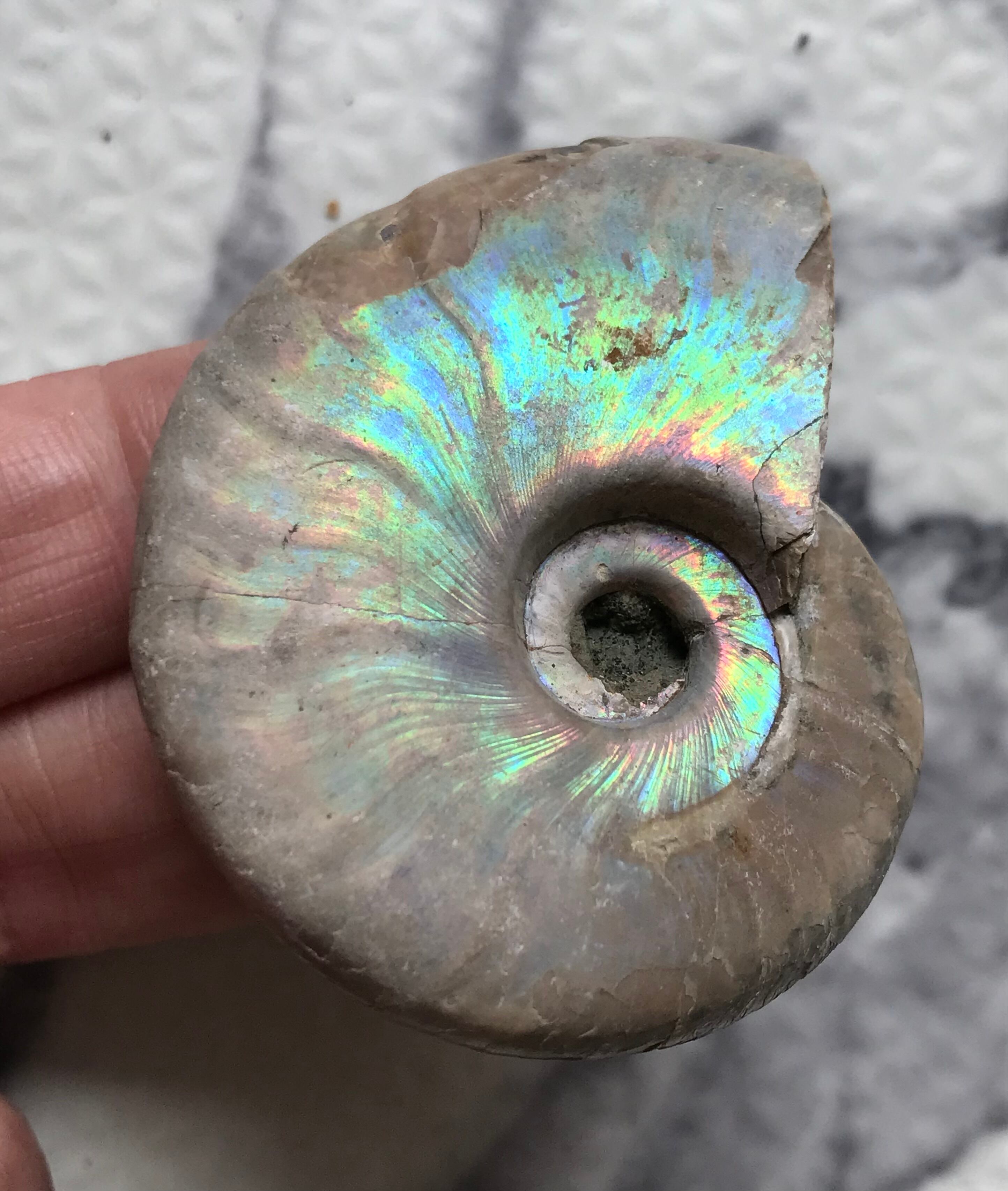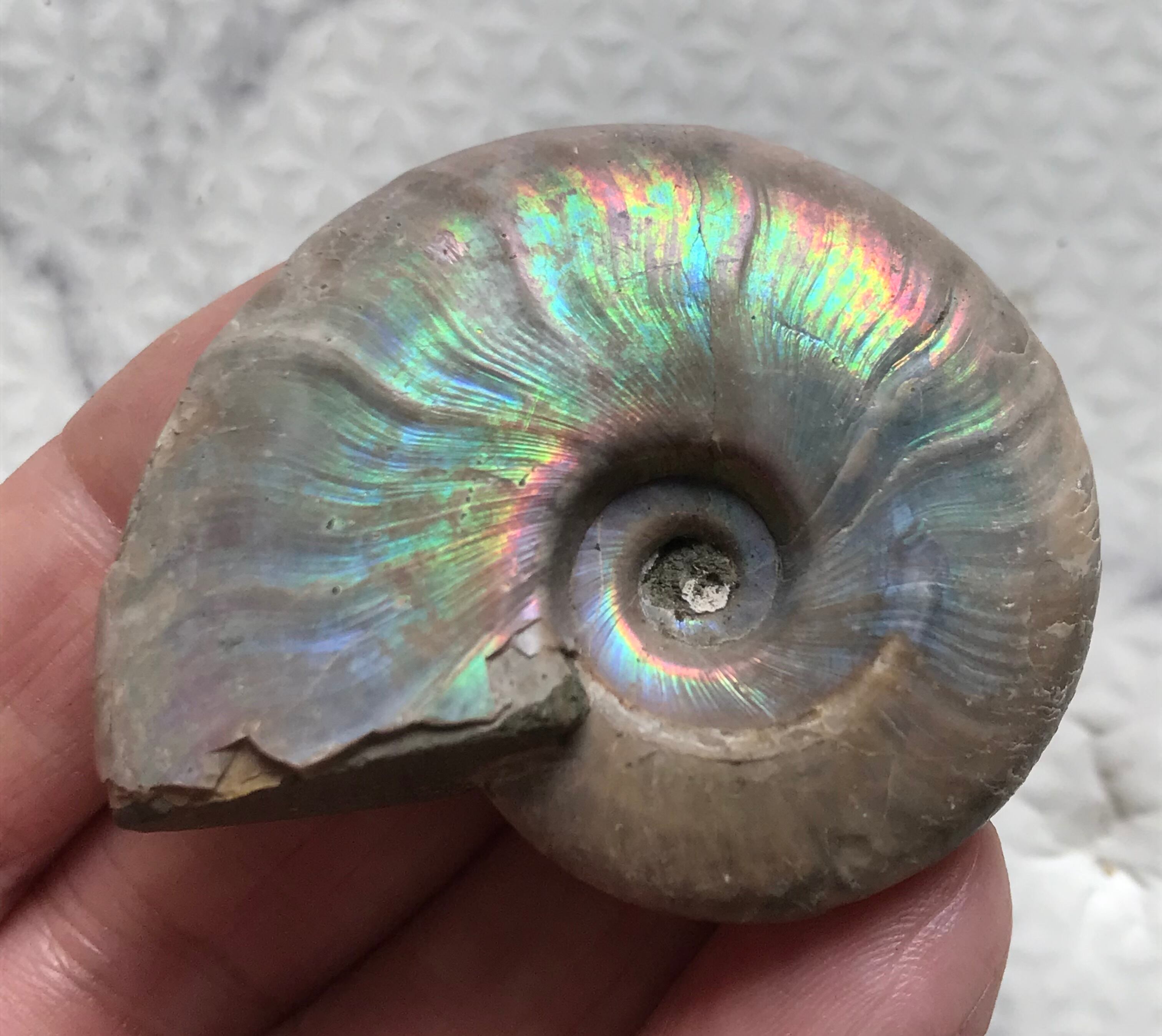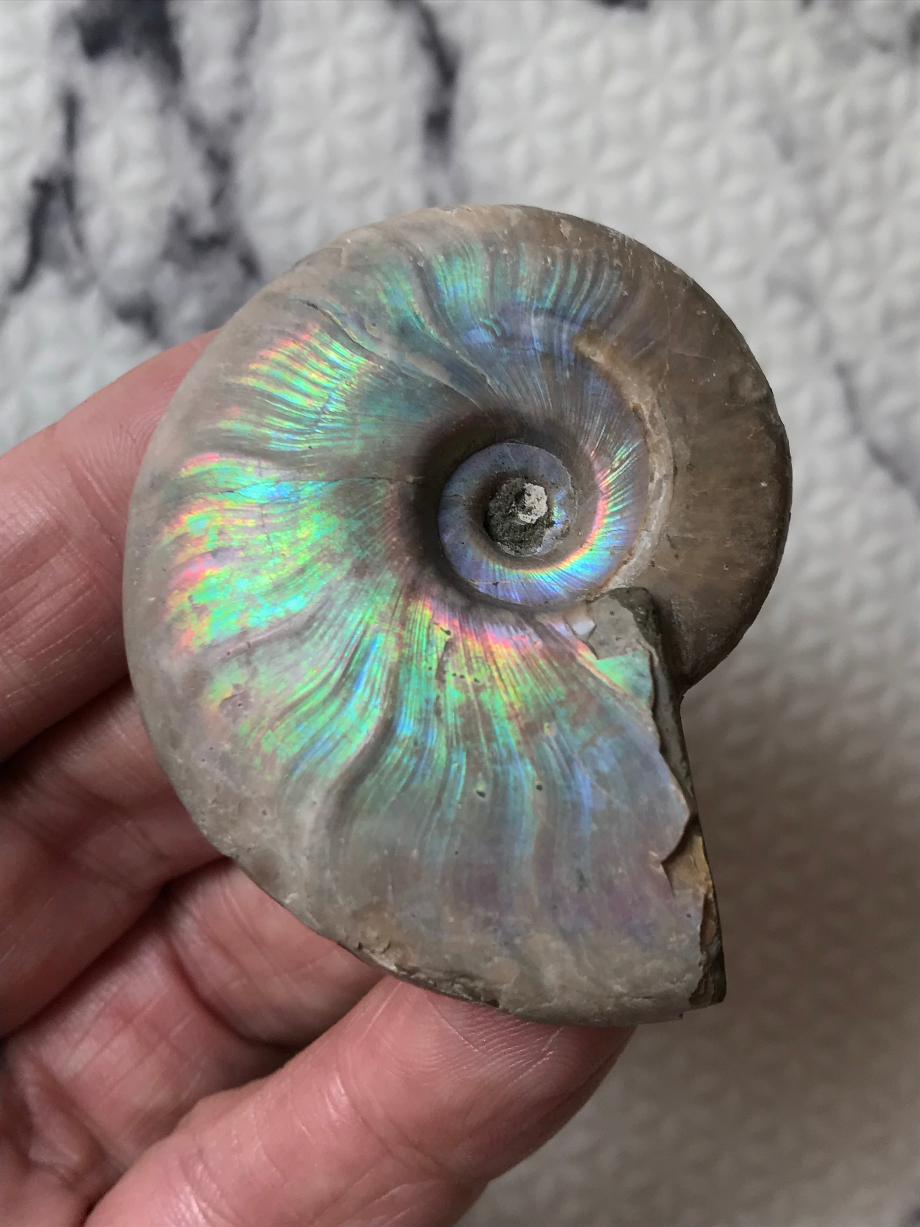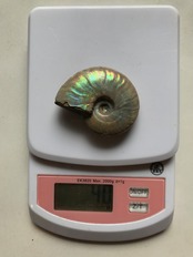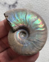 虹色の遊色効果があるアンモナイトです。殻表面が日光や照明にあたる角度によって青、緑、紫、ピンク等に輝き飽きがきません。カラフルな色彩の個体をお探しの方や、プレゼントとしての化石をお考えの方はこの機会にいかがでしょうか。