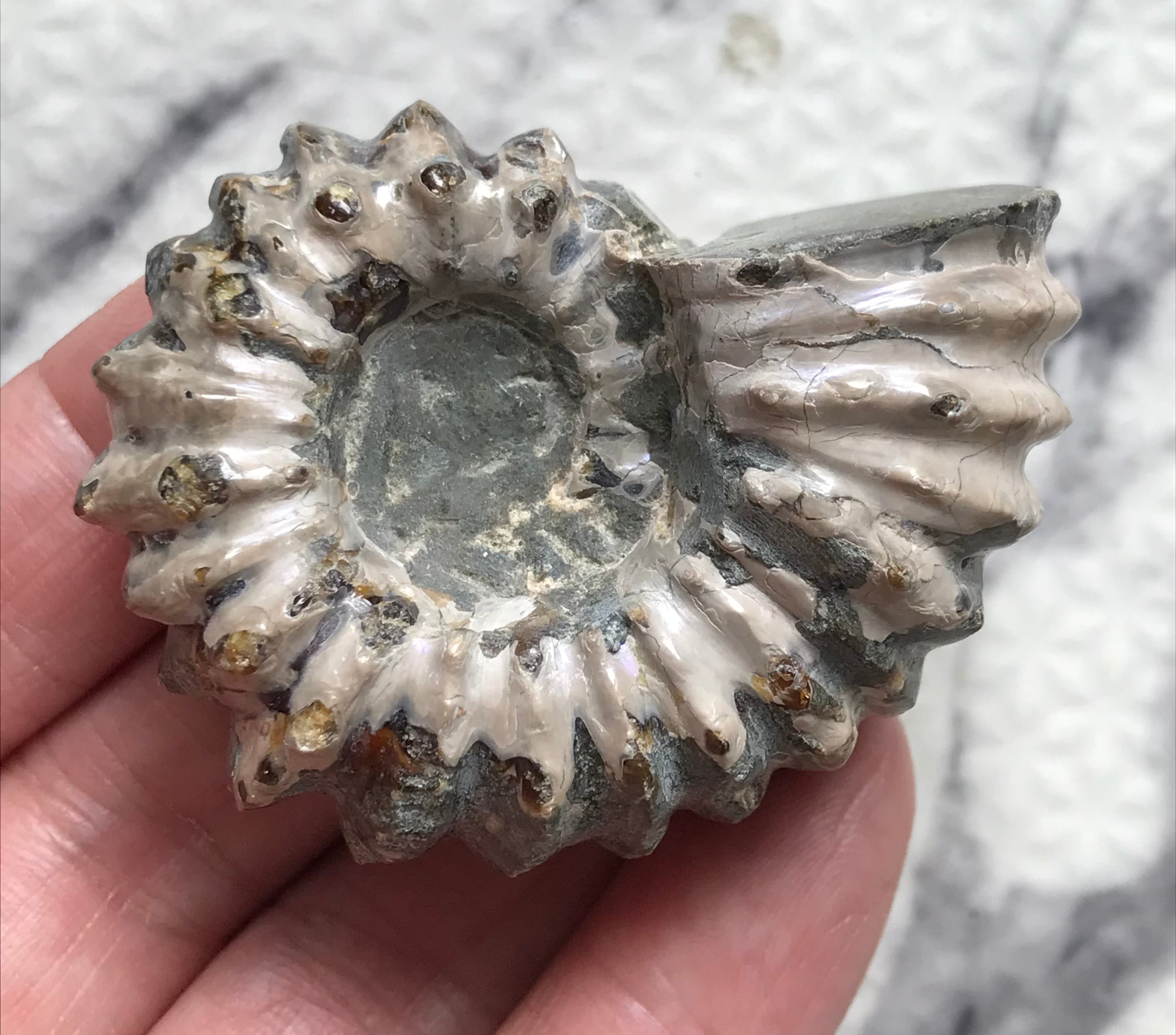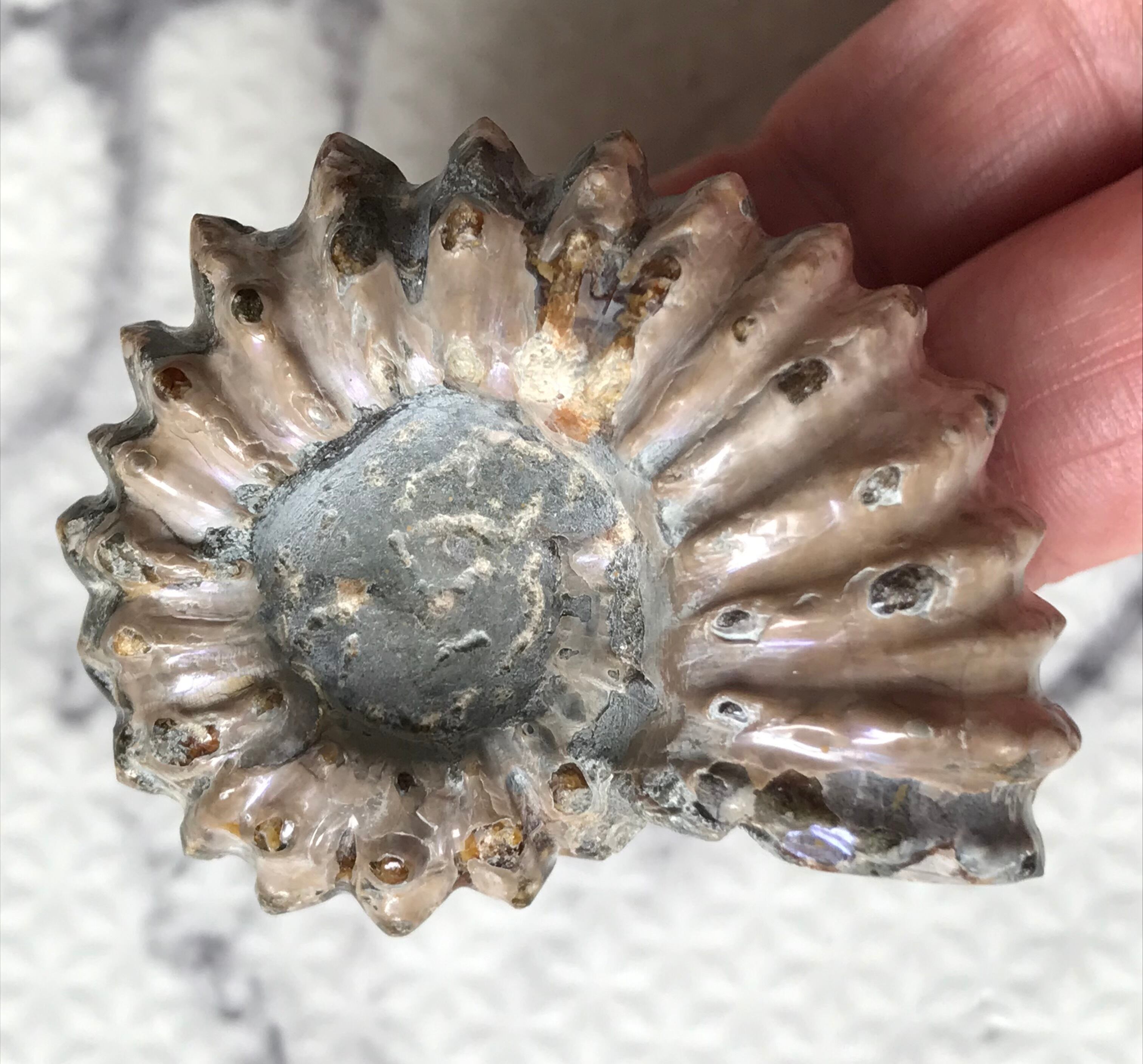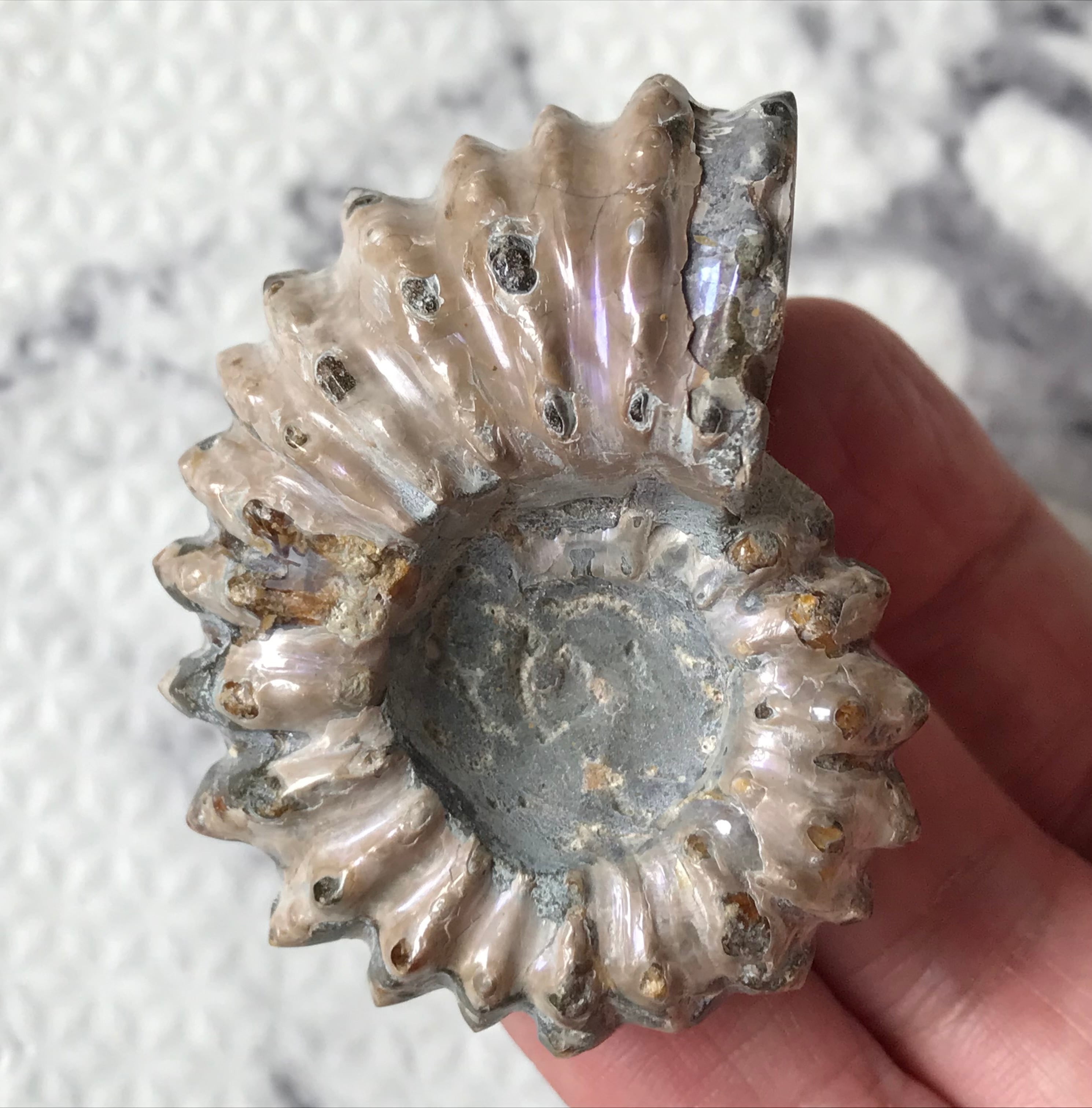 虹色の遊色効果があるアンモナイトです。殻表面が日光や照明にあたる角度によって青、緑、紫、ピンク等に輝き飽きがきません。カラフルな色彩の個体をお探しの方や、プレゼントとしての化石をお考えの方はこの機会にいかがでしょうか。