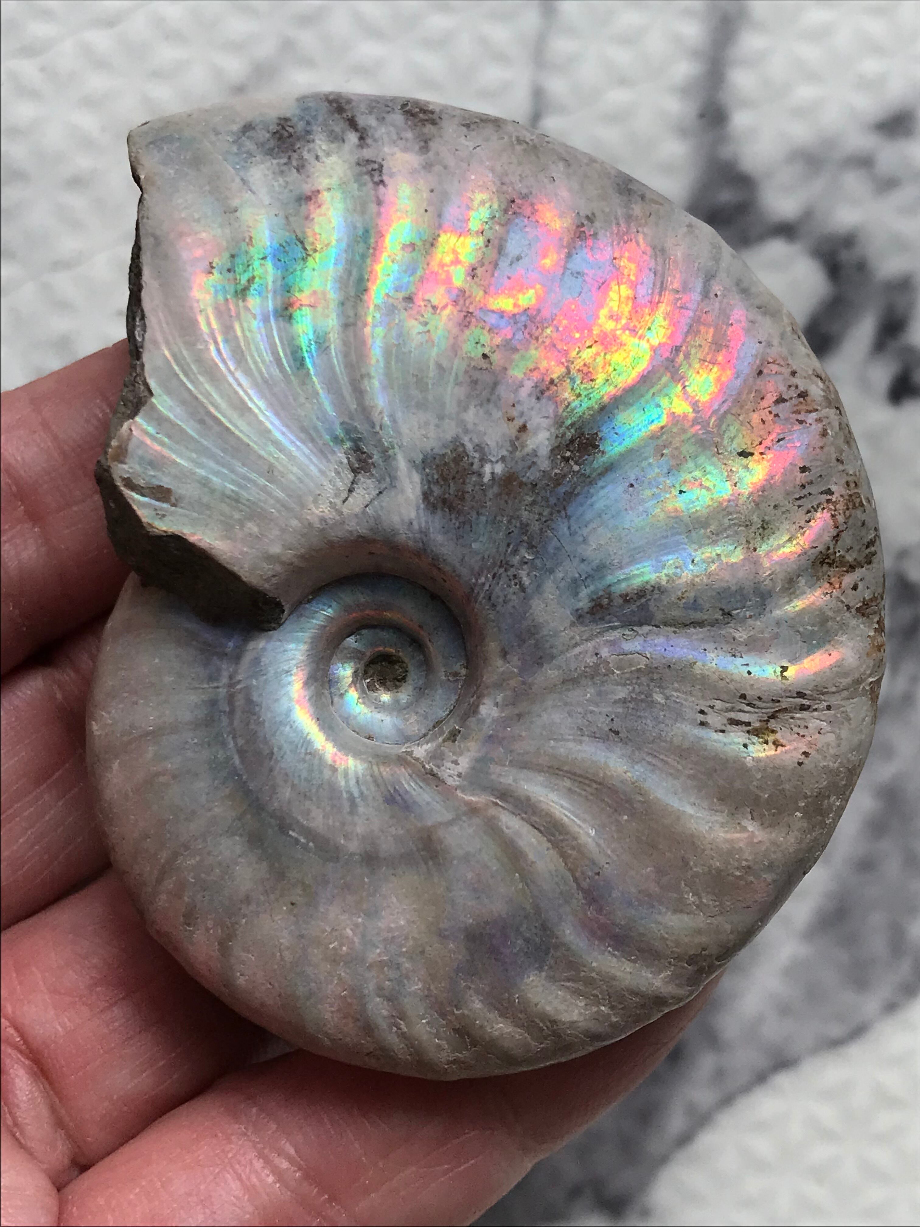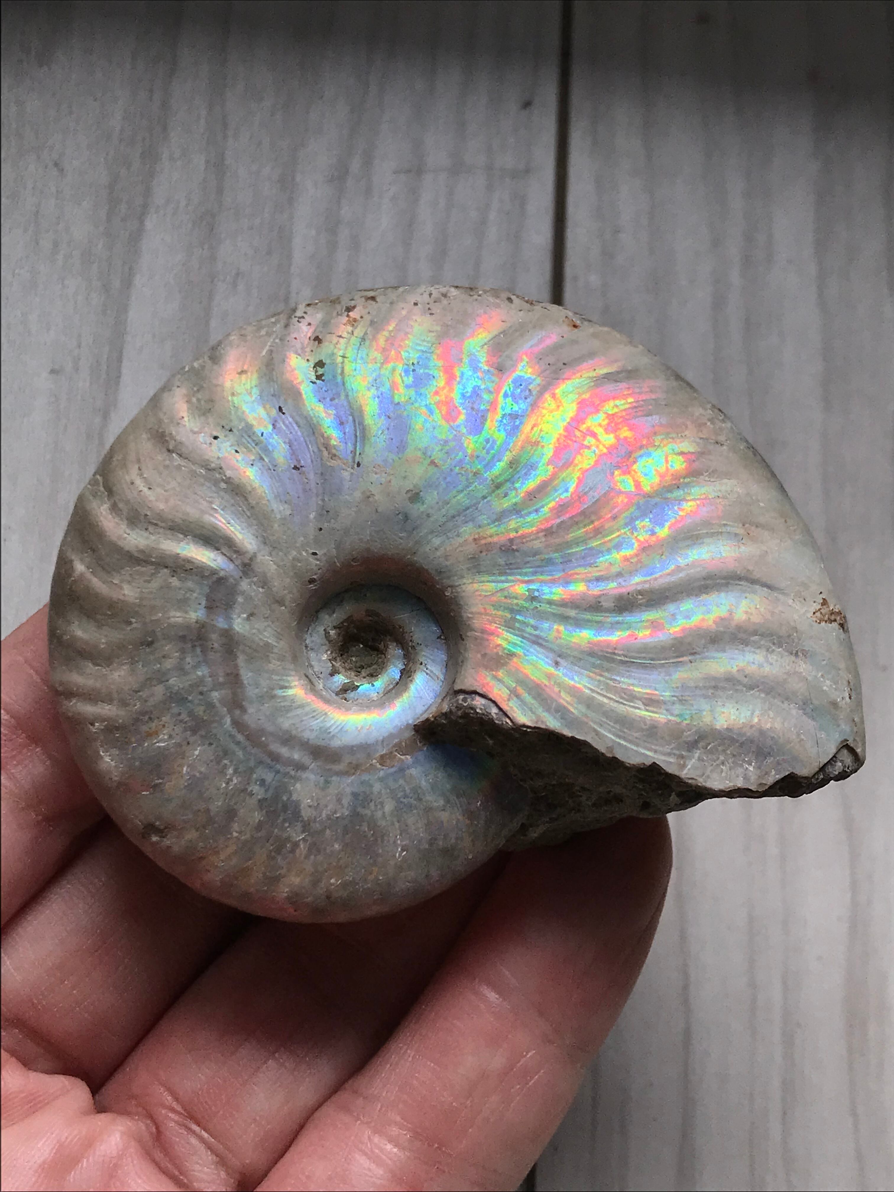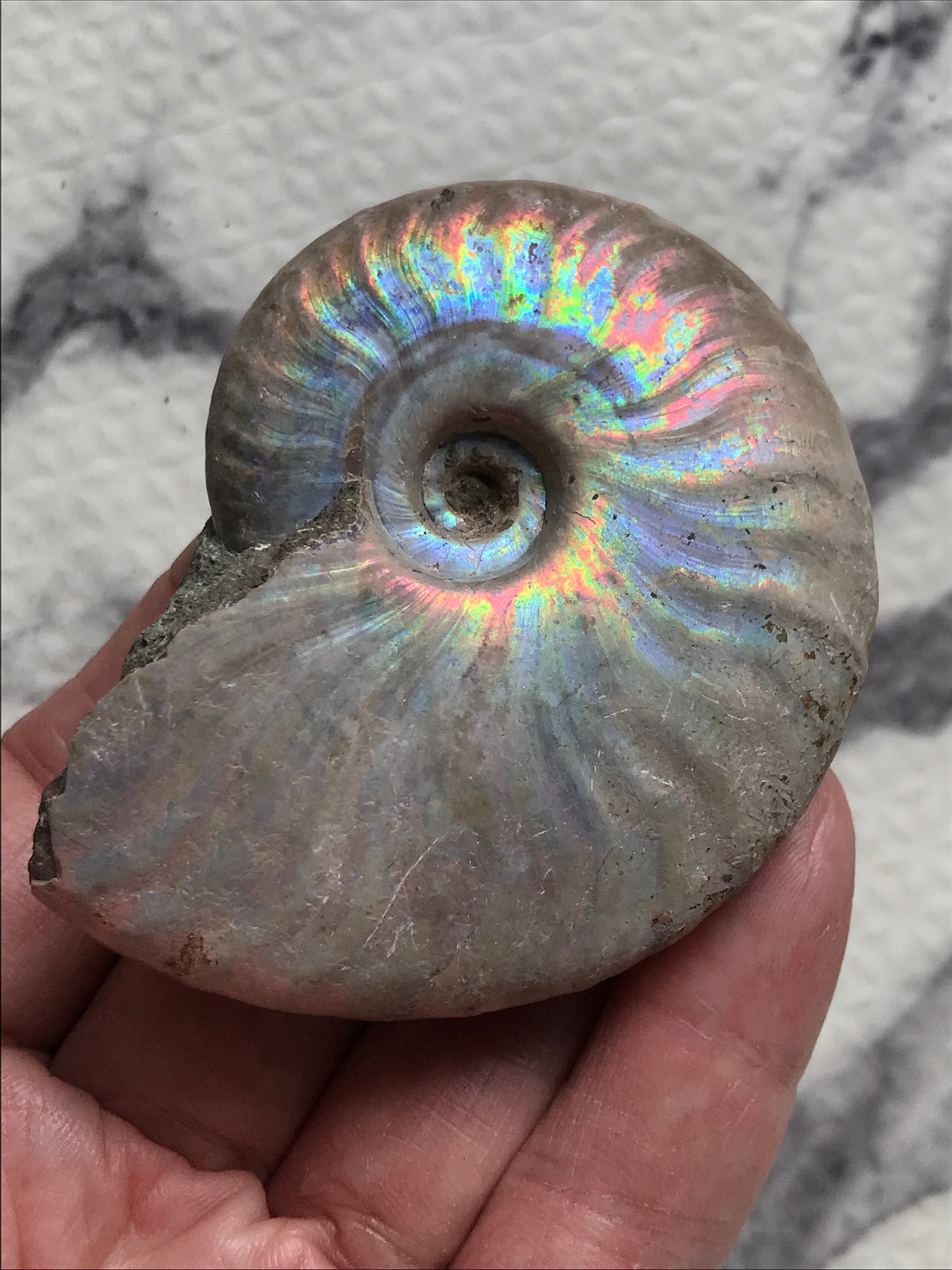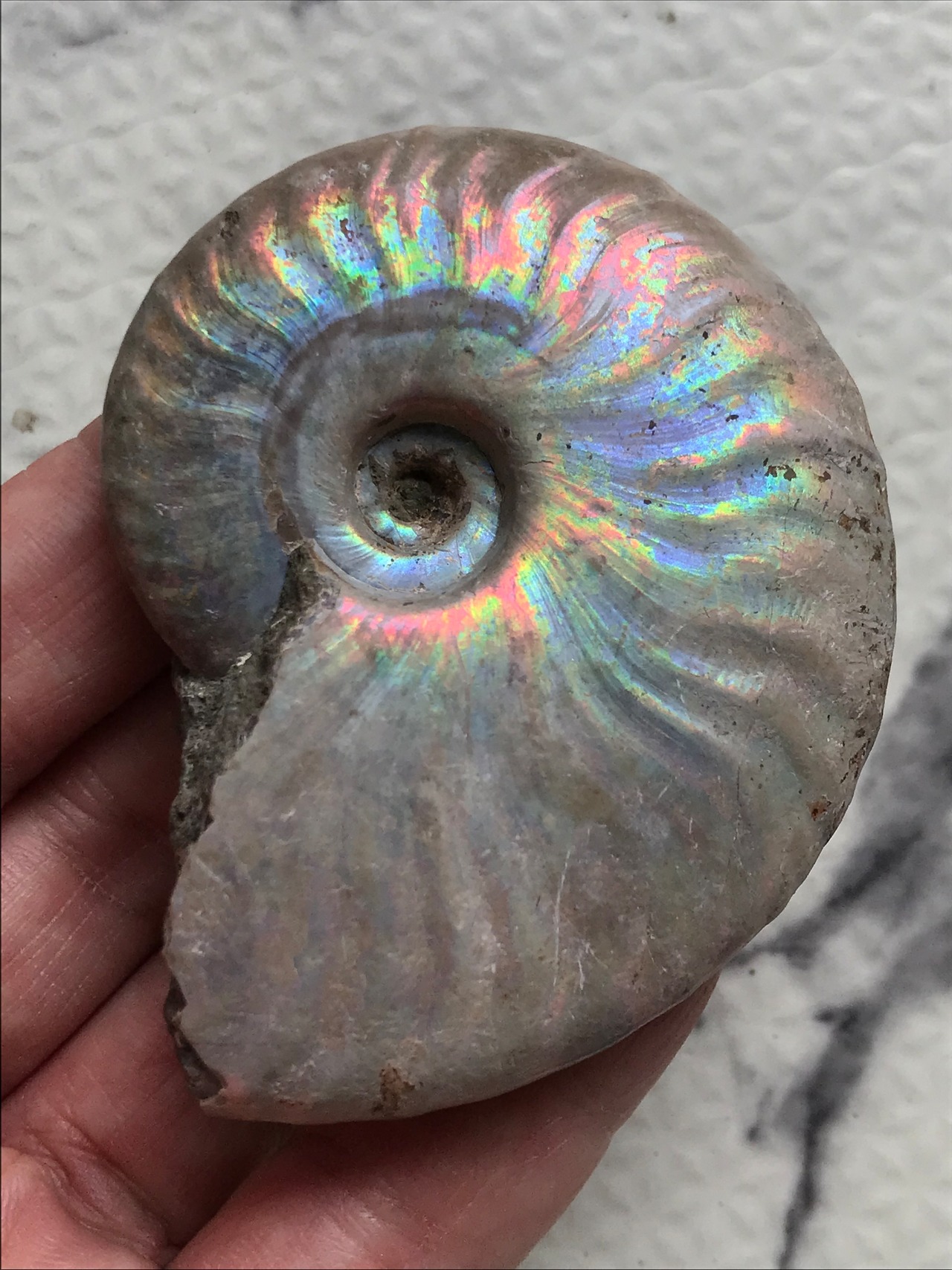 虹色の遊色効果があるアンモナイトです。殻表面が日光や照明にあたる角度によって青、緑、紫、ピンク等に輝き飽きがきません。カラフルな色彩の個体をお探しの方や、プレゼントとしての化石をお考えの方はこの機会にいかがでしょうか。
