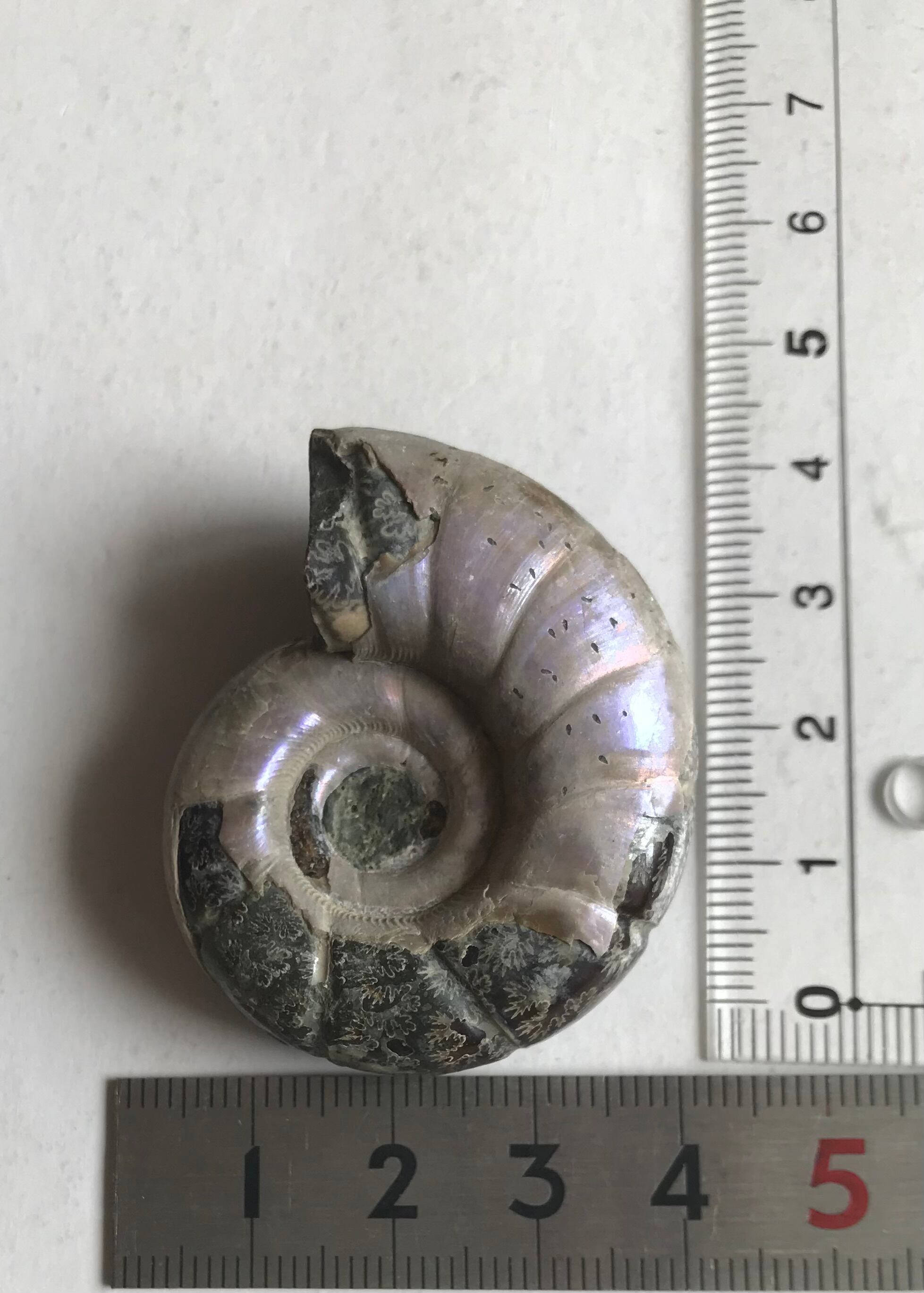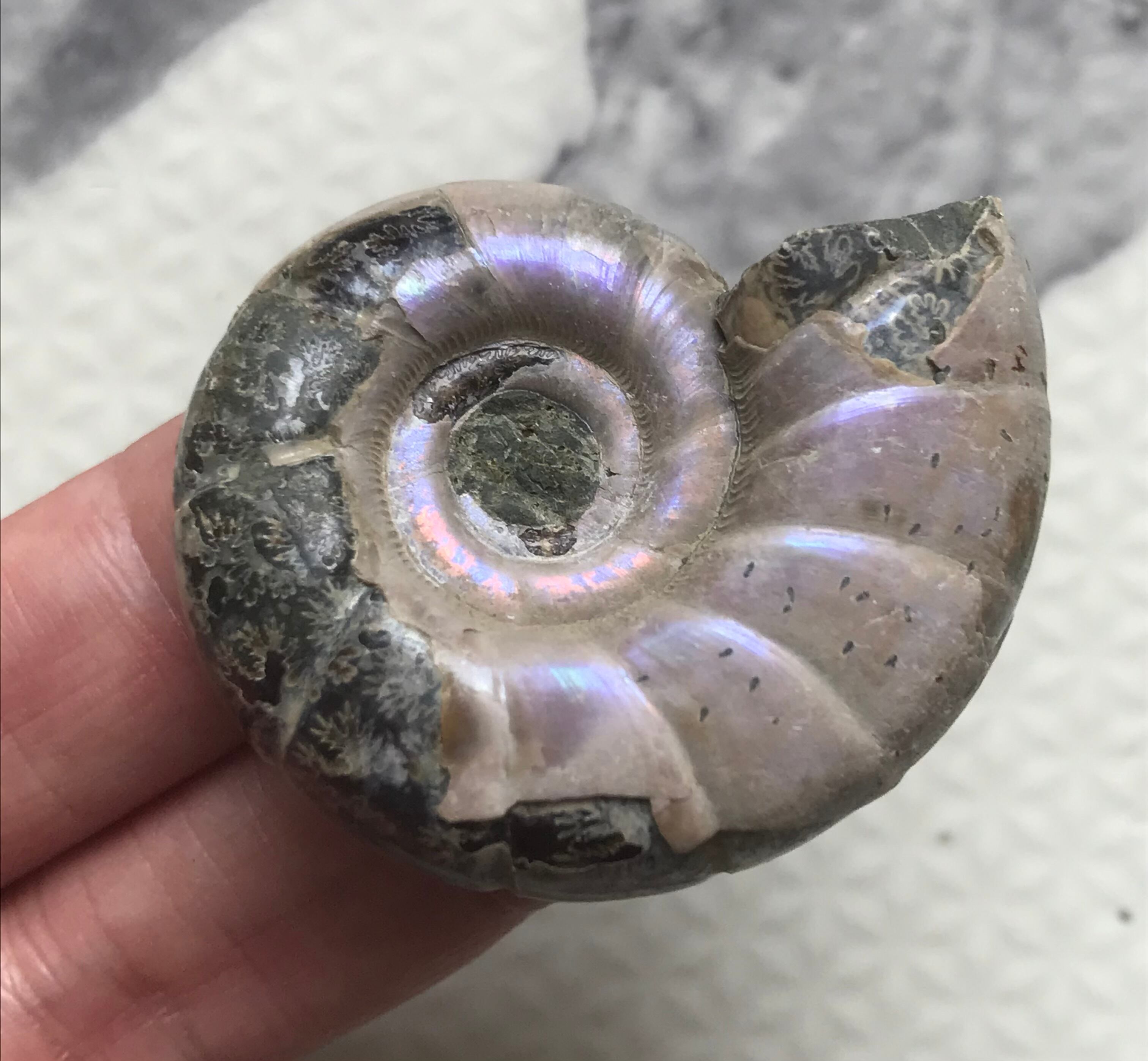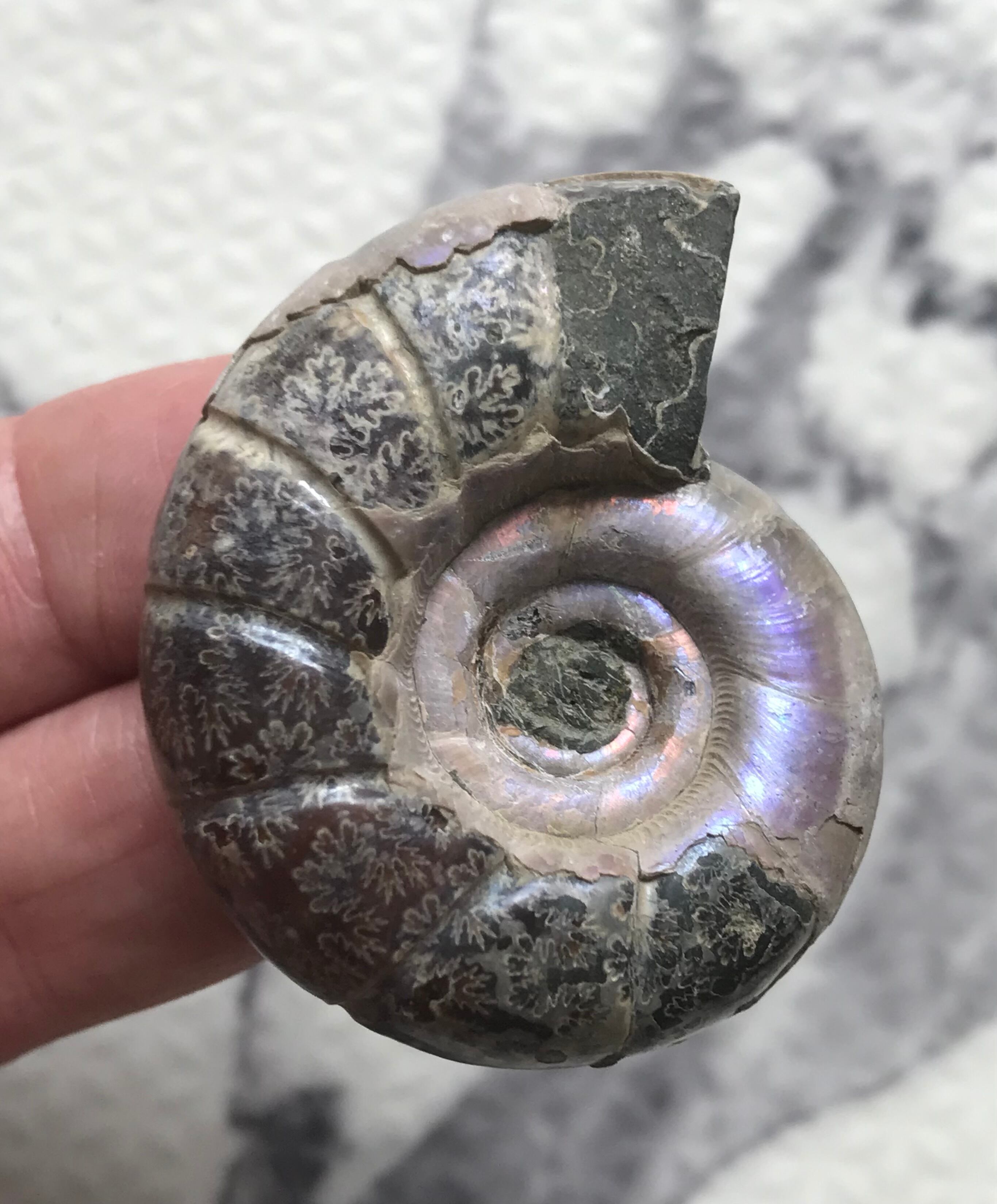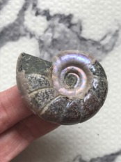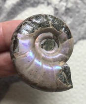 虹色の遊色効果があるアンモナイトです。殻表面が日光や照明にあたる角度によって青、緑、紫、ピンク等に輝き飽きがきません。カラフルな色彩の個体をお探しの方や、プレゼントとしての化石をお考えの方はこの機会にいかがでしょうか。