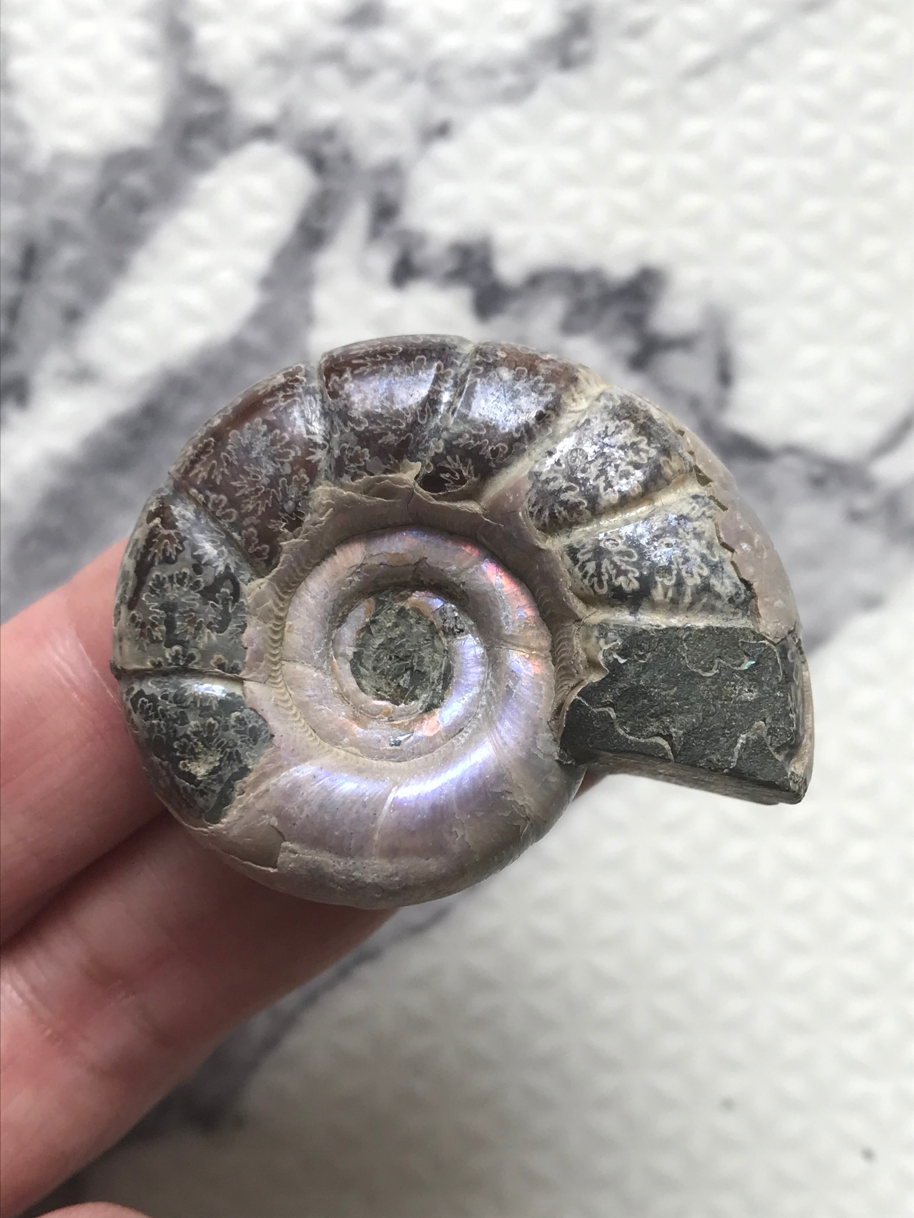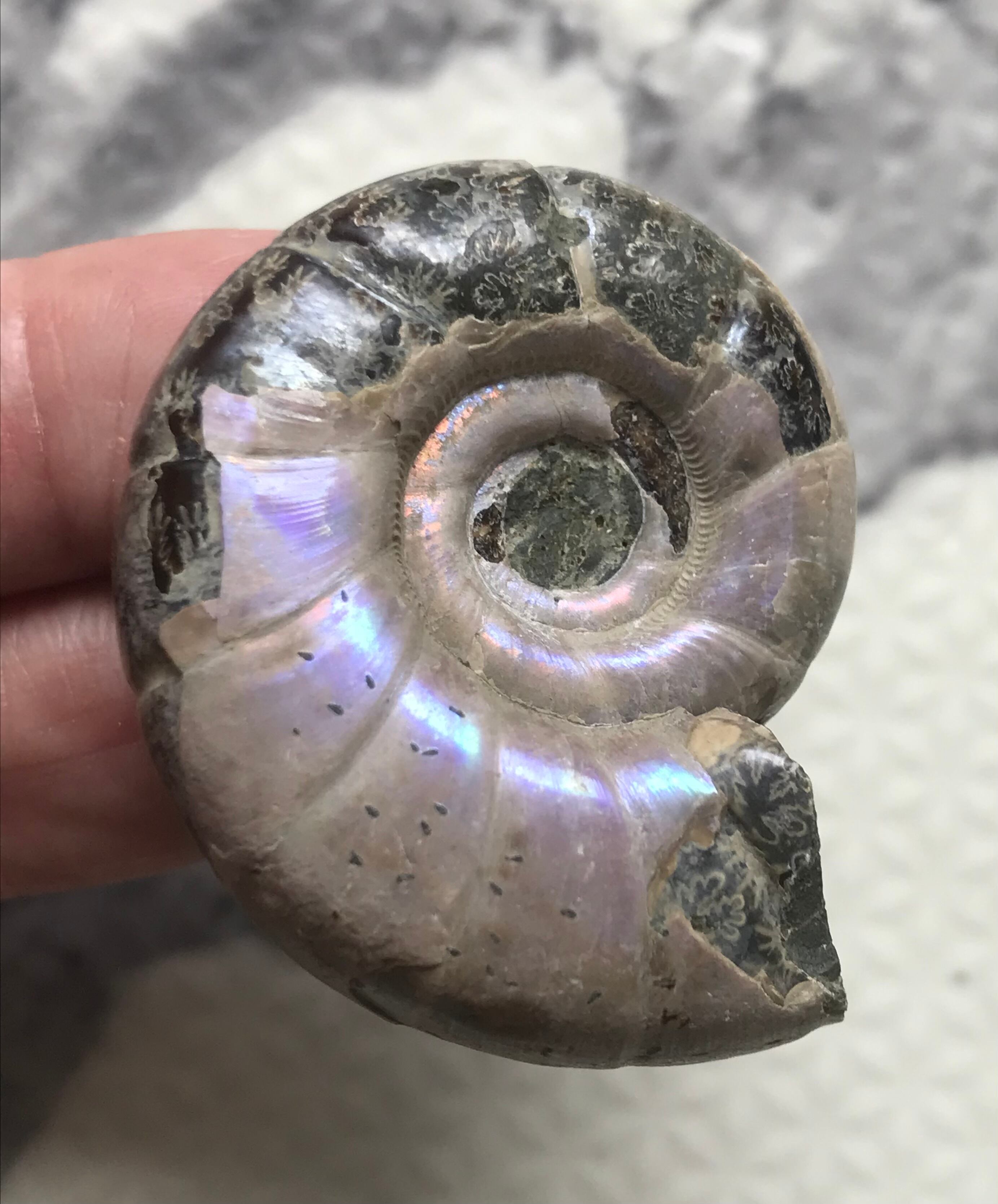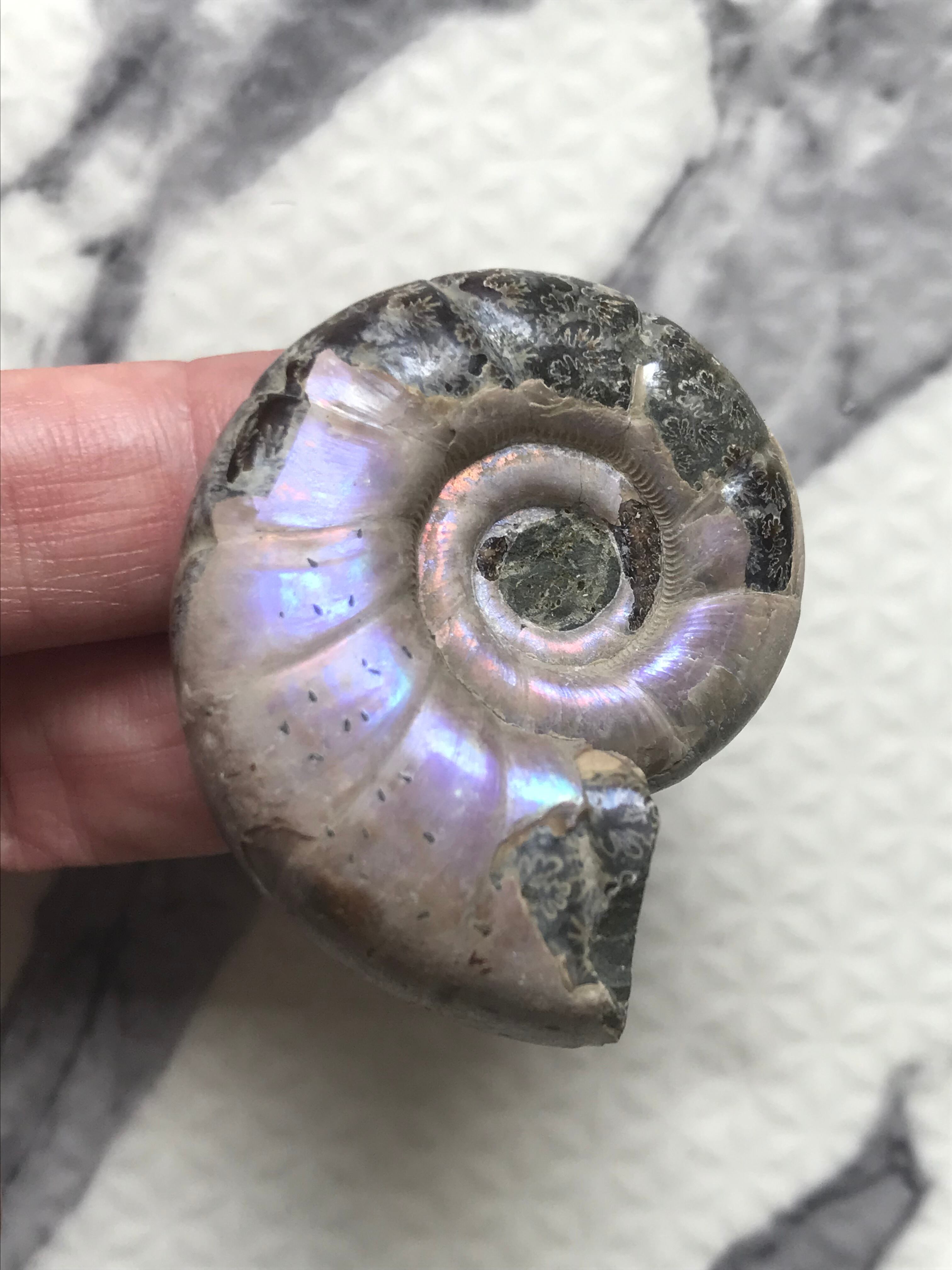 虹色の遊色効果があるアンモナイトです。殻表面が日光や照明にあたる角度によって青、緑、紫、ピンク等に輝き飽きがきません。カラフルな色彩の個体をお探しの方や、プレゼントとしての化石をお考えの方はこの機会にいかがでしょうか。