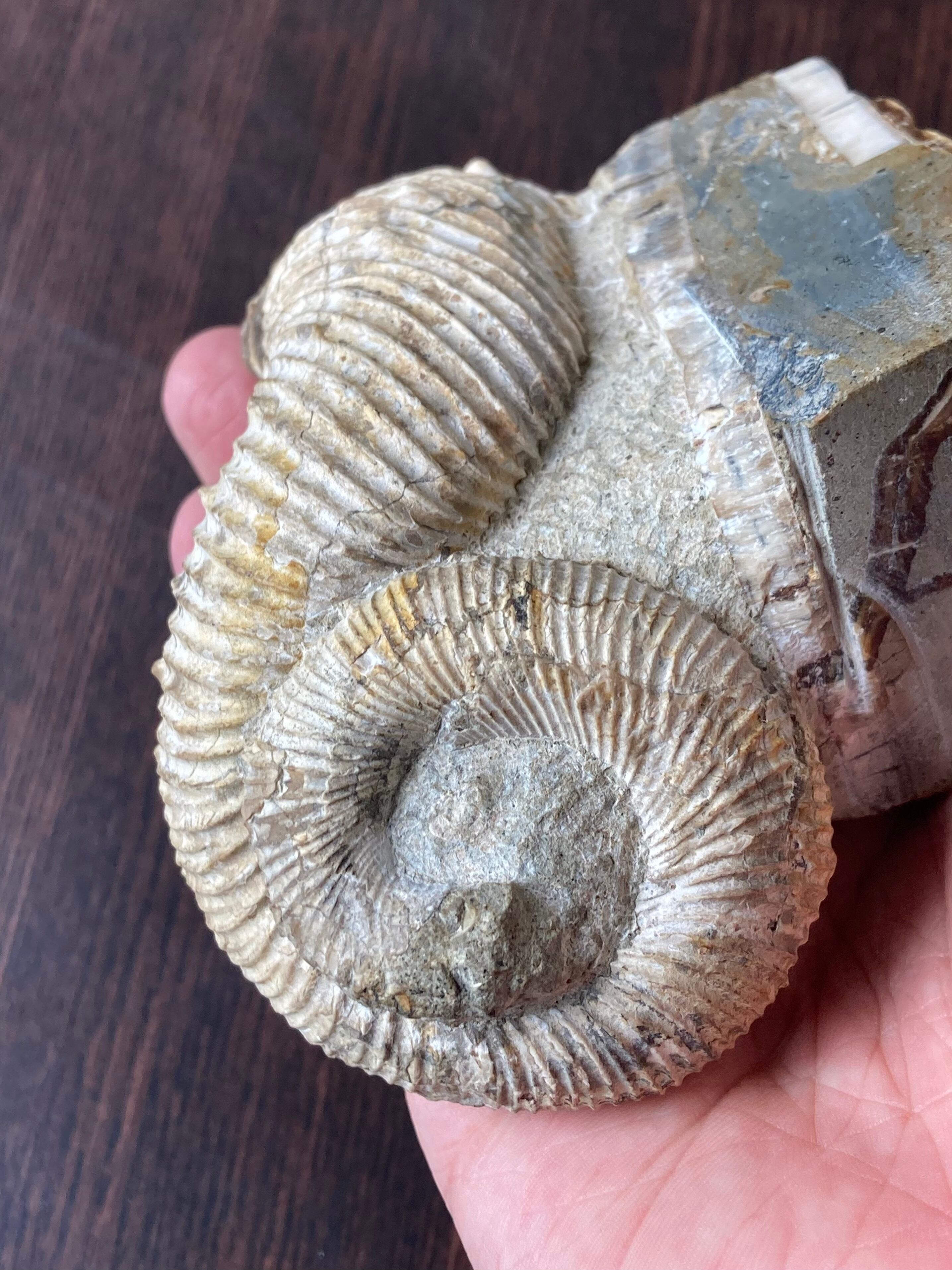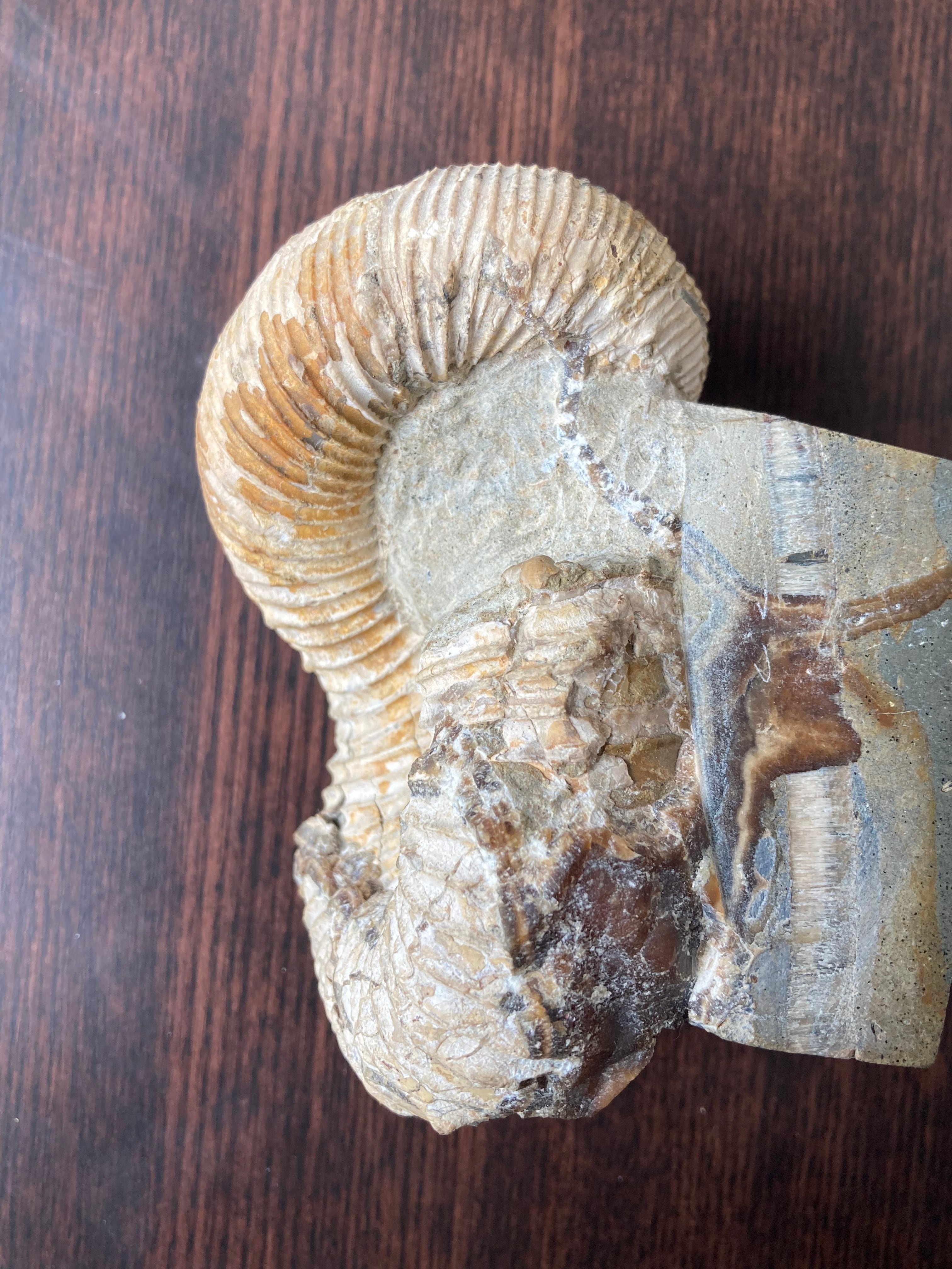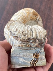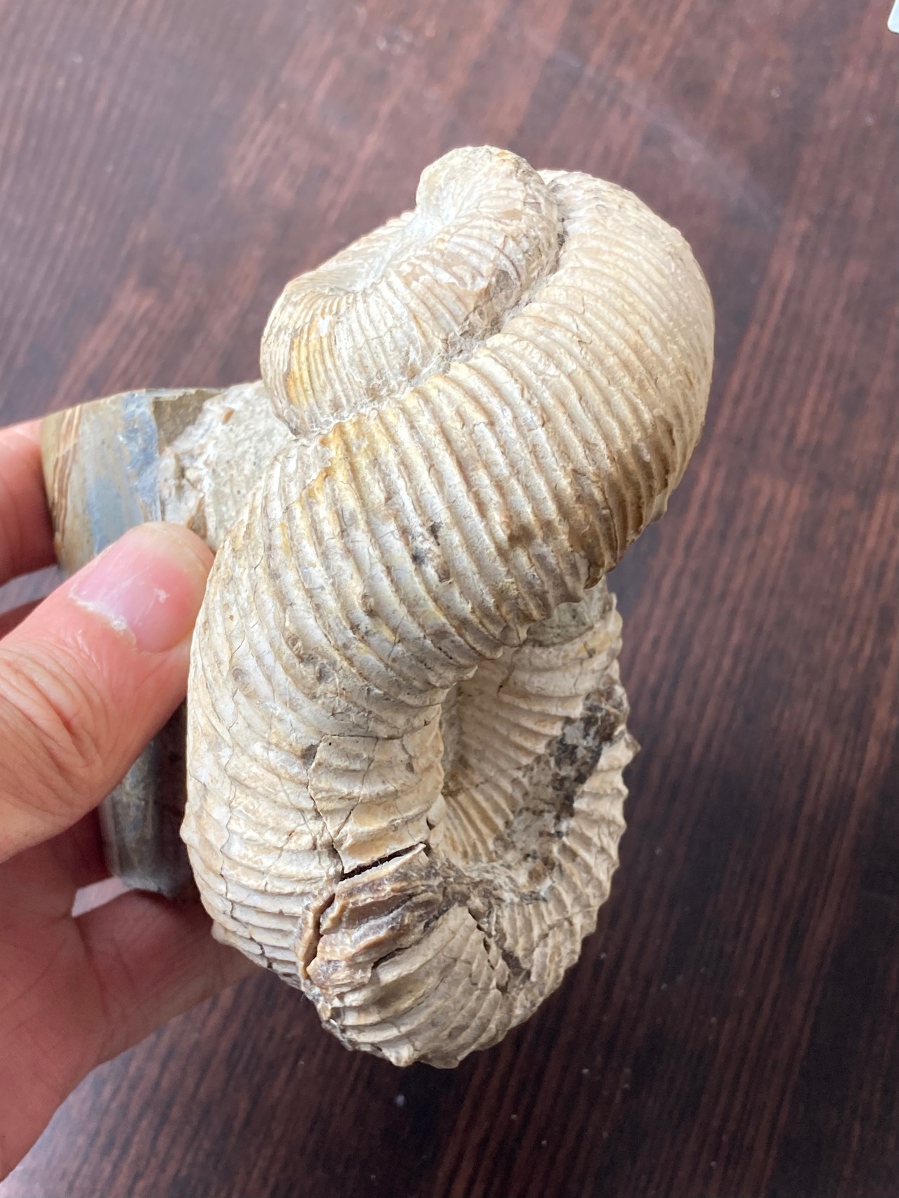 ヘビのように渦を巻いた形が特徴的です。母岩が台座のようになっていますので、置いてそのまま鑑賞できます。 脈による若干のズレは見られますがとても保存が良い個体で突起も綺麗に保存されております。