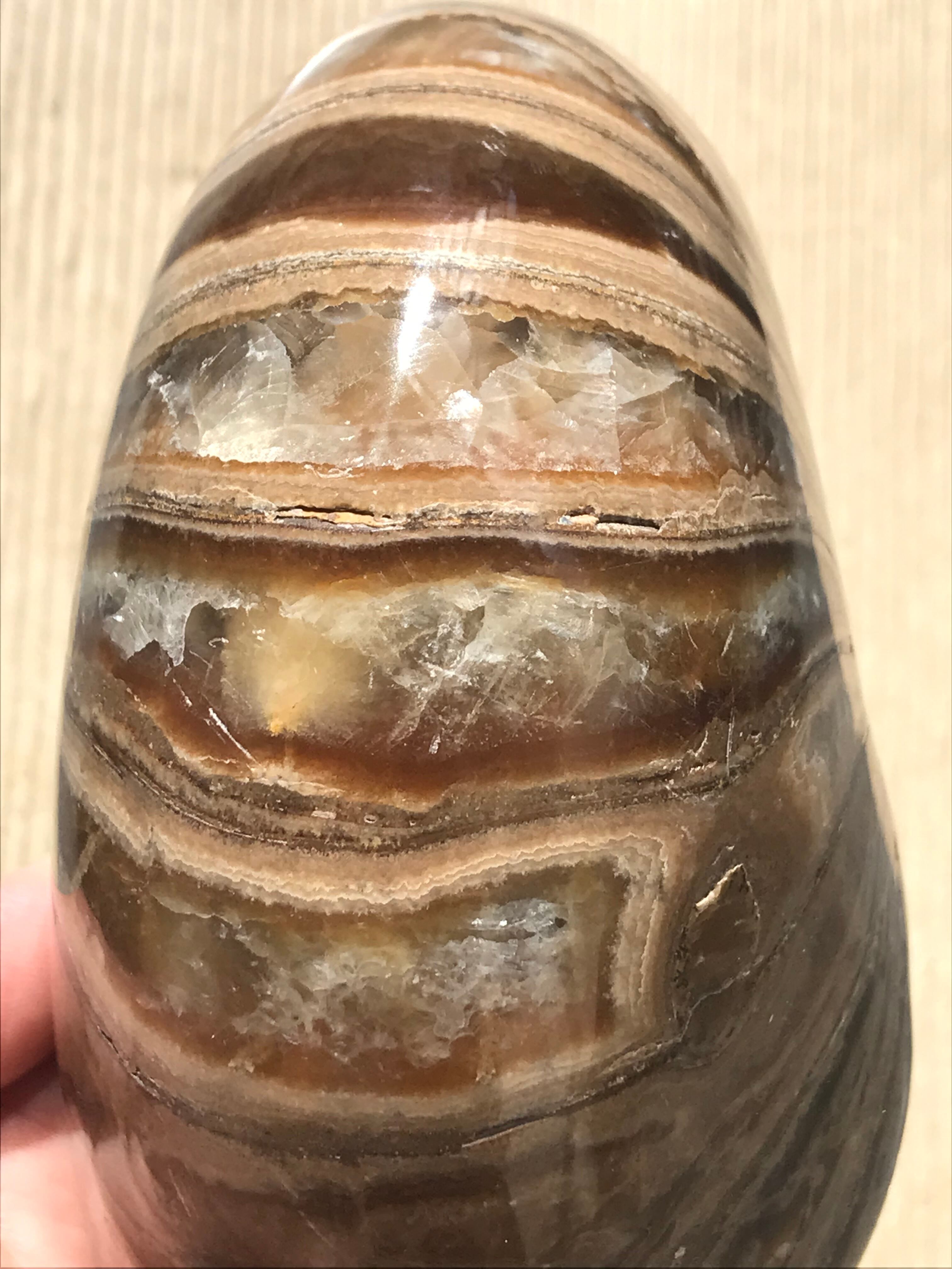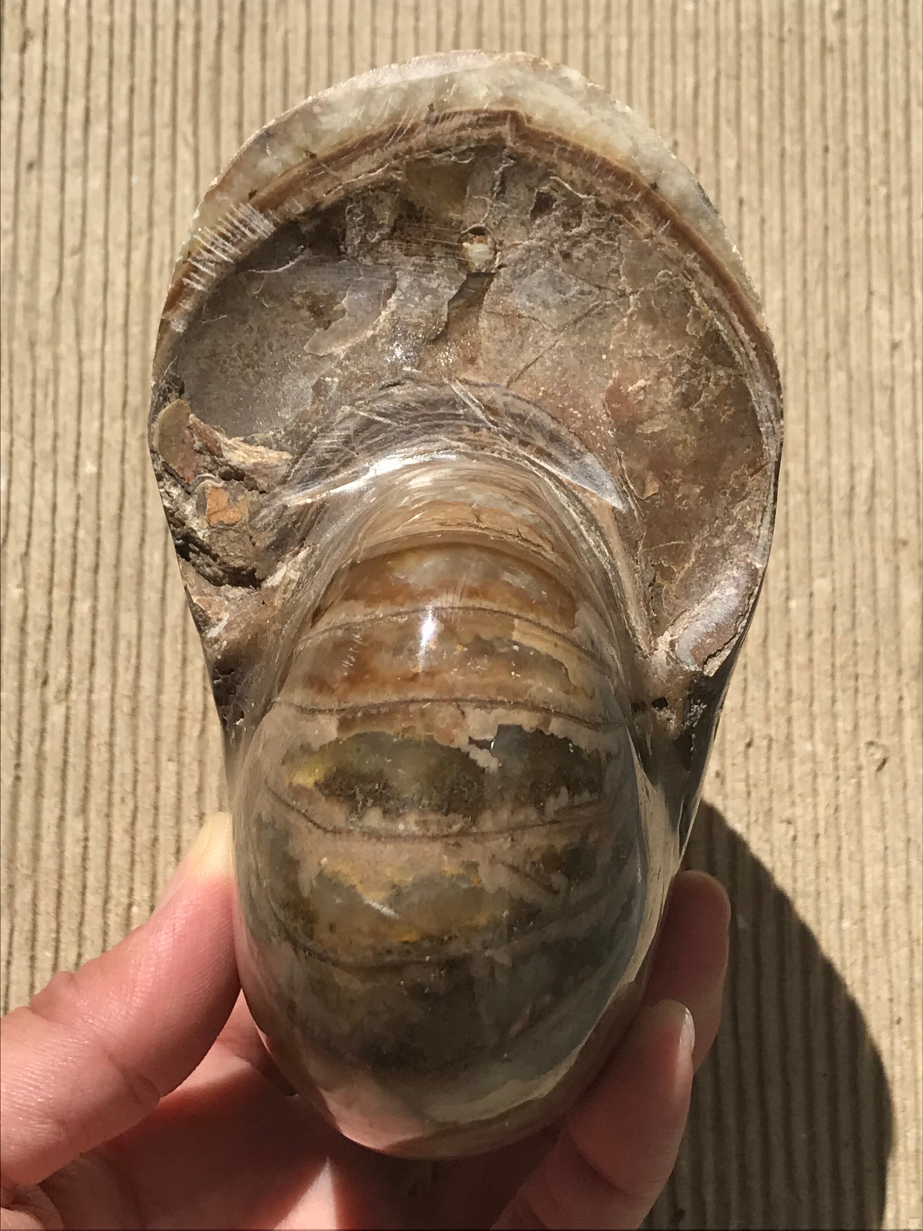 ■マダガスカル産オウムガイ(Nautilus Ammonite)は、古生代シルル紀末期(もしくは、デボン紀中期)から中生代白亜紀末までのおよそ3億5,000万年前後の間を、海洋に広く分布し繁栄した、頭足類の分類群の一つと言われています。全ての種が平らな巻き貝の形をした殻を持っているのが特徴です。 本化石はマダガスカルにて採取され、採鉱職人によって1個ずつ丁寧に研磨加工されています。化石コレクターの方、オパール化アンモナイト(Nacre)とは異なる化石はいかがでしょうか。