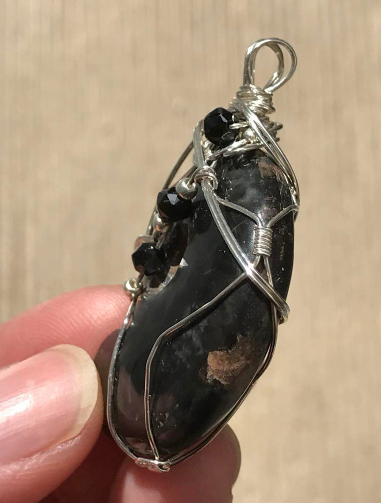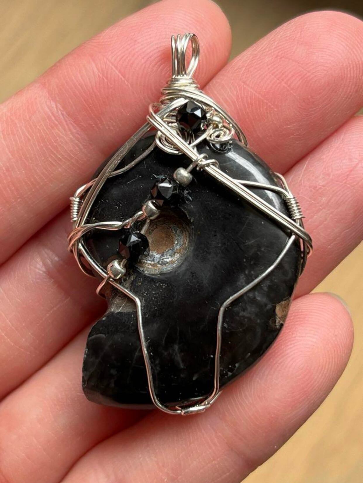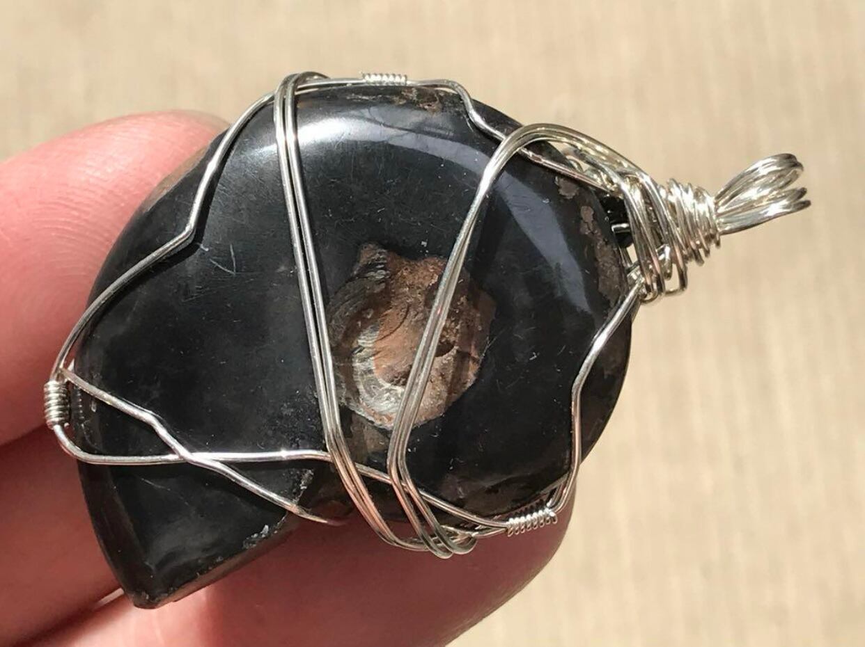 ⭐︎ブラックアンモナイト化石をペンダントトップに加工した商品になります。シルバーのワイヤーで囲みアンモナイト化石が落ちないようにしていますが、アンモナイト化石が隠れすぎないように工夫されています。天然石のアクセントが女性らしさを醸し出しています。コレクションやプレゼント等にいかがでしょうか。状態は写真にてご確認ください。
