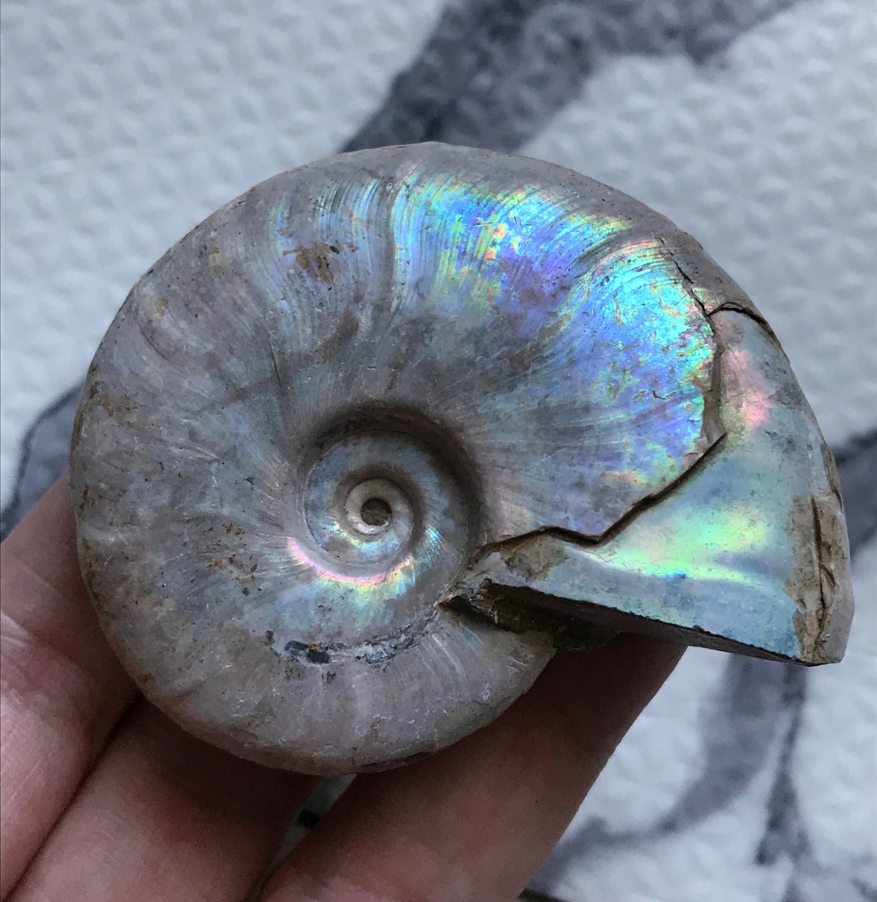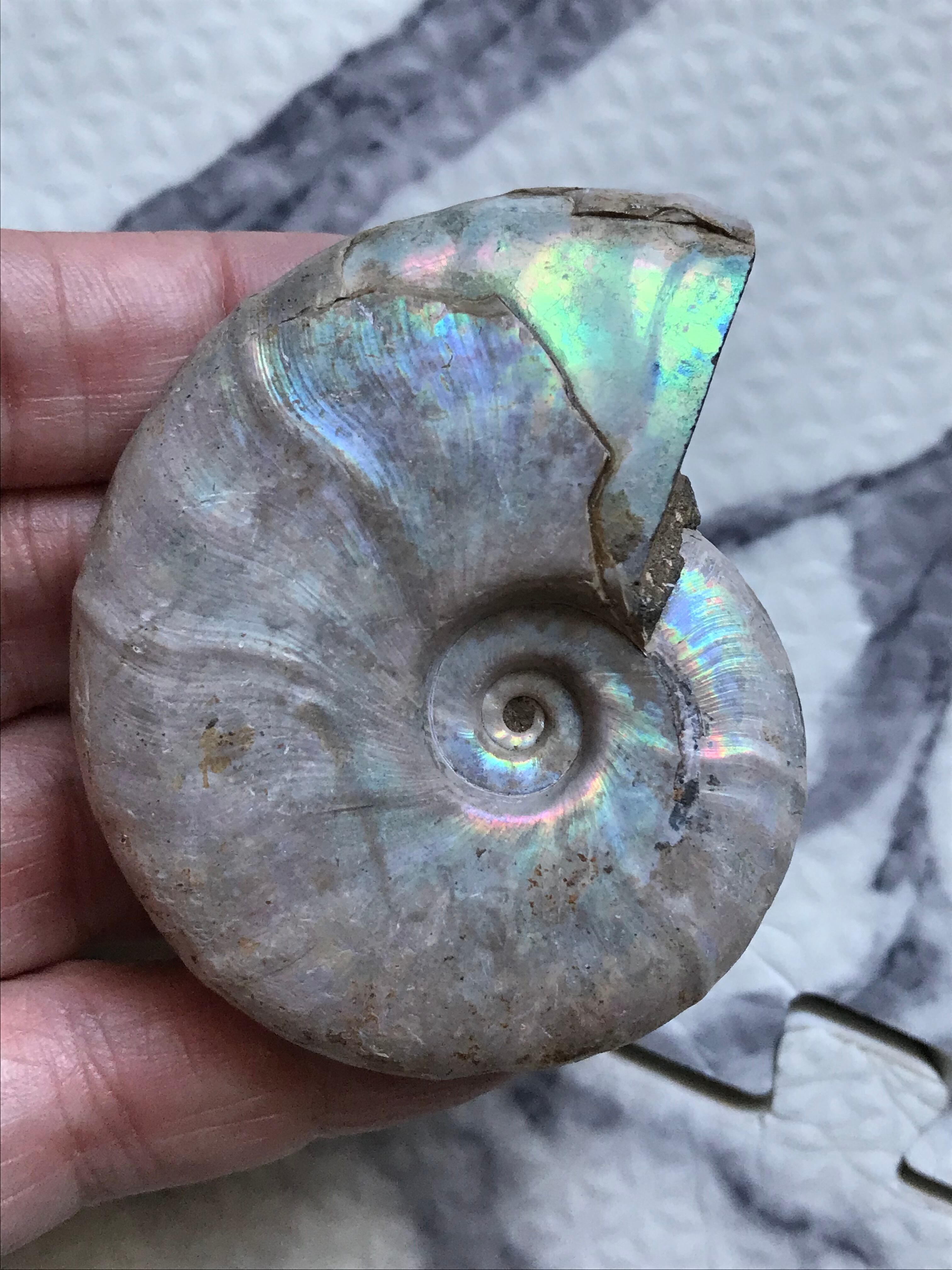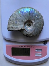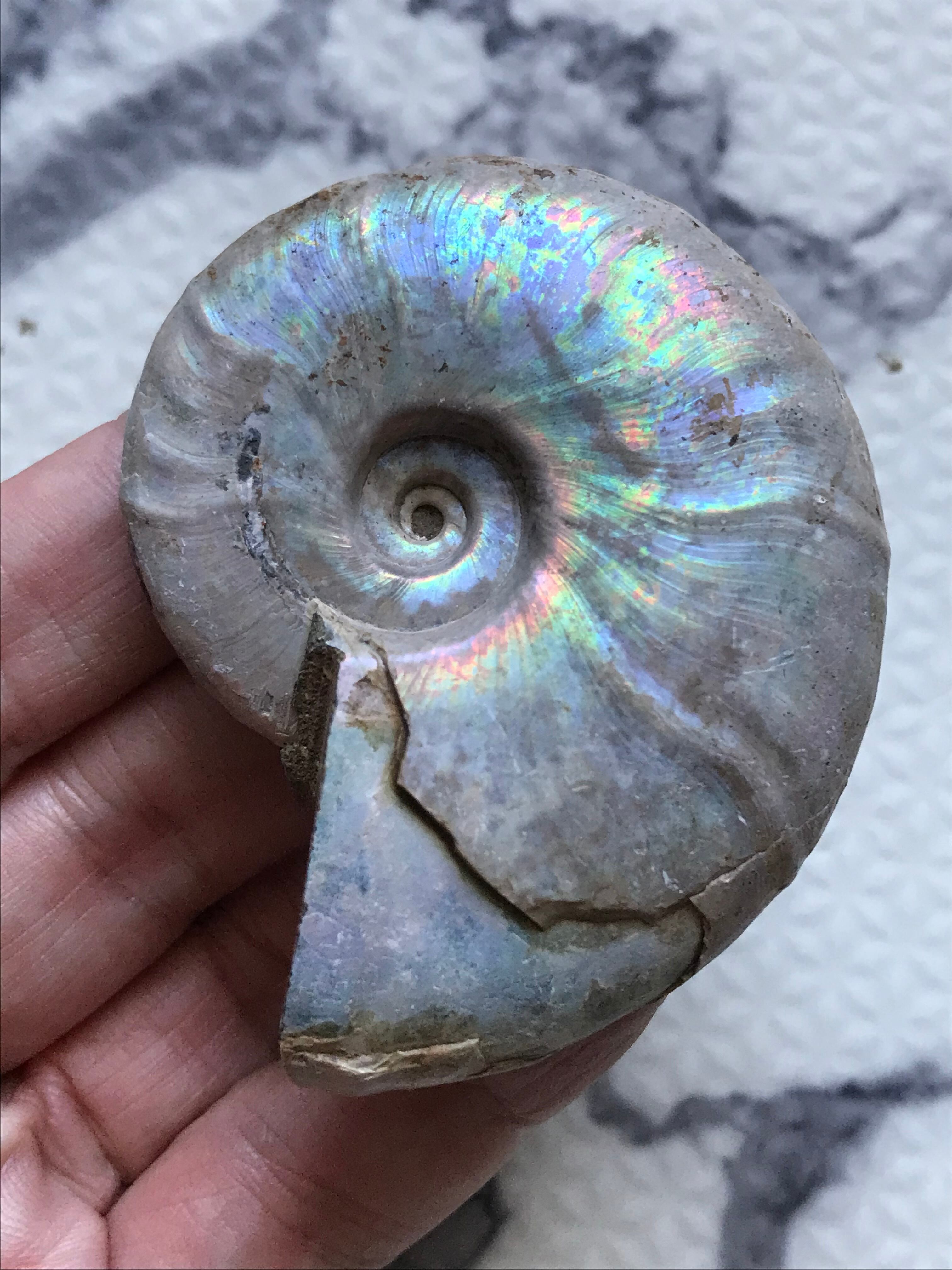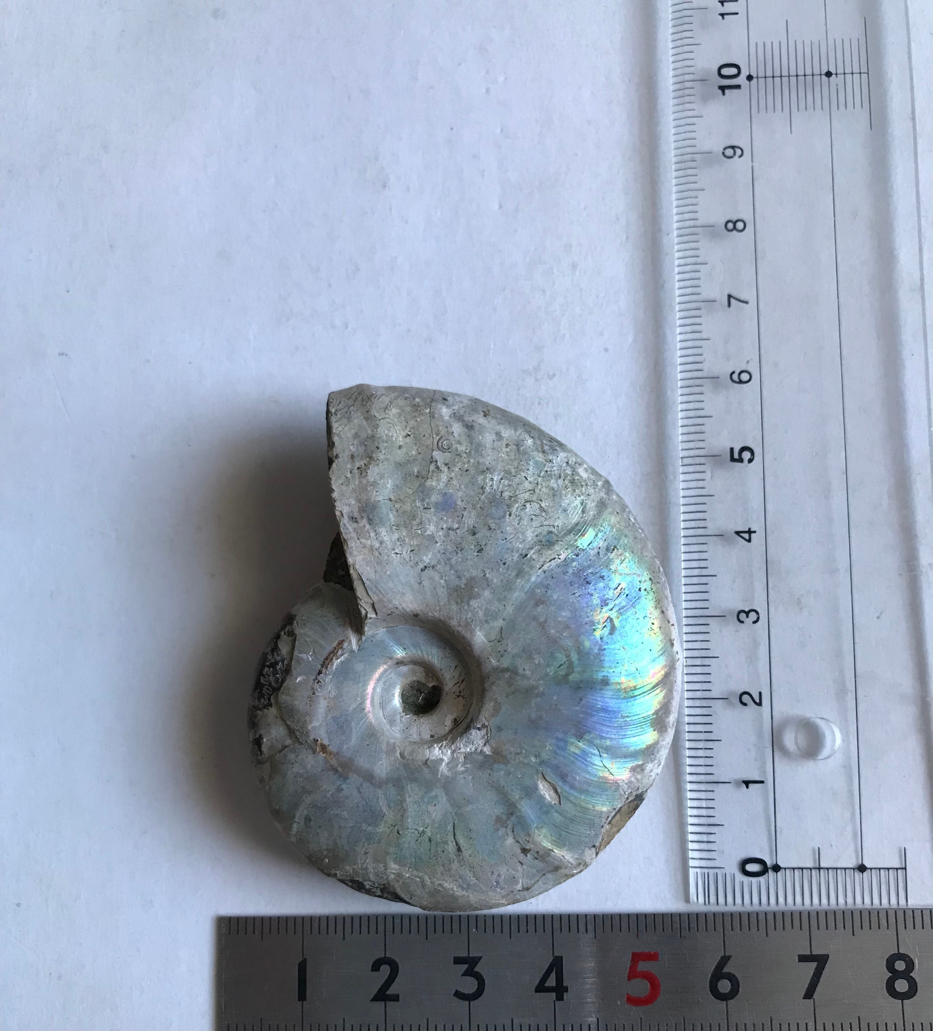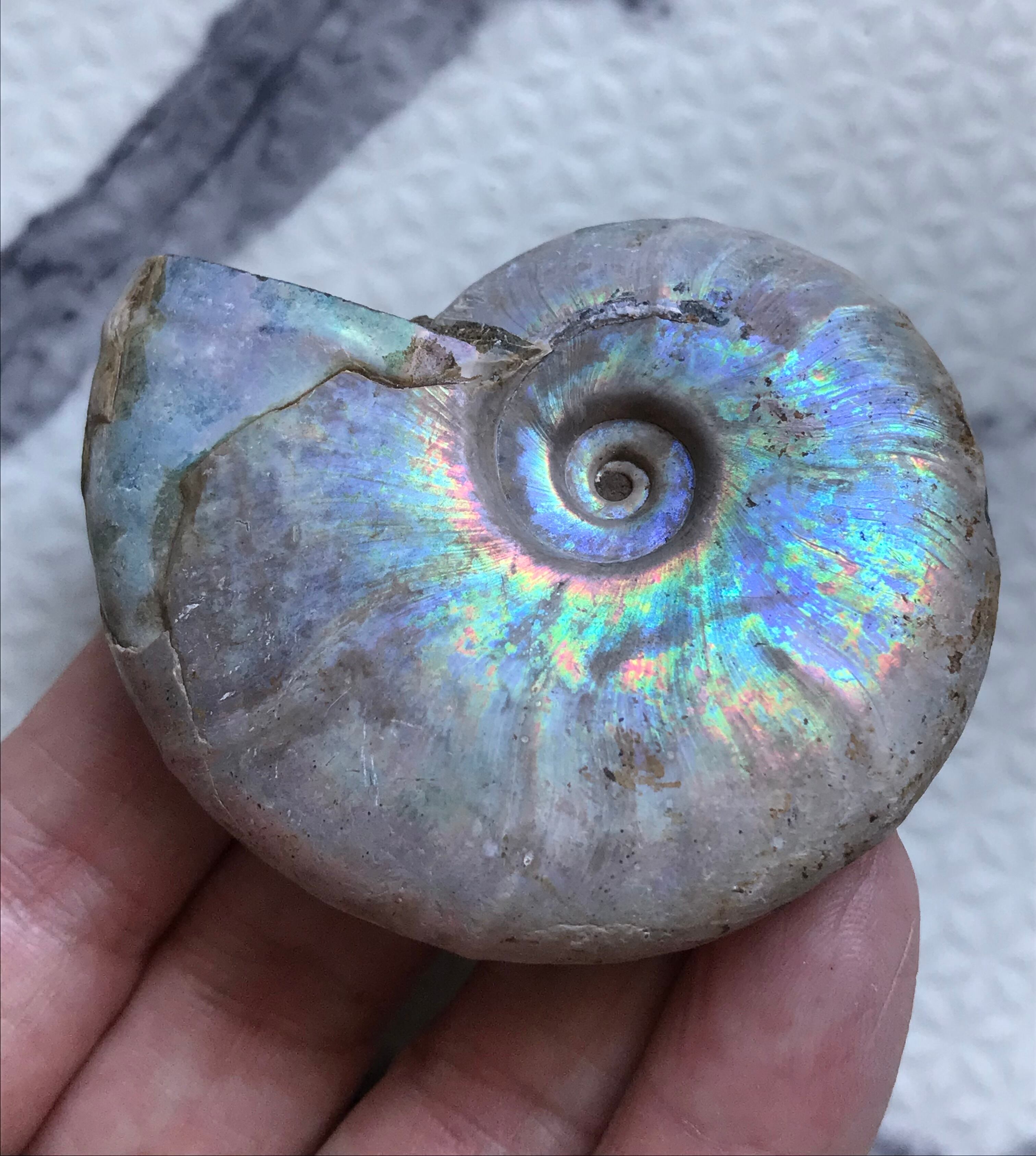 虹色の遊色効果があるアンモナイトです。殻表面が日光や照明にあたる角度によって青、緑、紫、ピンク等に輝き飽きがきません。カラフルな色彩の個体をお探しの方や、プレゼントとしての化石をお考えの方はこの機会にいかがでしょうか。