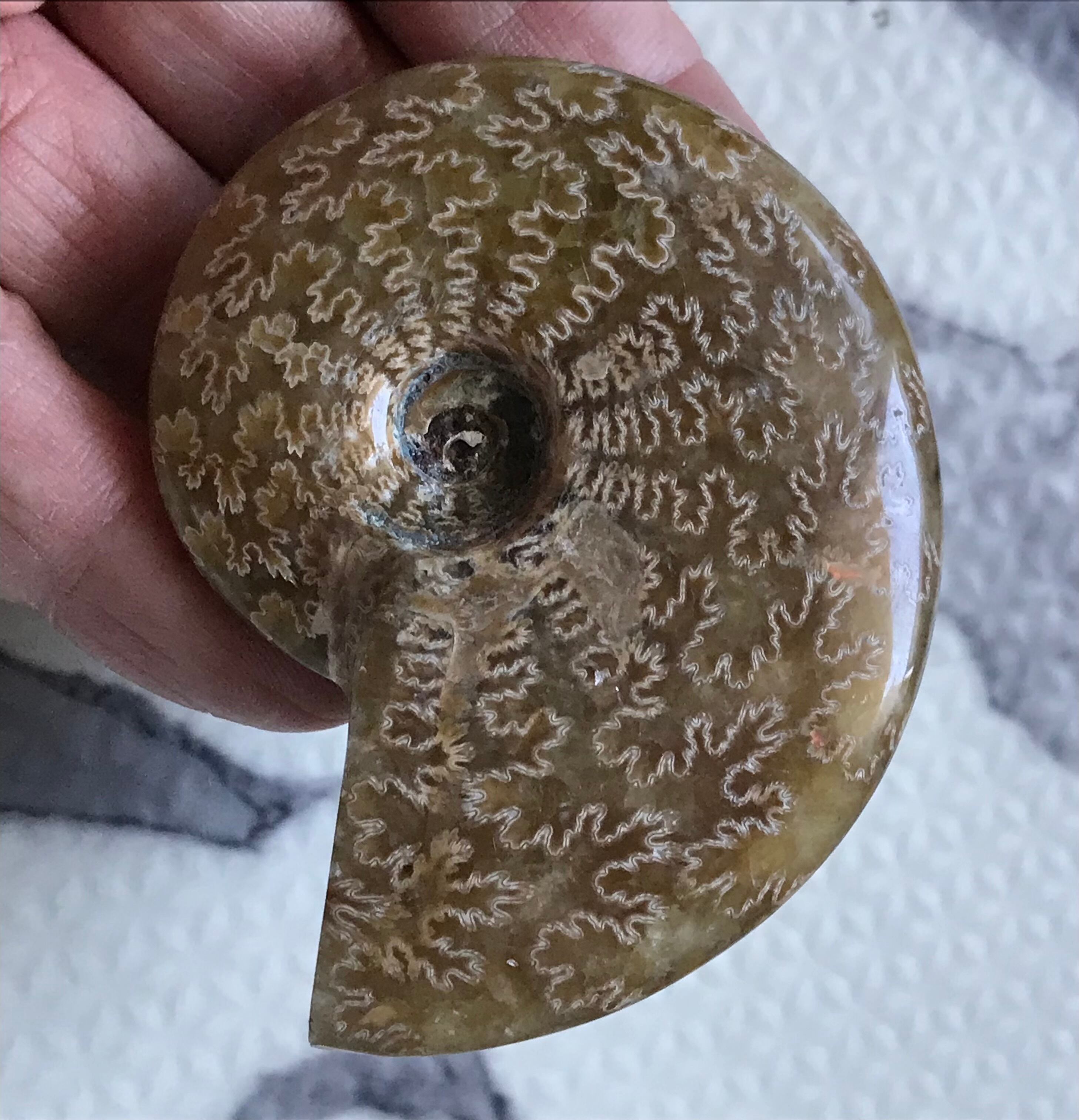 遠方の国マダガスカルから友人を通じて到着した縫合線が現れたアンモナイトになります。ご存知のとおり、アンモナイトは一つ一つが個性をもち、表情が異なりますので、コレクションにいかがでしょうか。