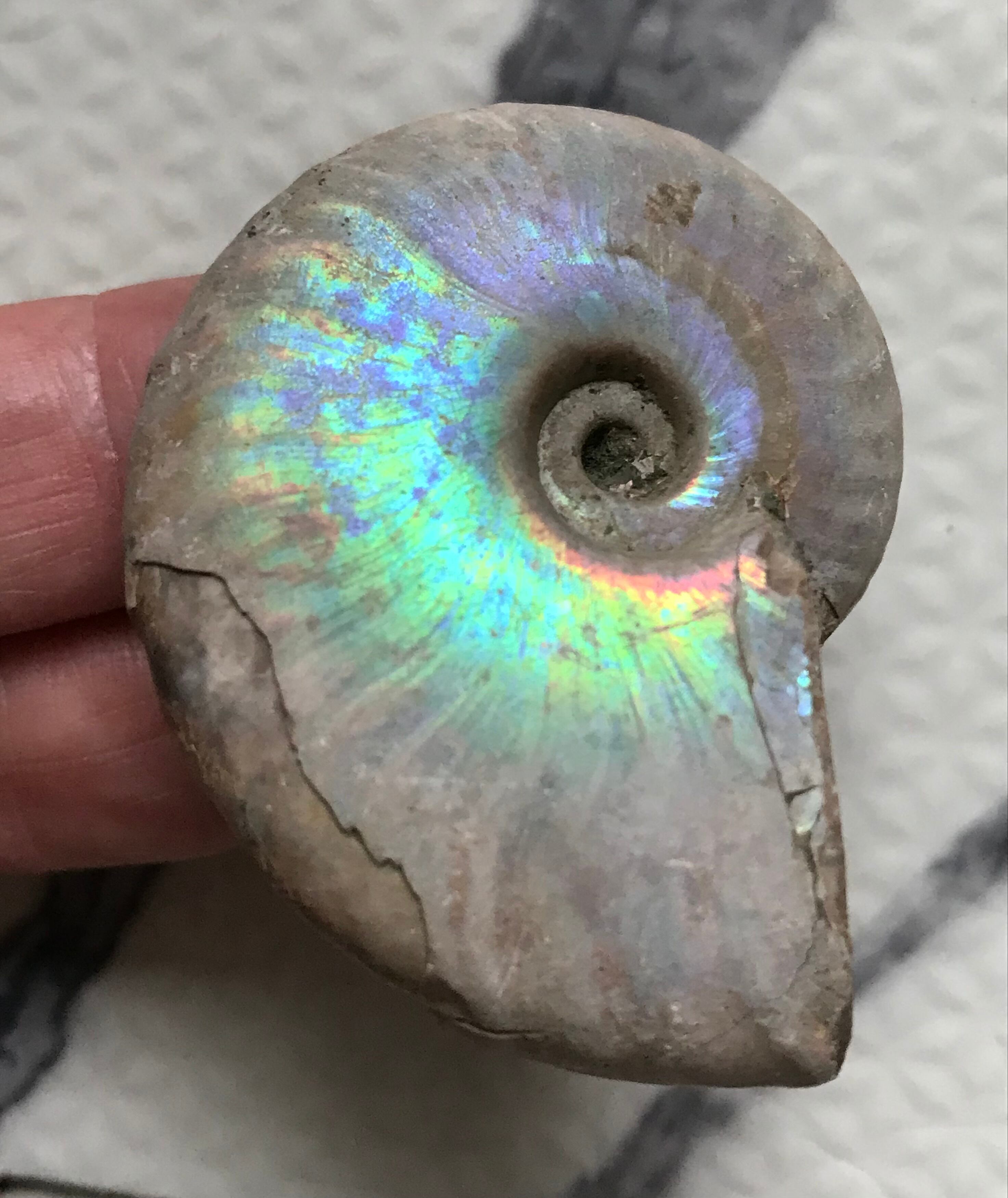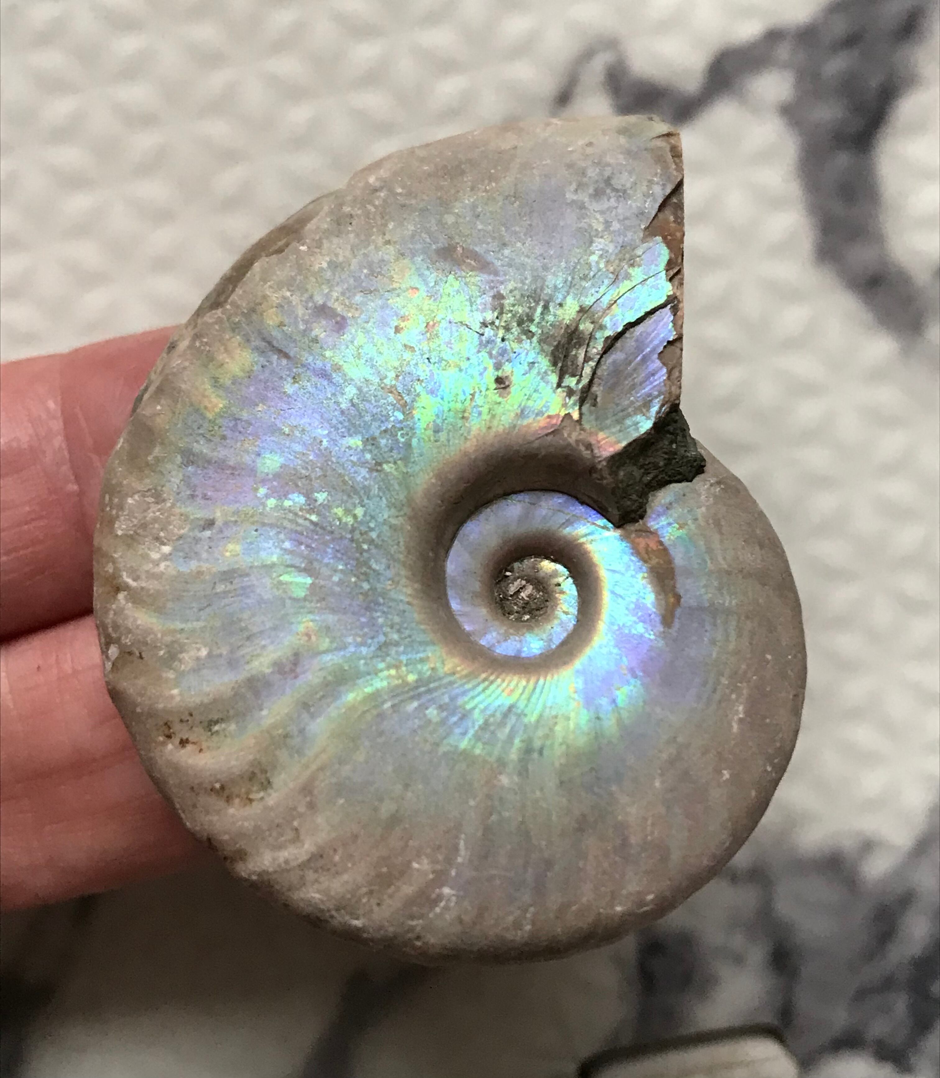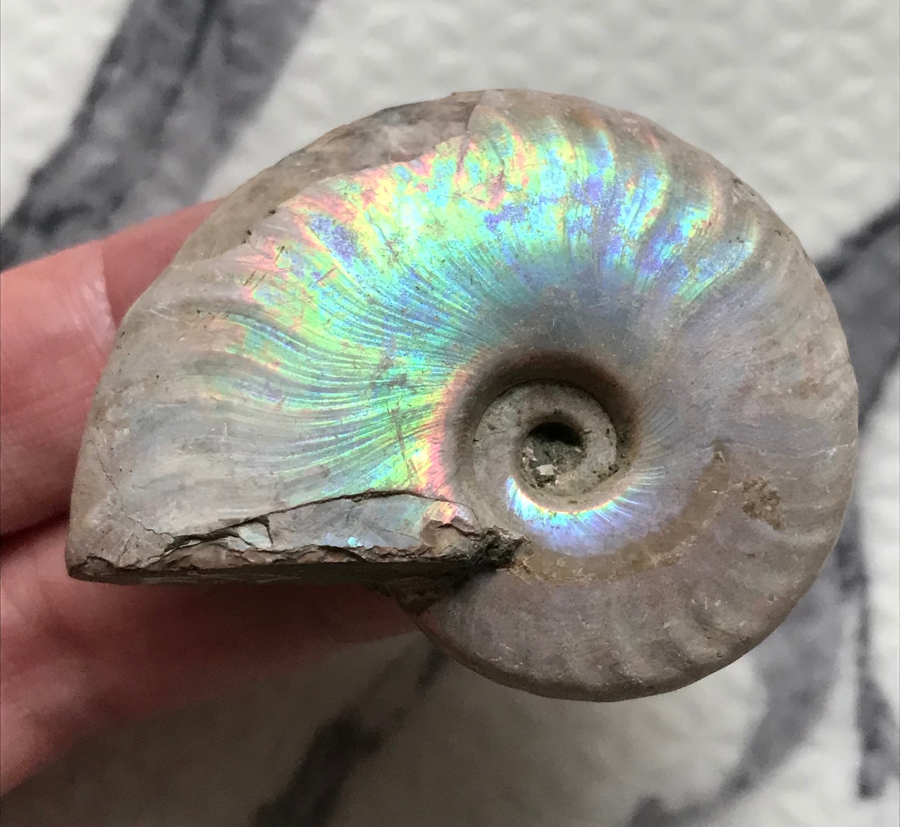 虹色の遊色効果があるアンモナイトです。殻表面が日光や照明にあたる角度によって青、緑、紫、ピンク等に輝き飽きがきません。カラフルな色彩の個体をお探しの方や、プレゼントとしての化石をお考えの方はこの機会にいかがでしょうか。