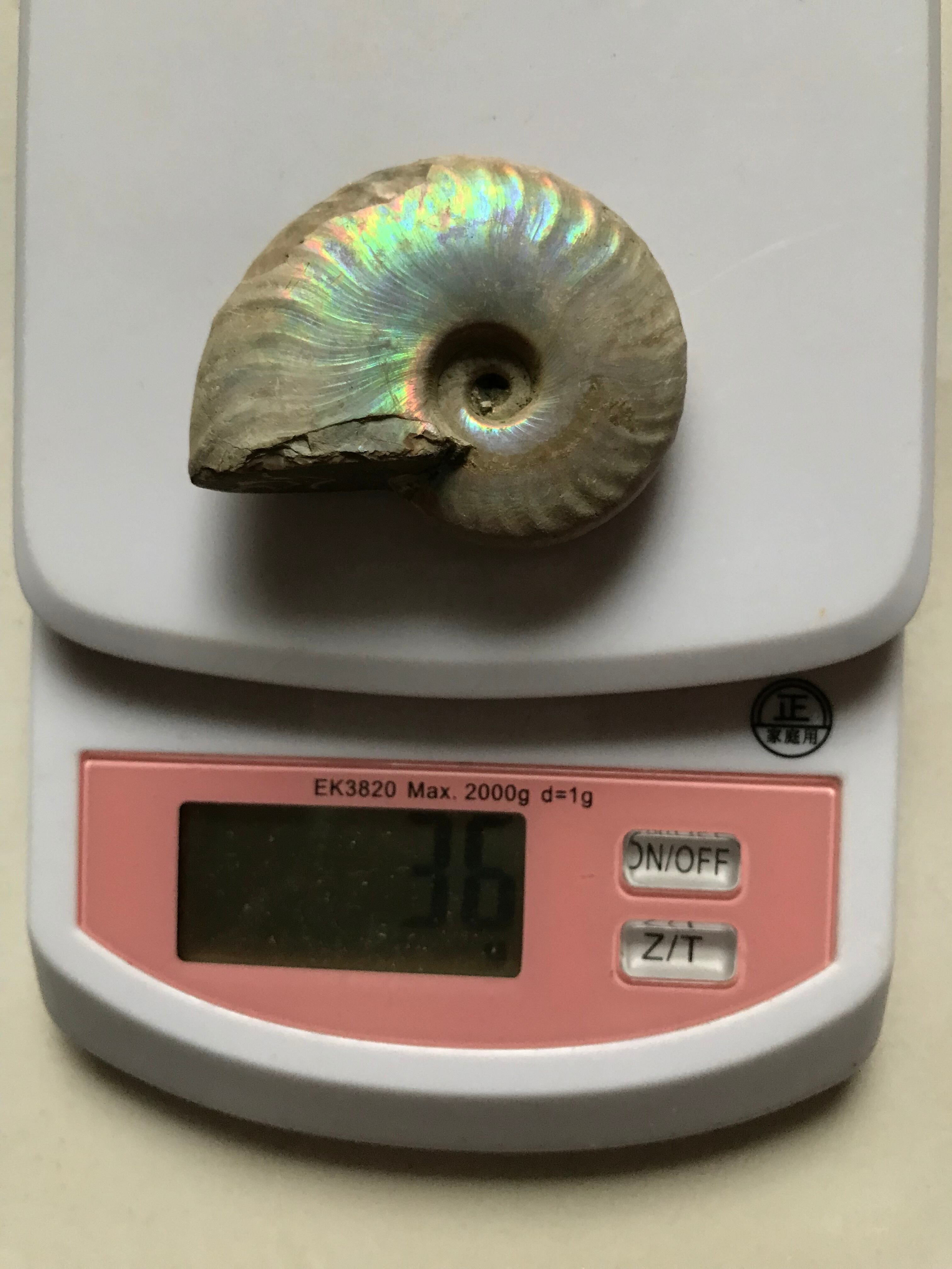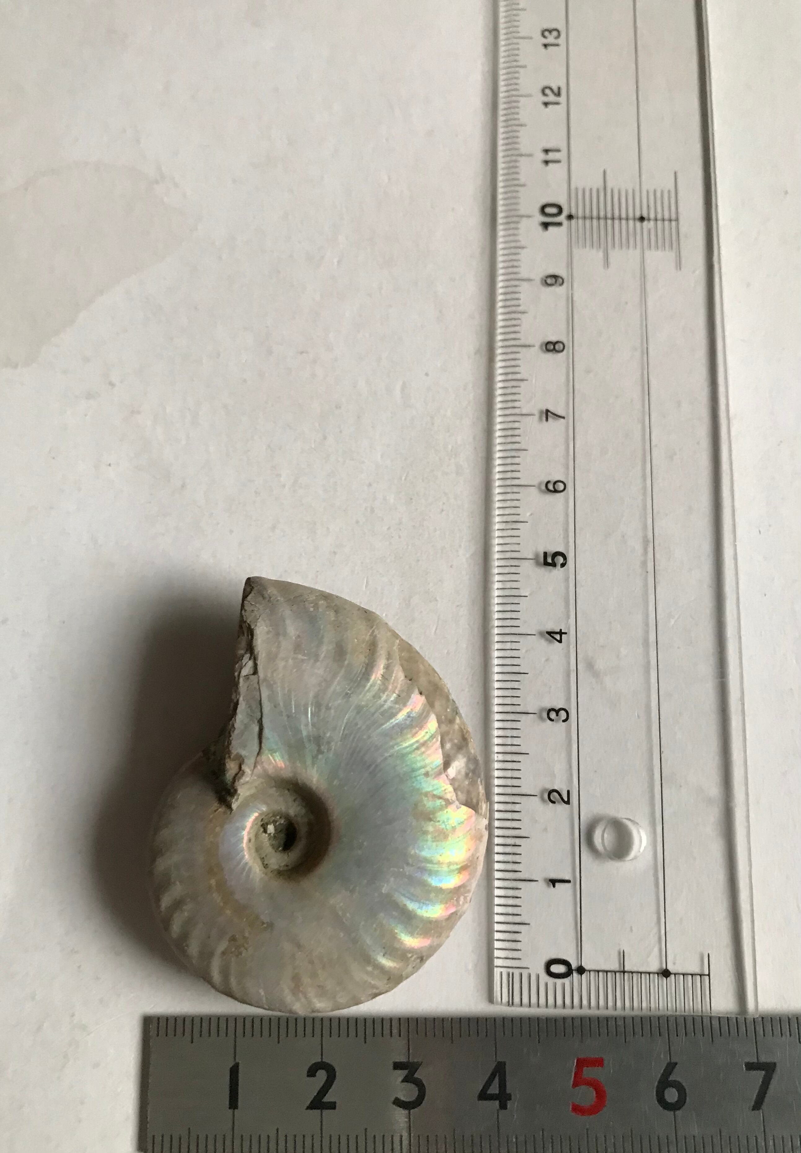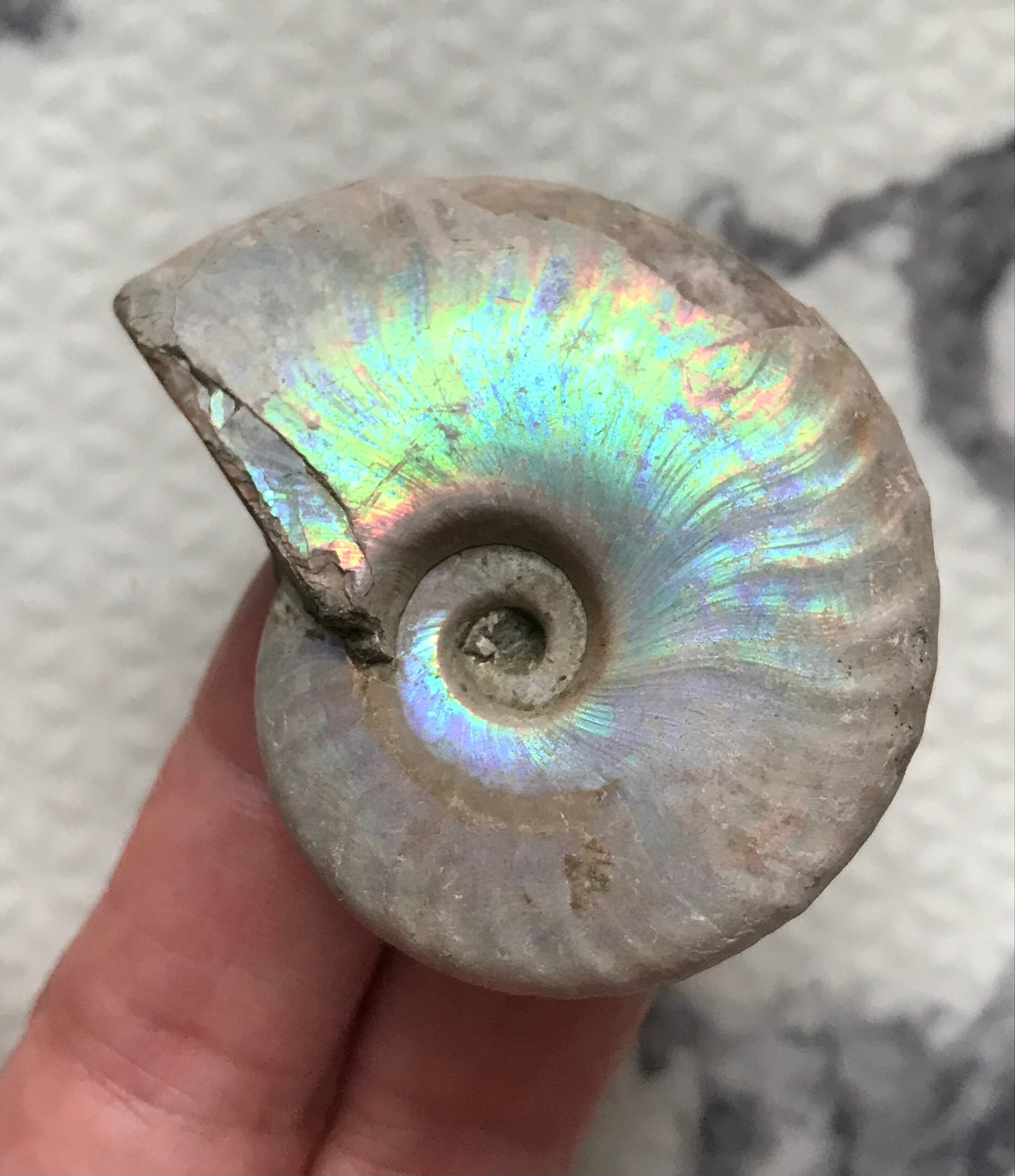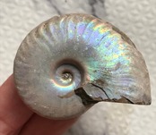 虹色の遊色効果があるアンモナイトです。殻表面が日光や照明にあたる角度によって青、緑、紫、ピンク等に輝き飽きがきません。カラフルな色彩の個体をお探しの方や、プレゼントとしての化石をお考えの方はこの機会にいかがでしょうか。