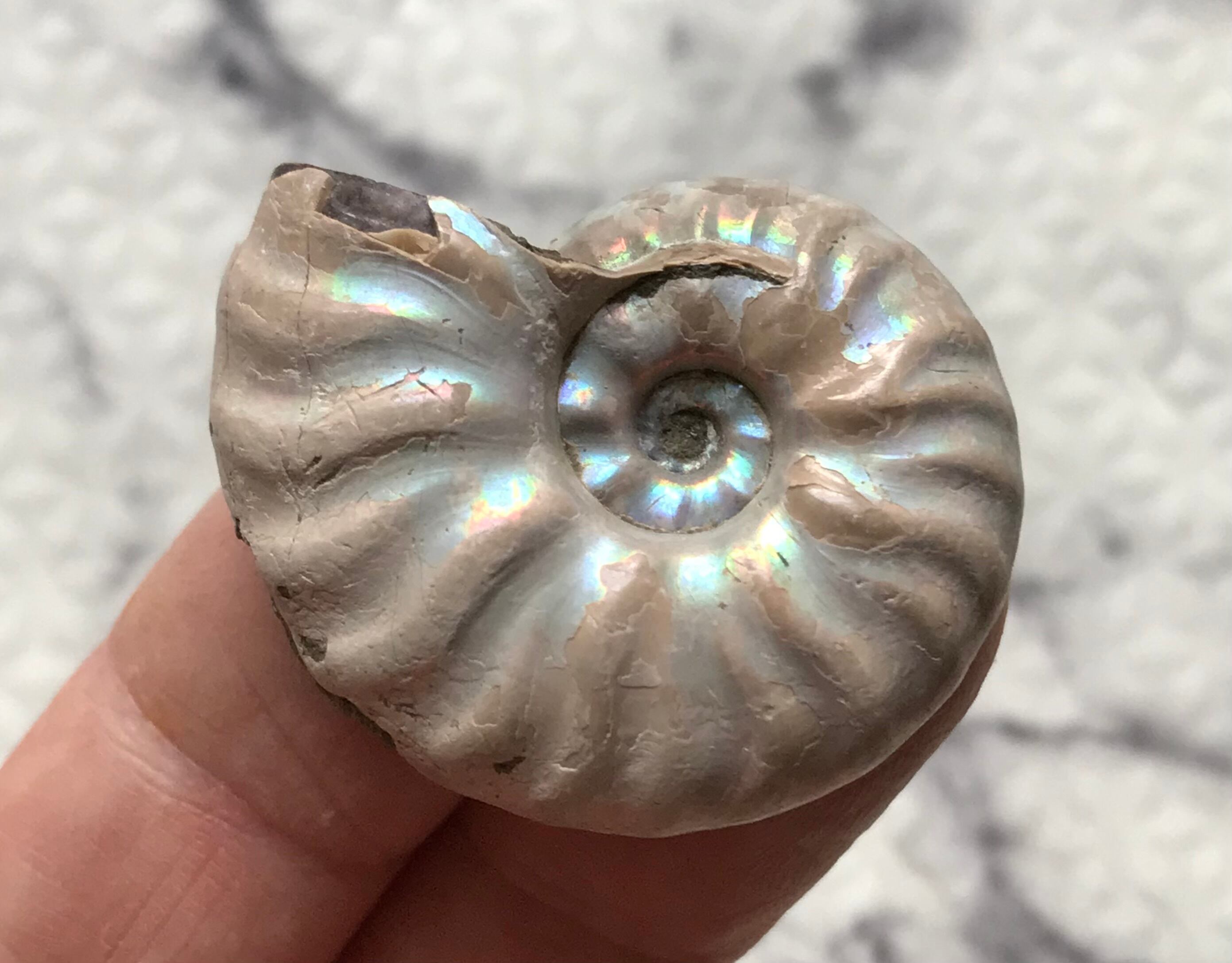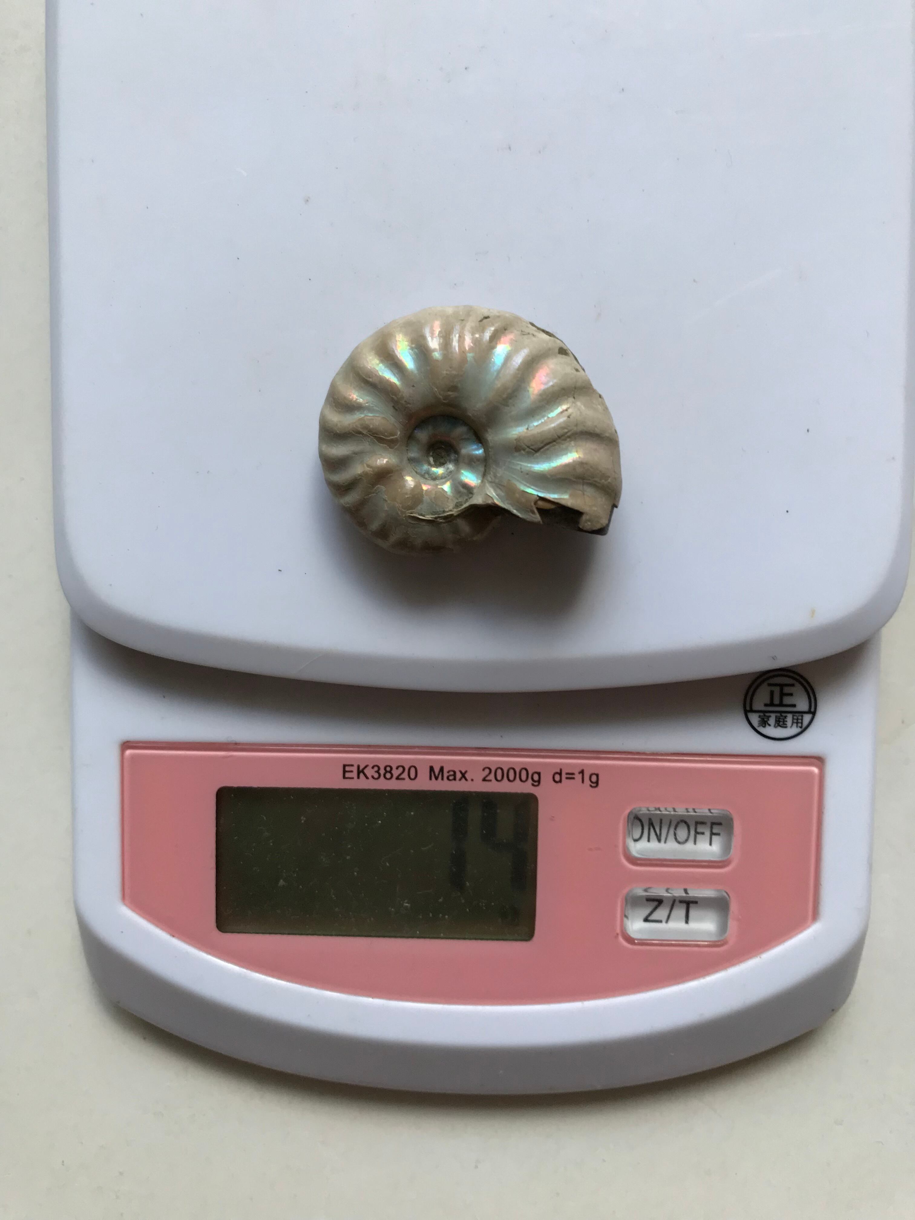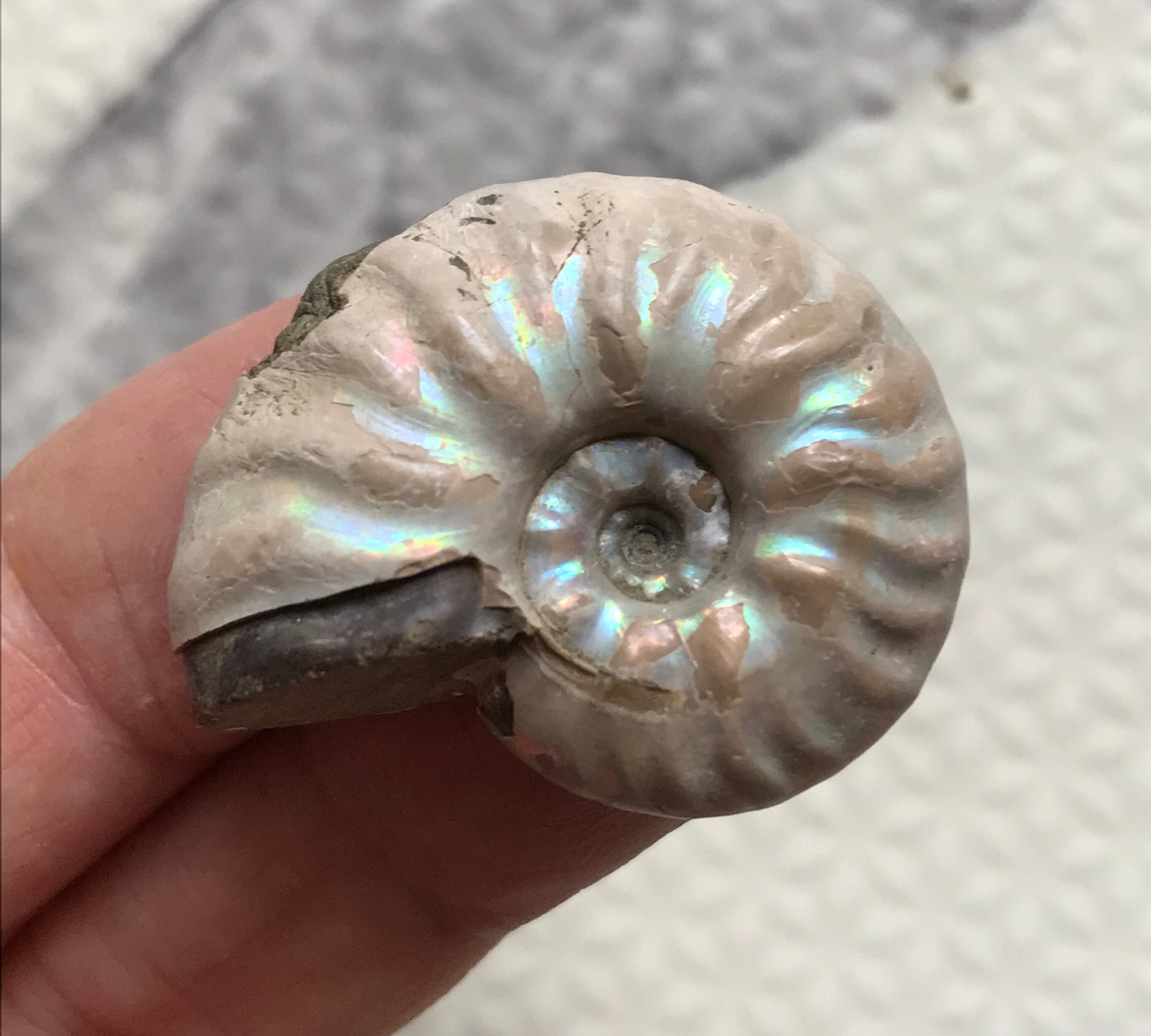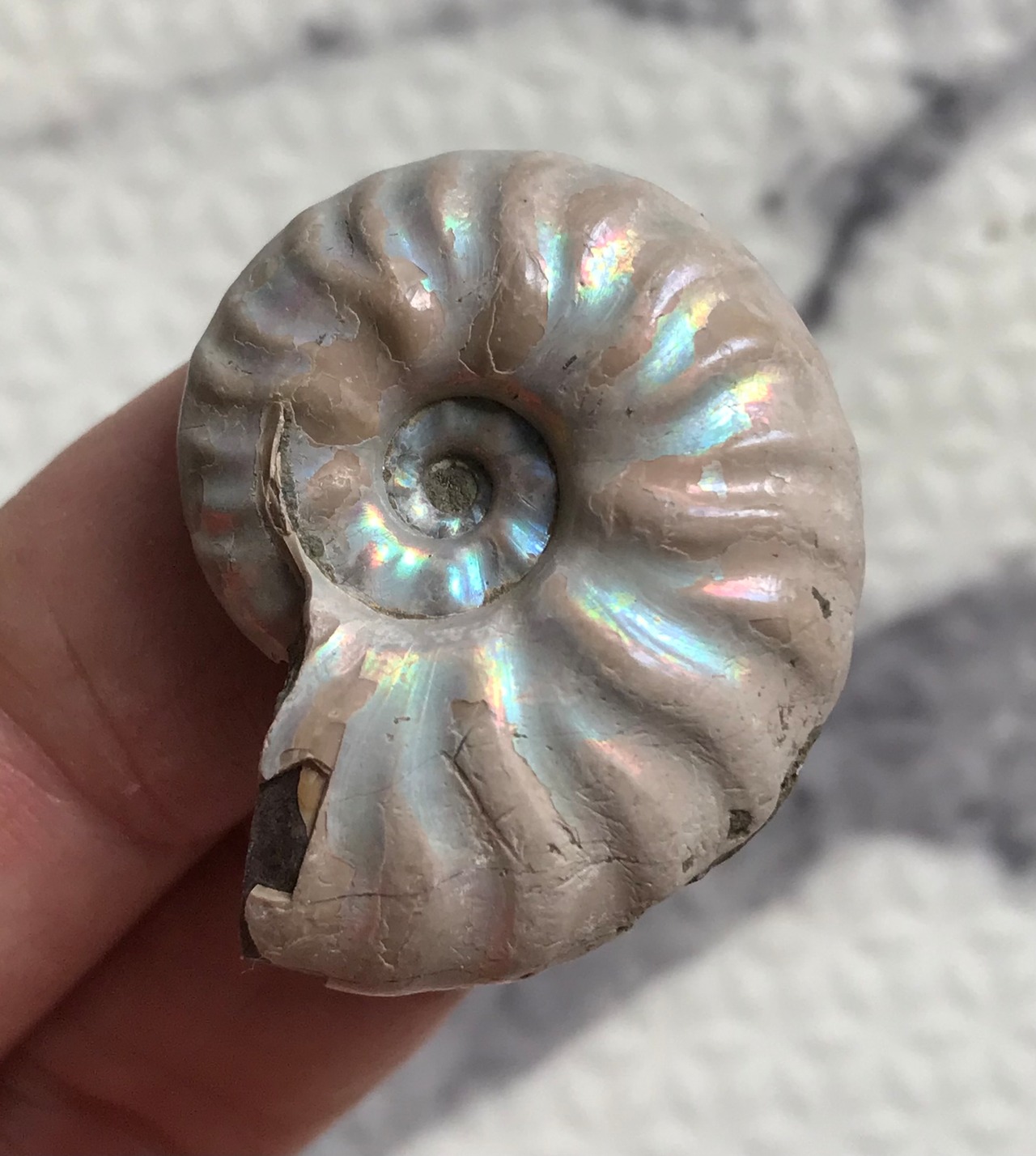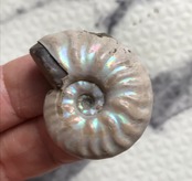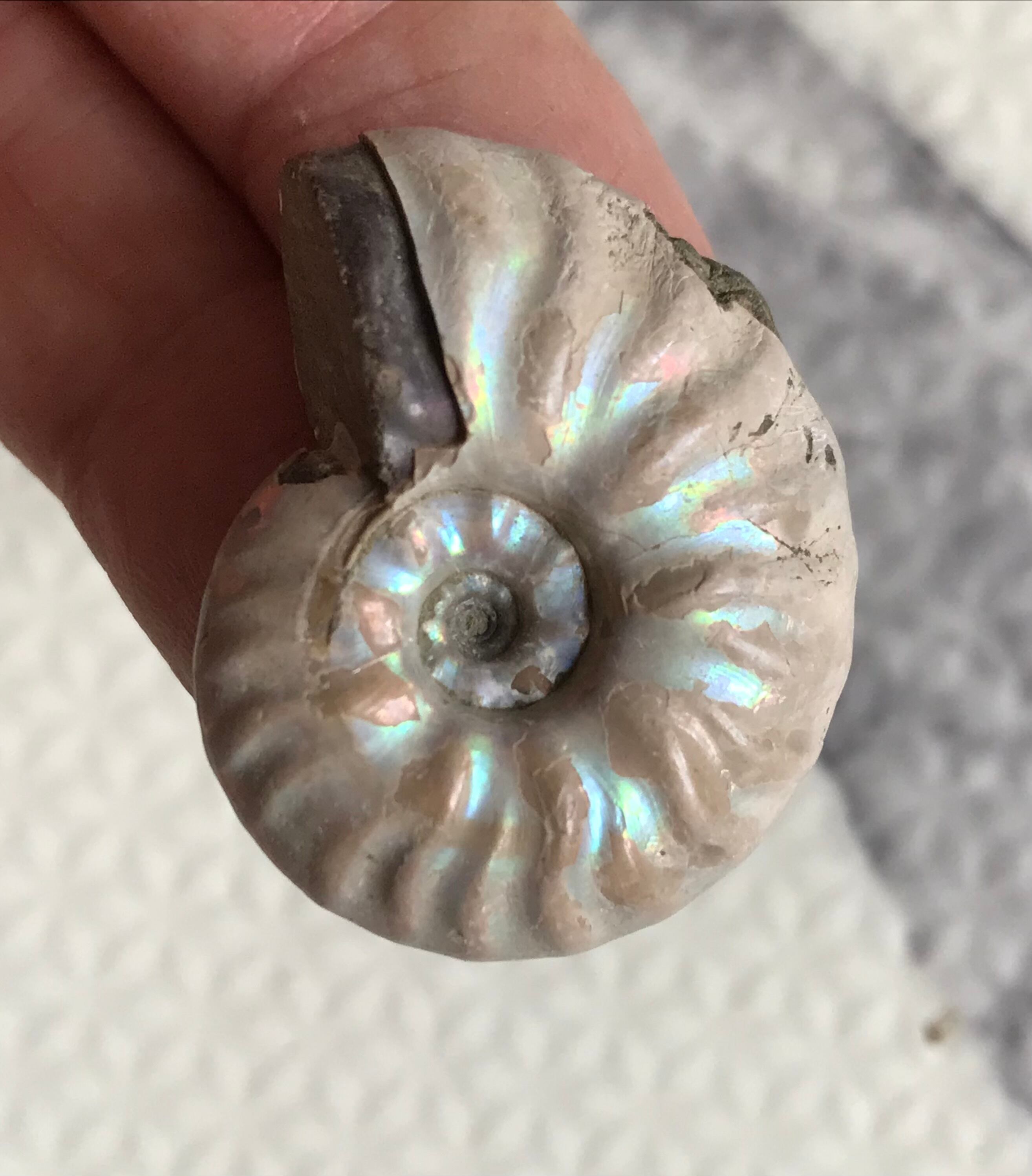 虹色の遊色効果があるアンモナイトです。殻表面が日光や照明にあたる角度によって青、緑、紫、ピンク等に輝き飽きがきません。カラフルな色彩の個体をお探しの方や、プレゼントとしての化石をお考えの方はこの機会にいかがでしょうか。