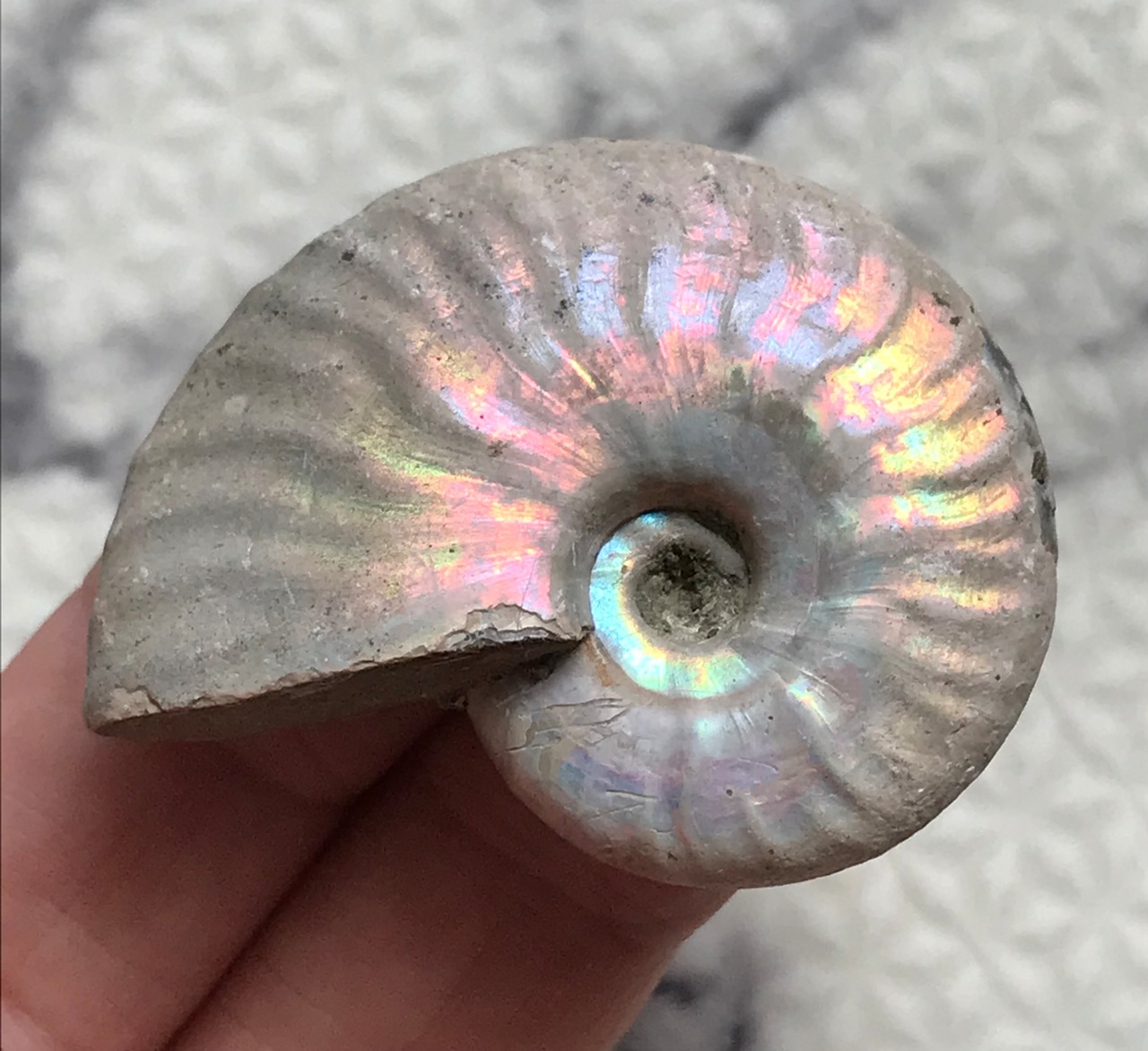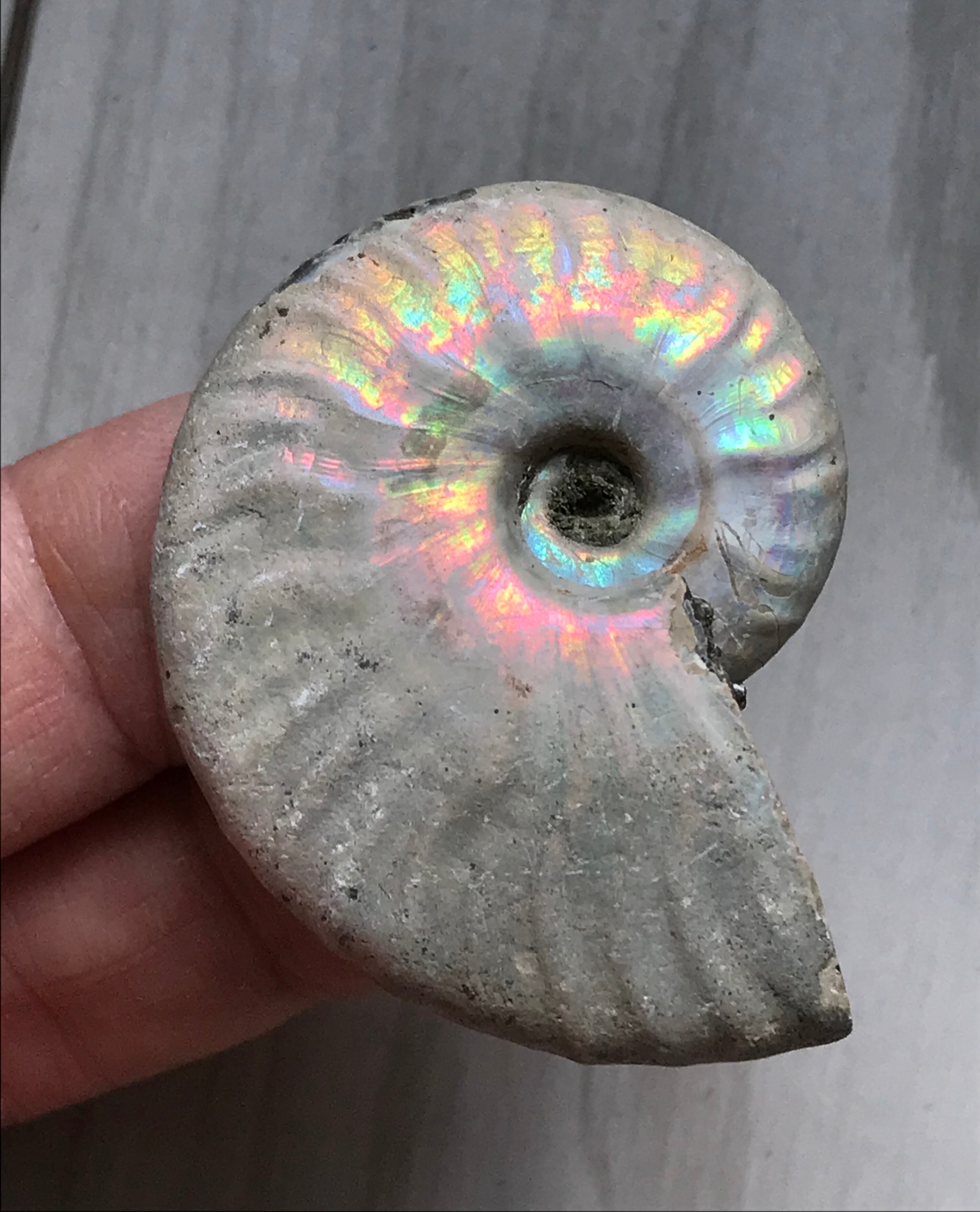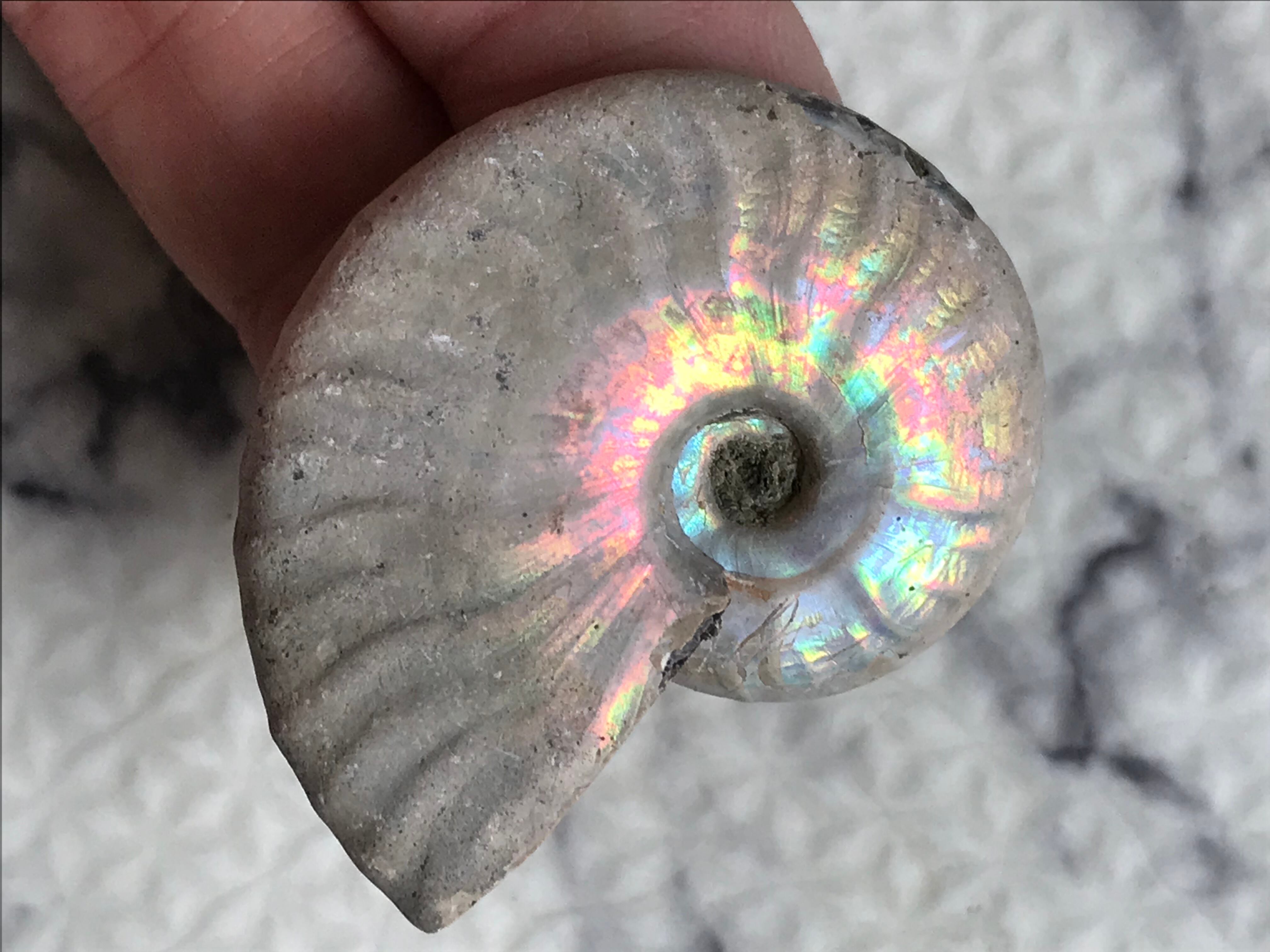 虹色の遊色効果があるアンモナイトです。殻表面が日光や照明にあたる角度によって青、緑、紫、ピンク等に輝き飽きがきません。カラフルな色彩の個体をお探しの方や、プレゼントとしての化石をお考えの方はこの機会にいかがでしょうか。