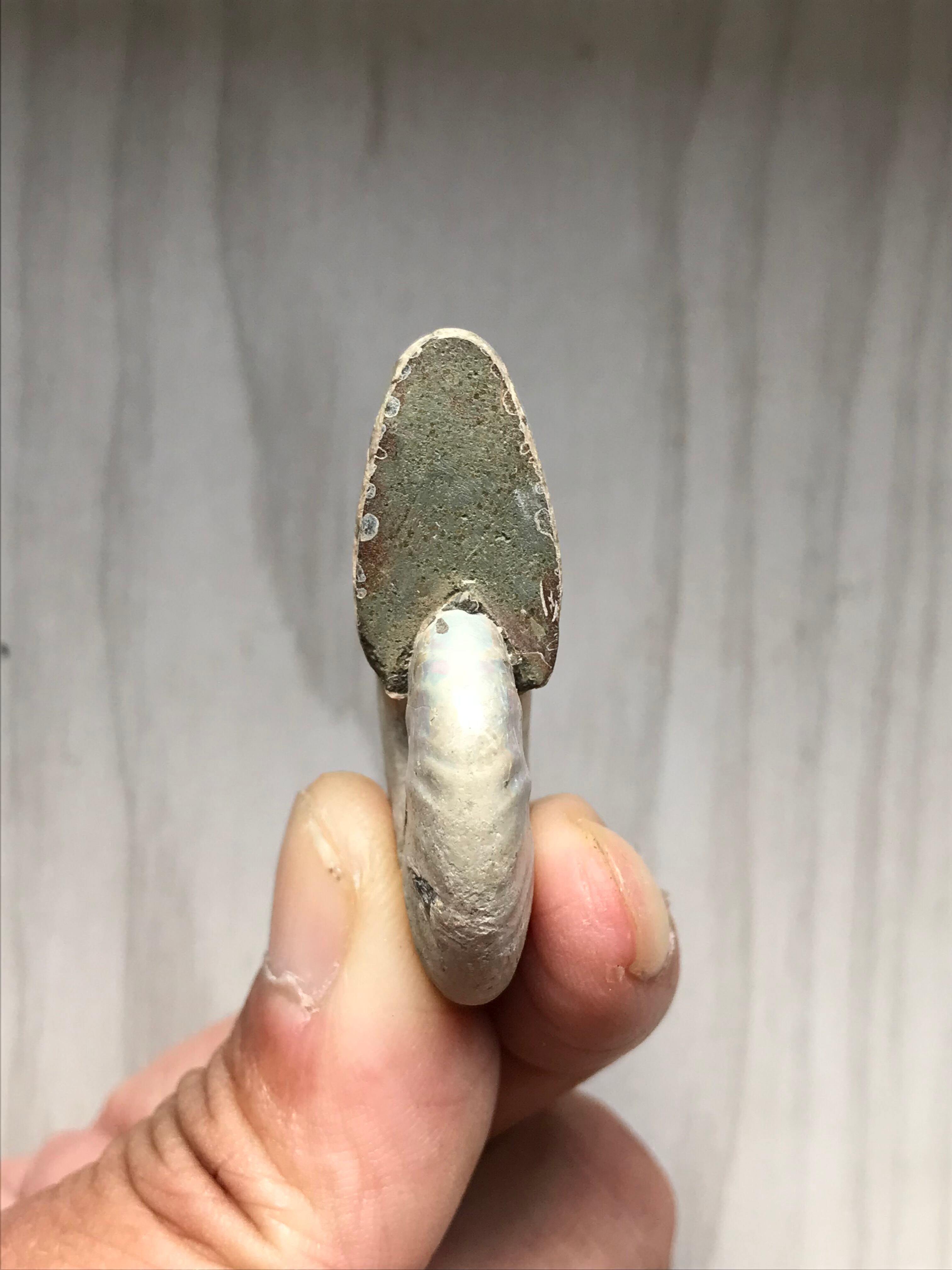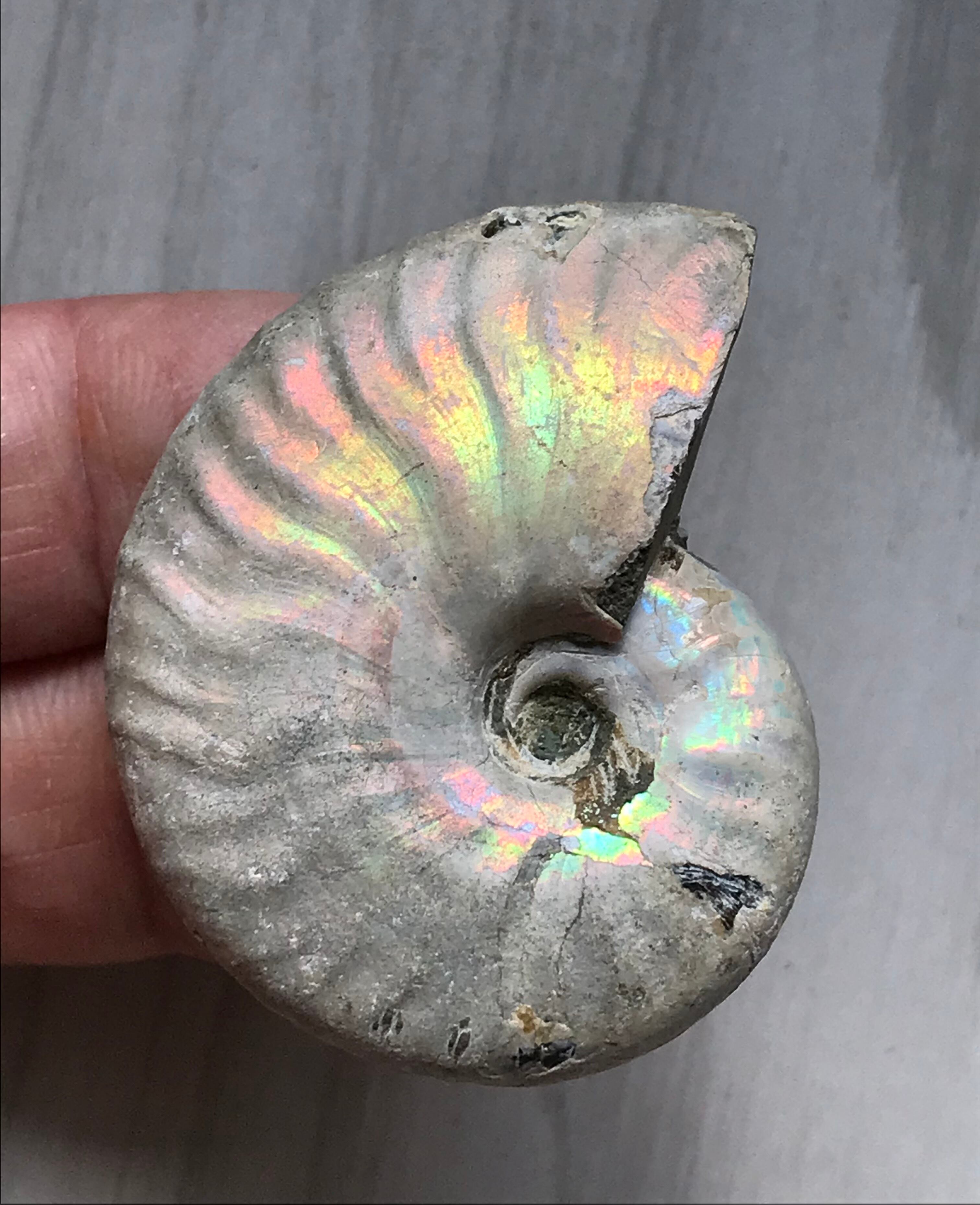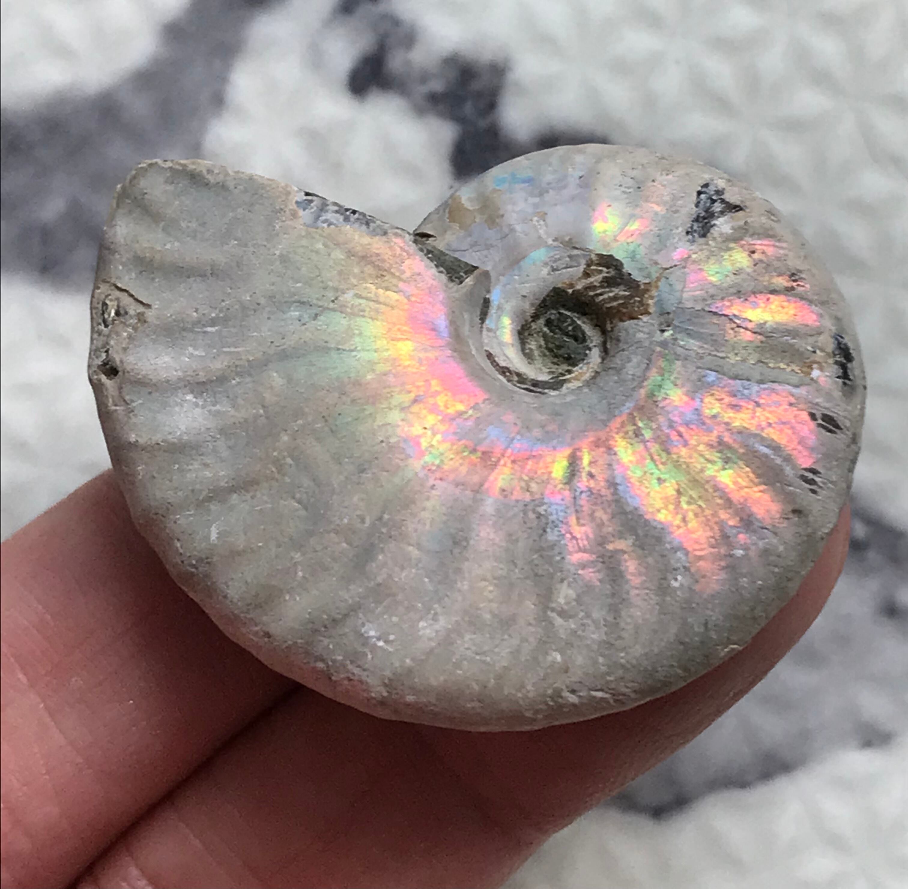 虹色の遊色効果があるアンモナイトです。殻表面が日光や照明にあたる角度によって青、緑、紫、ピンク等に輝き飽きがきません。カラフルな色彩の個体をお探しの方や、プレゼントとしての化石をお考えの方はこの機会にいかがでしょうか。