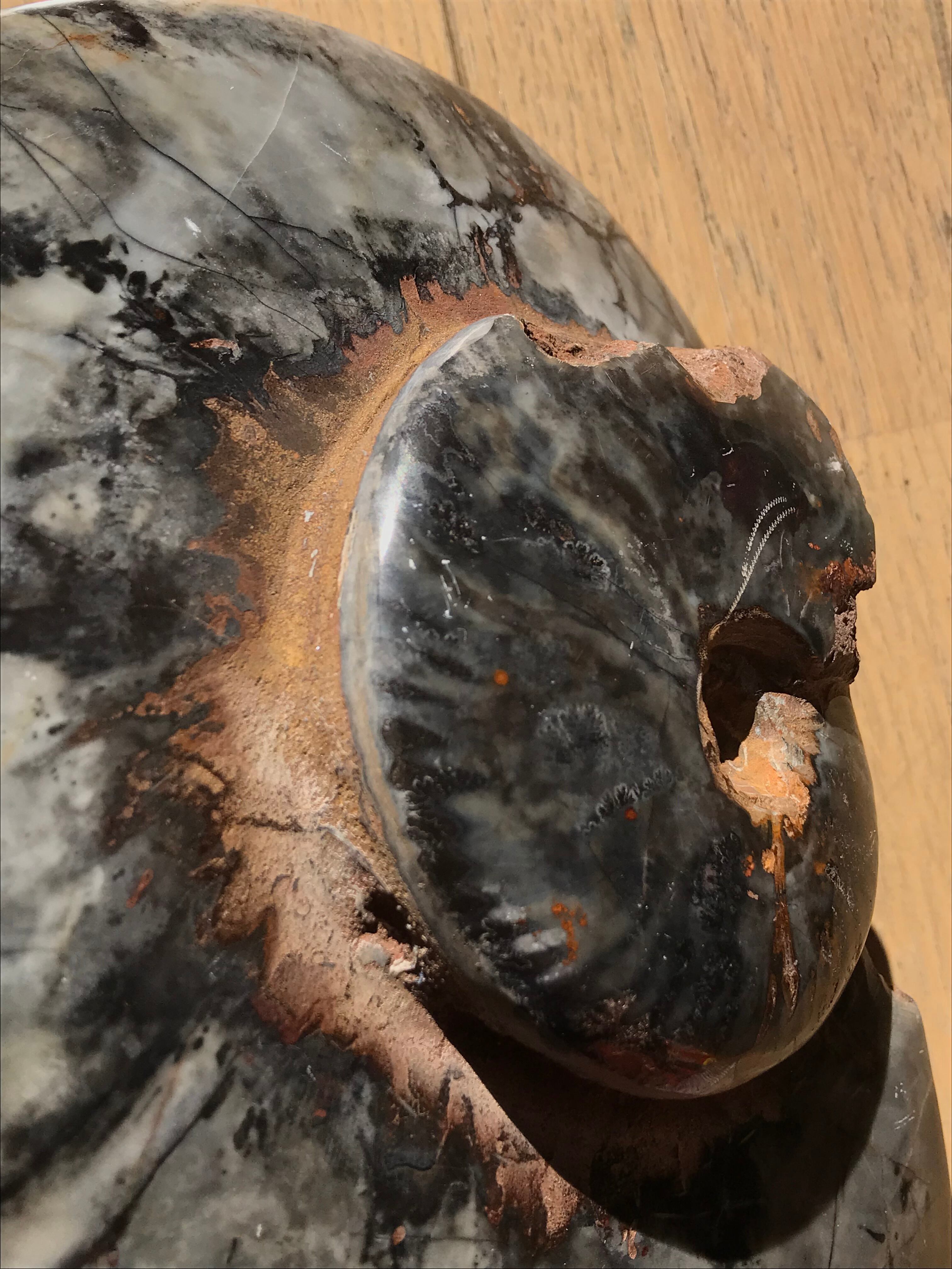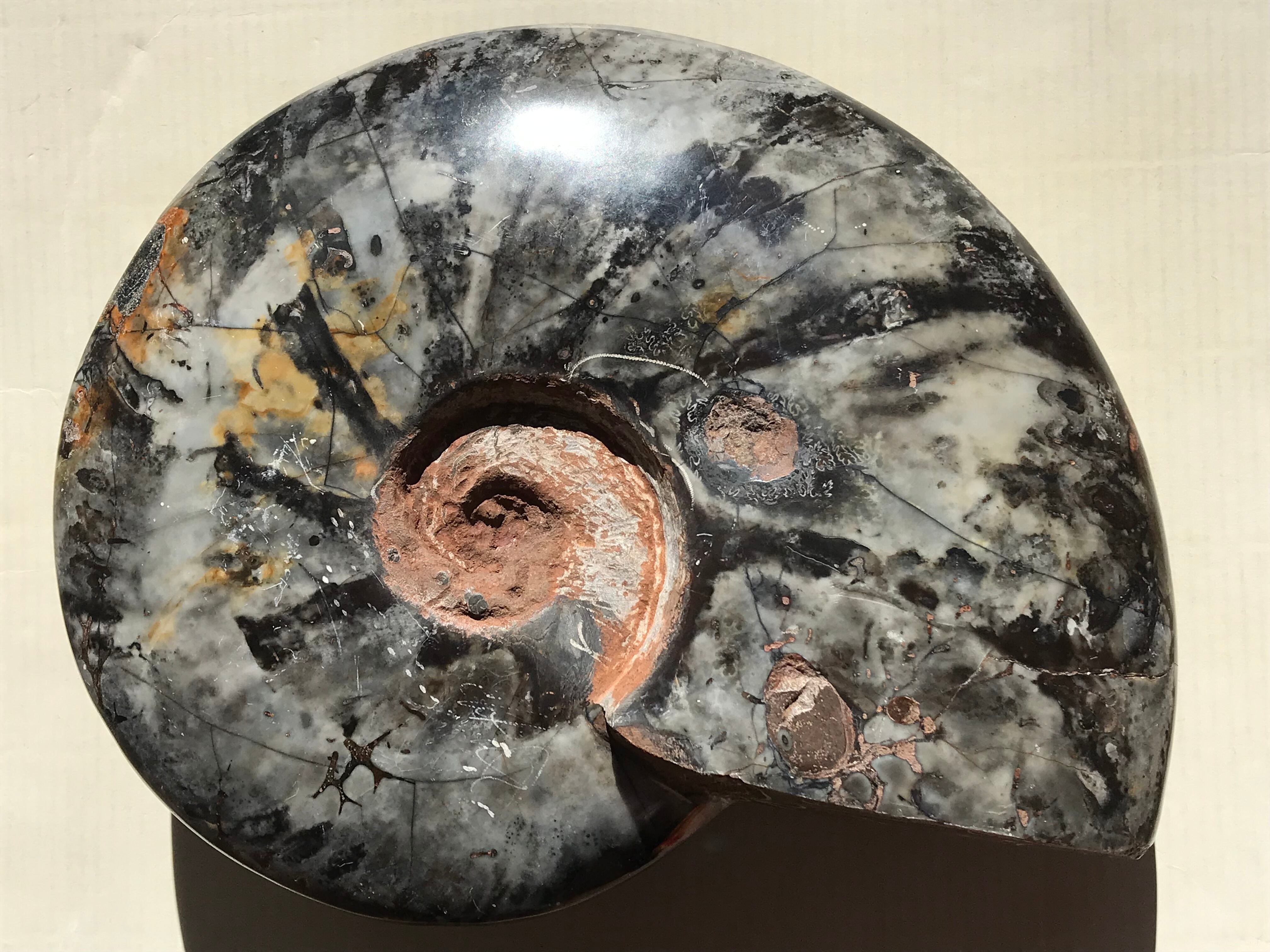 ⭐︎ブラックアンモナイトの超特大個体に約9.0cmの中サイズ個体が結合された博物館サイズの結合体です。(結合は入荷時からの状態です。)大きさと重さには圧巻で、超特大サイズ個体は多色多模様が楽しめます。また、磁力があり磁石にくっ付きます。超特大サイズの結合個体は非常に珍しいので、この機会にコレクションやプレゼントにいかがでしょうか。