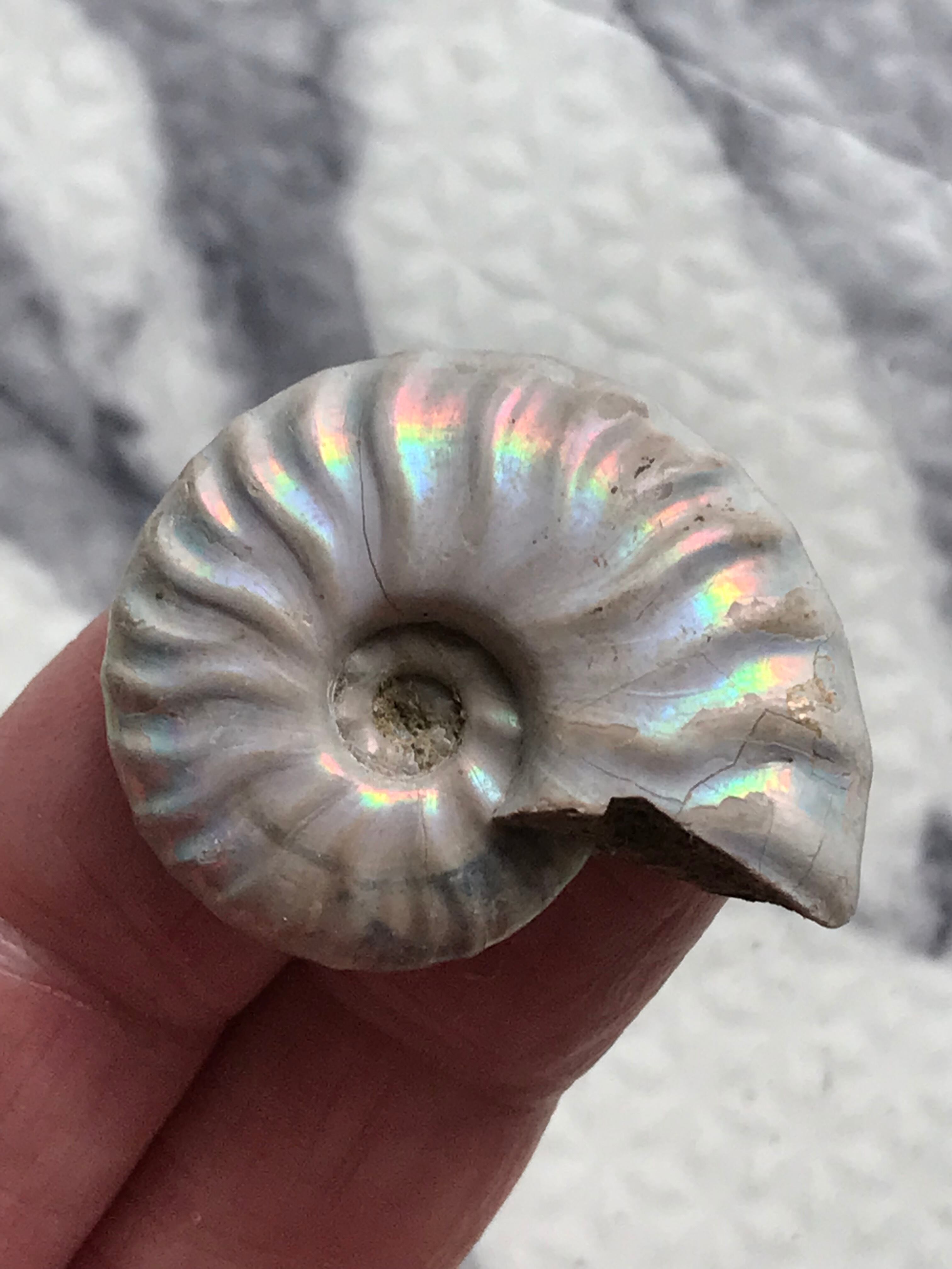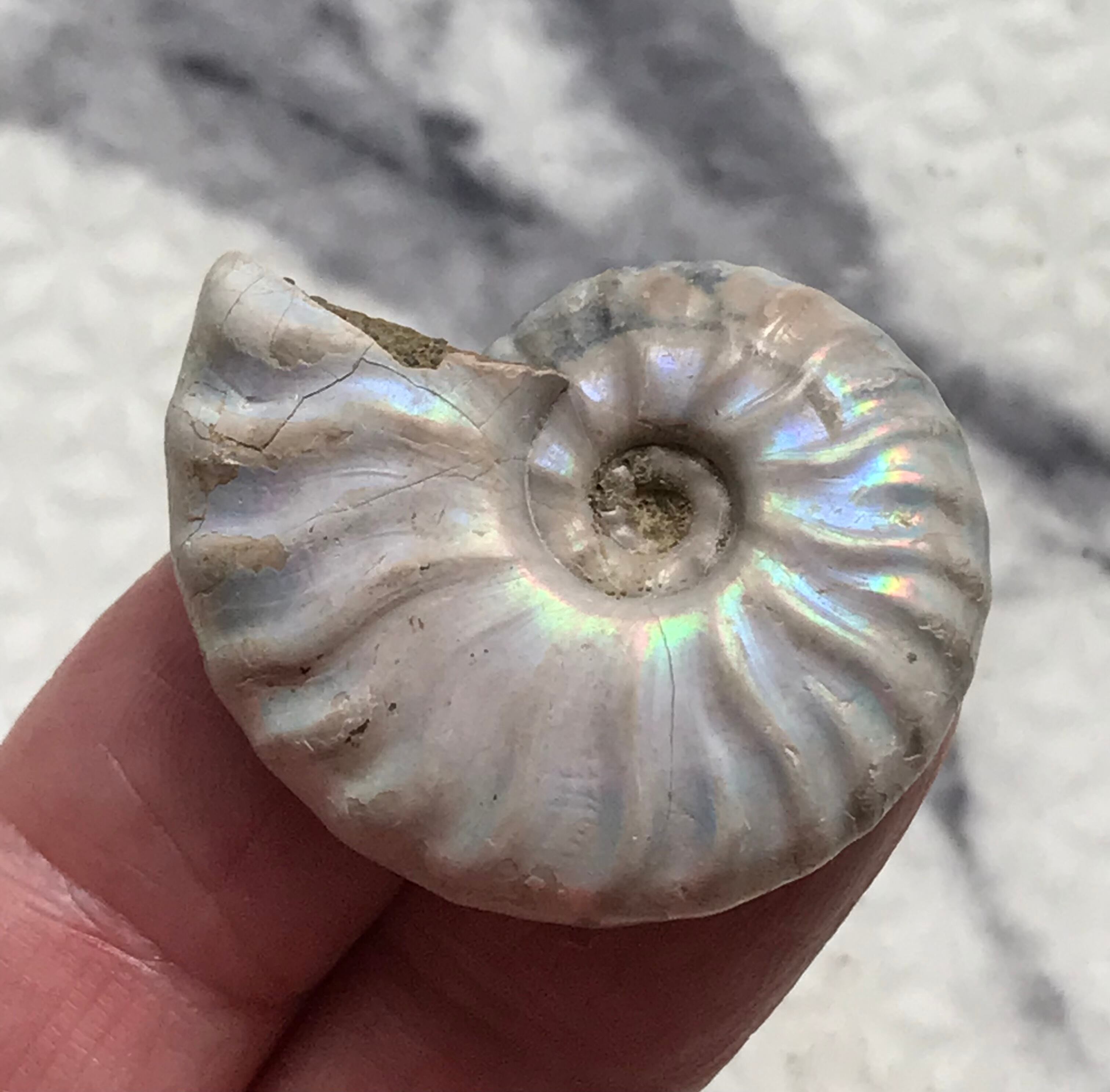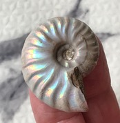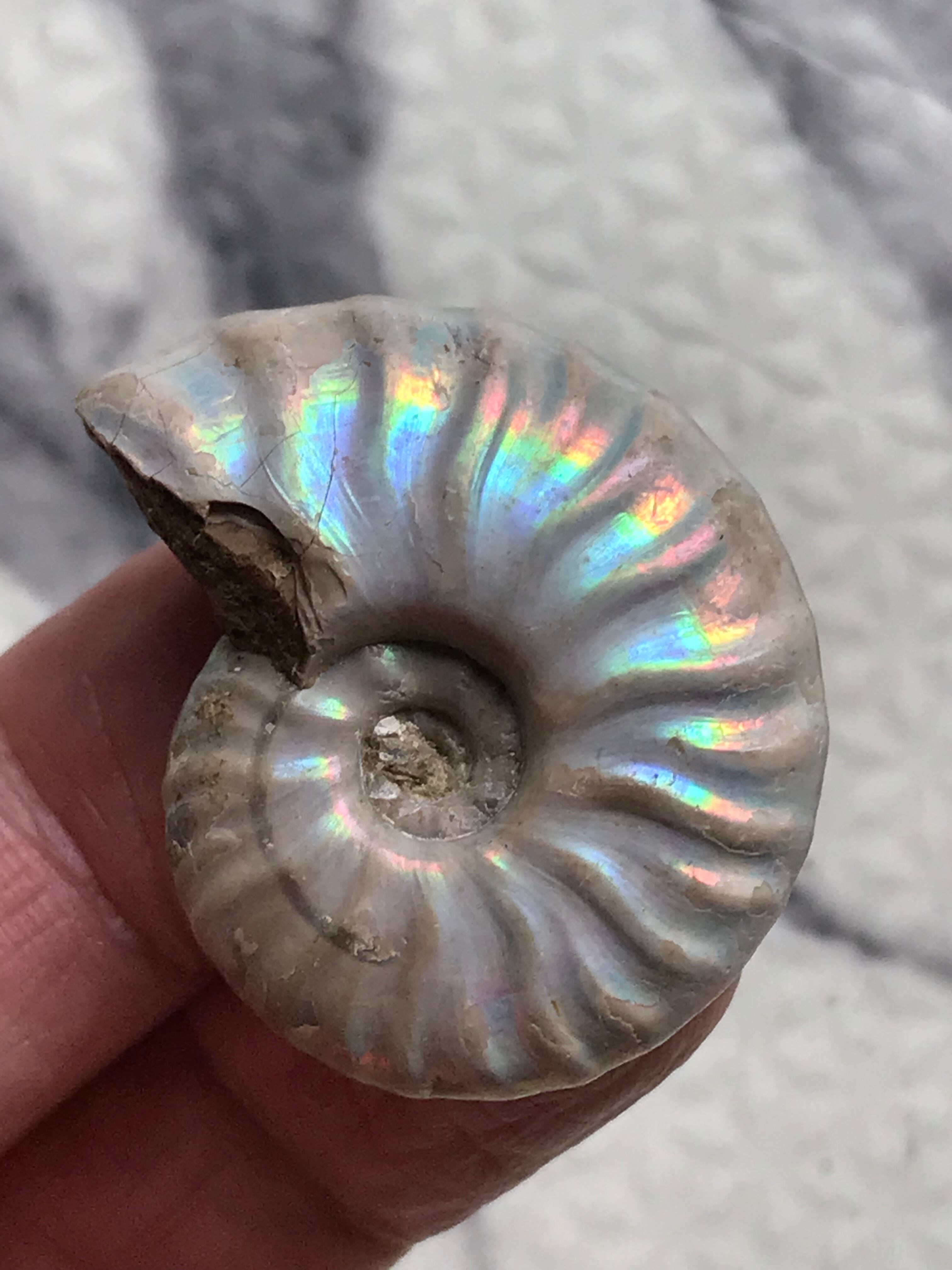 虹色の遊色効果があるアンモナイトです。殻表面が日光や照明にあたる角度によって青、緑、紫、ピンク等に輝き飽きがきません。カラフルな色彩の個体をお探しの方や、プレゼントとしての化石をお考えの方はこの機会にいかがでしょうか。