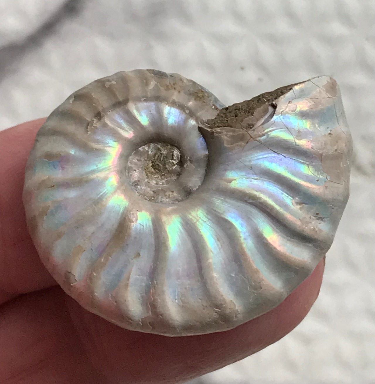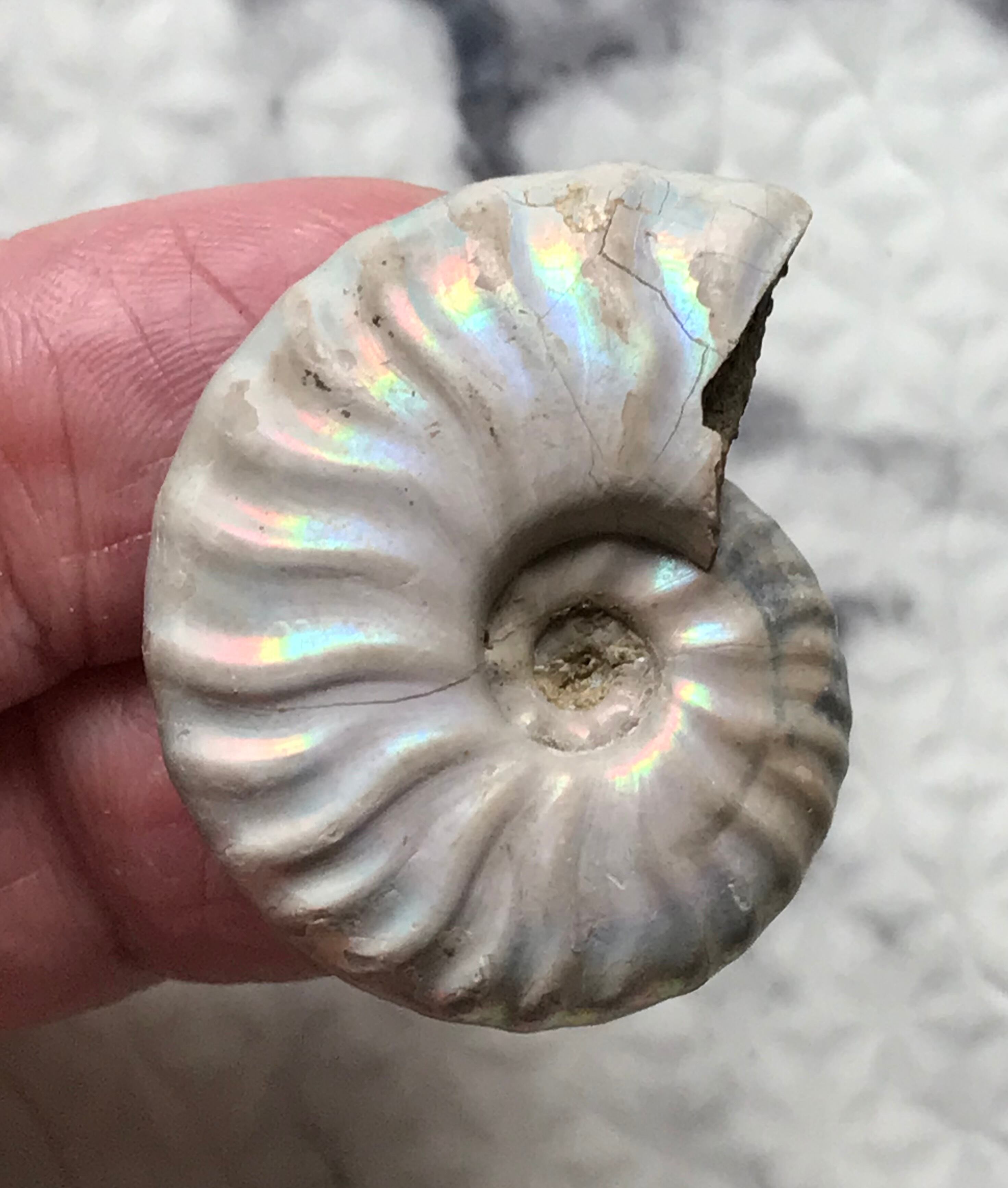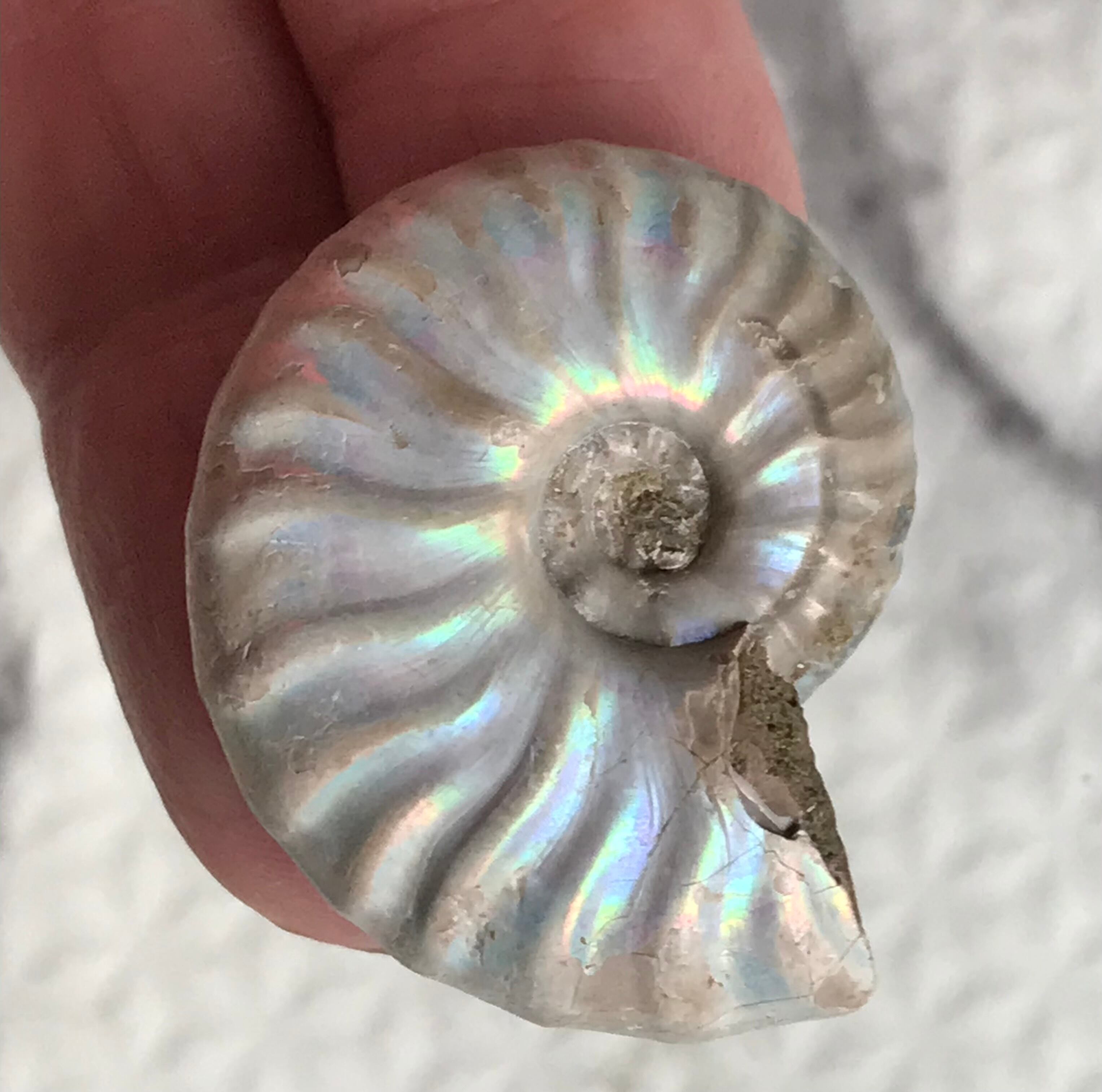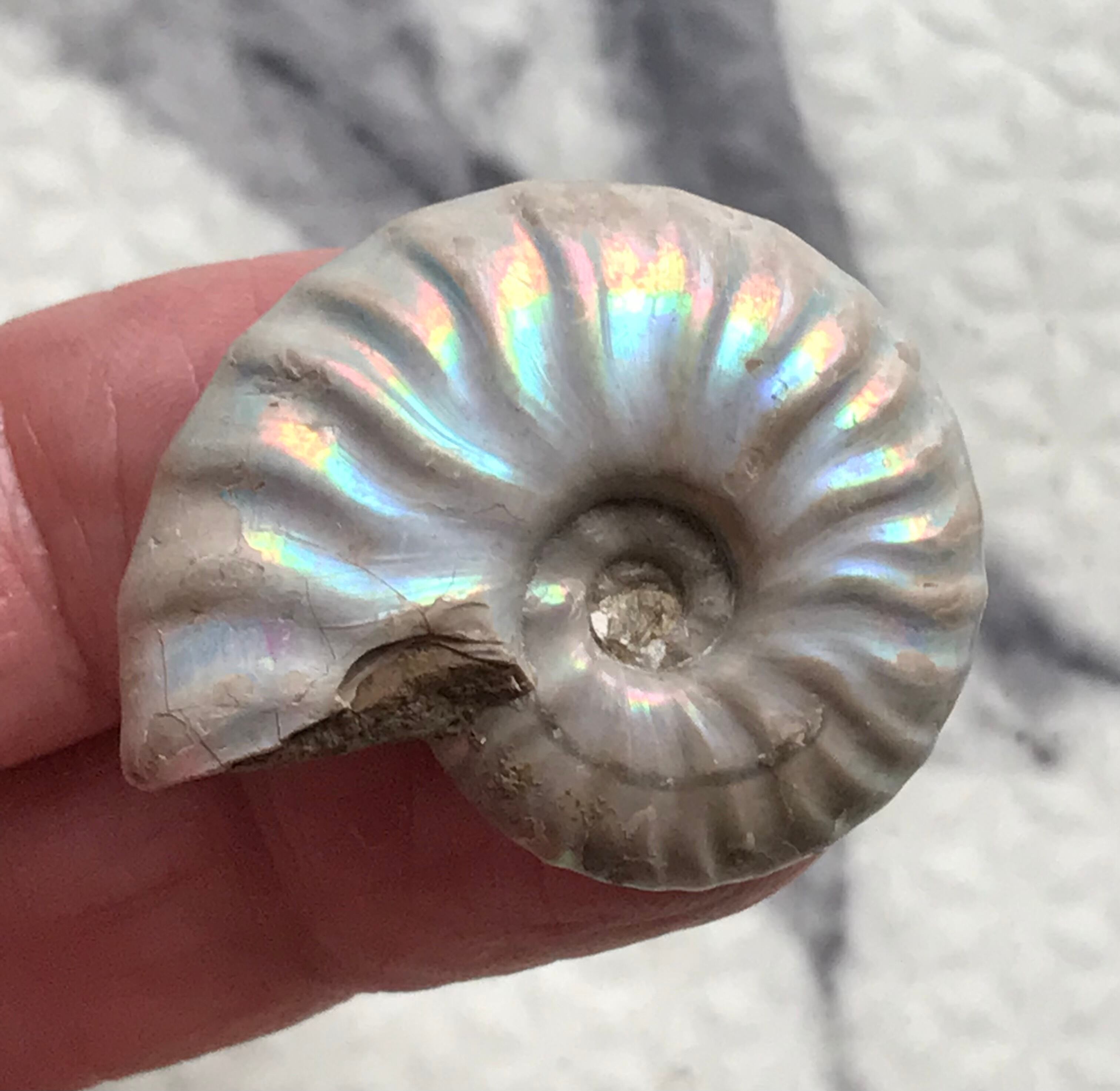 虹色の遊色効果があるアンモナイトです。殻表面が日光や照明にあたる角度によって青、緑、紫、ピンク等に輝き飽きがきません。カラフルな色彩の個体をお探しの方や、プレゼントとしての化石をお考えの方はこの機会にいかがでしょうか。