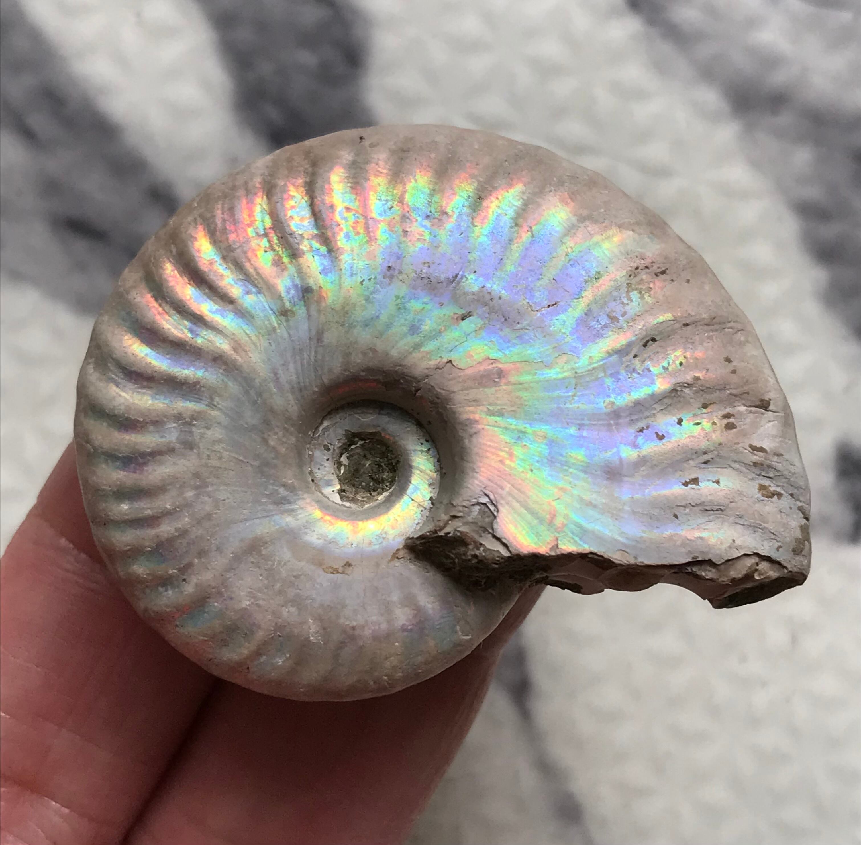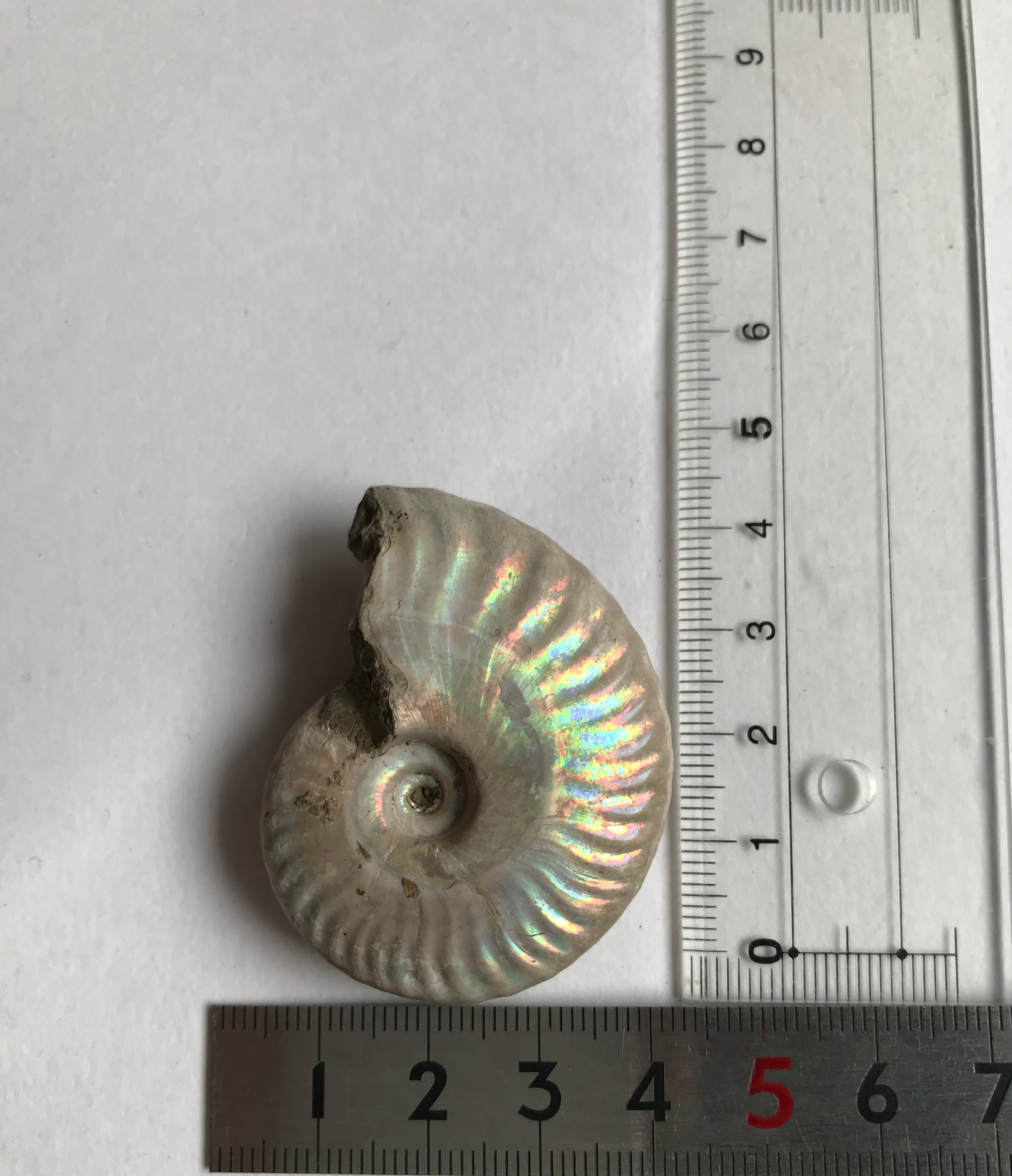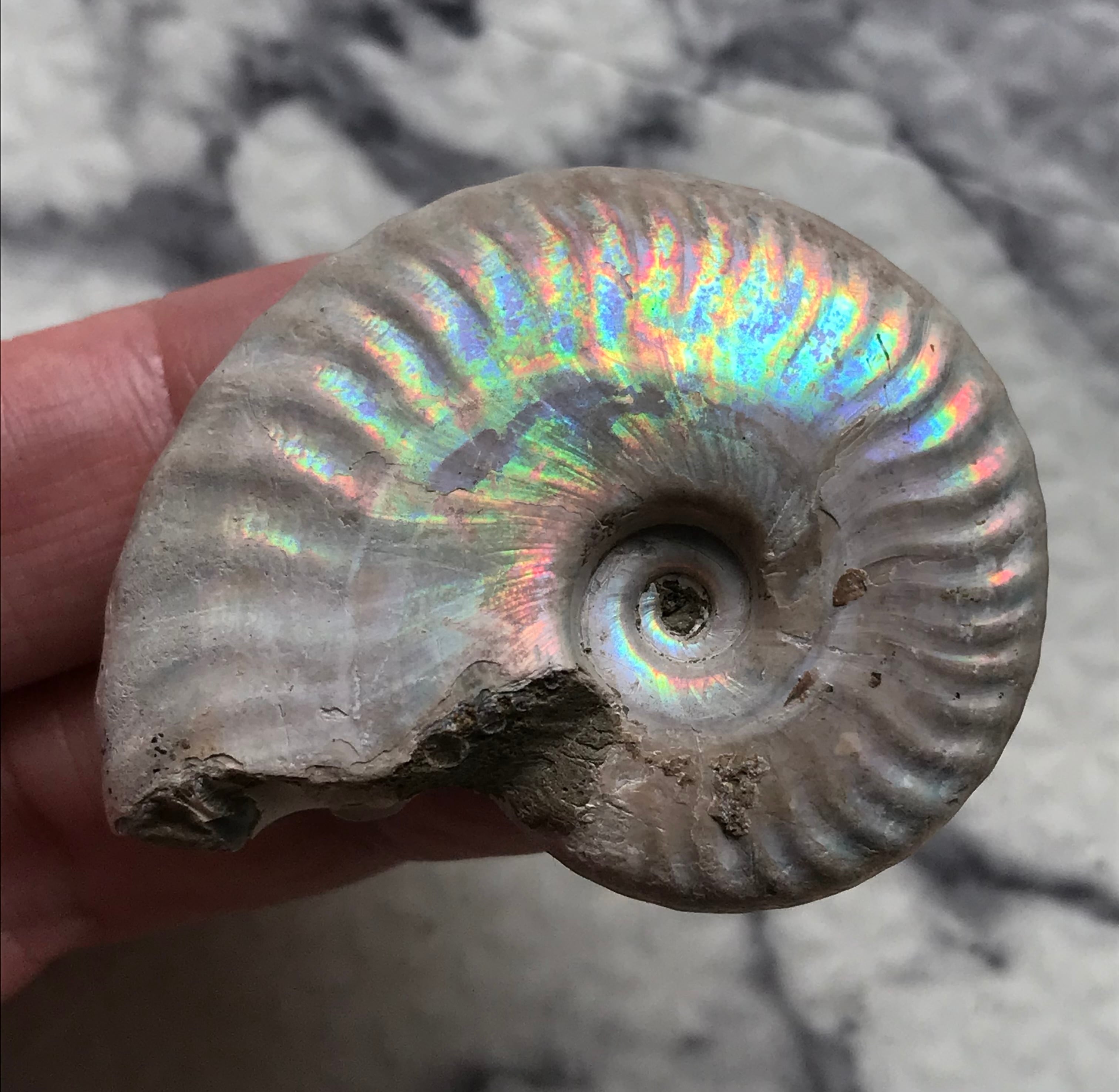 虹色の遊色効果があるアンモナイトです。殻表面が日光や照明にあたる角度によって青、緑、紫、ピンク等に輝き飽きがきません。カラフルな色彩の個体をお探しの方や、プレゼントとしての化石をお考えの方はこの機会にいかがでしょうか。