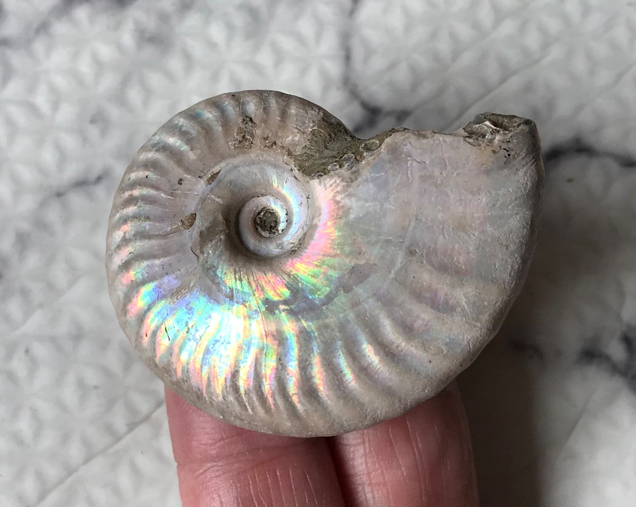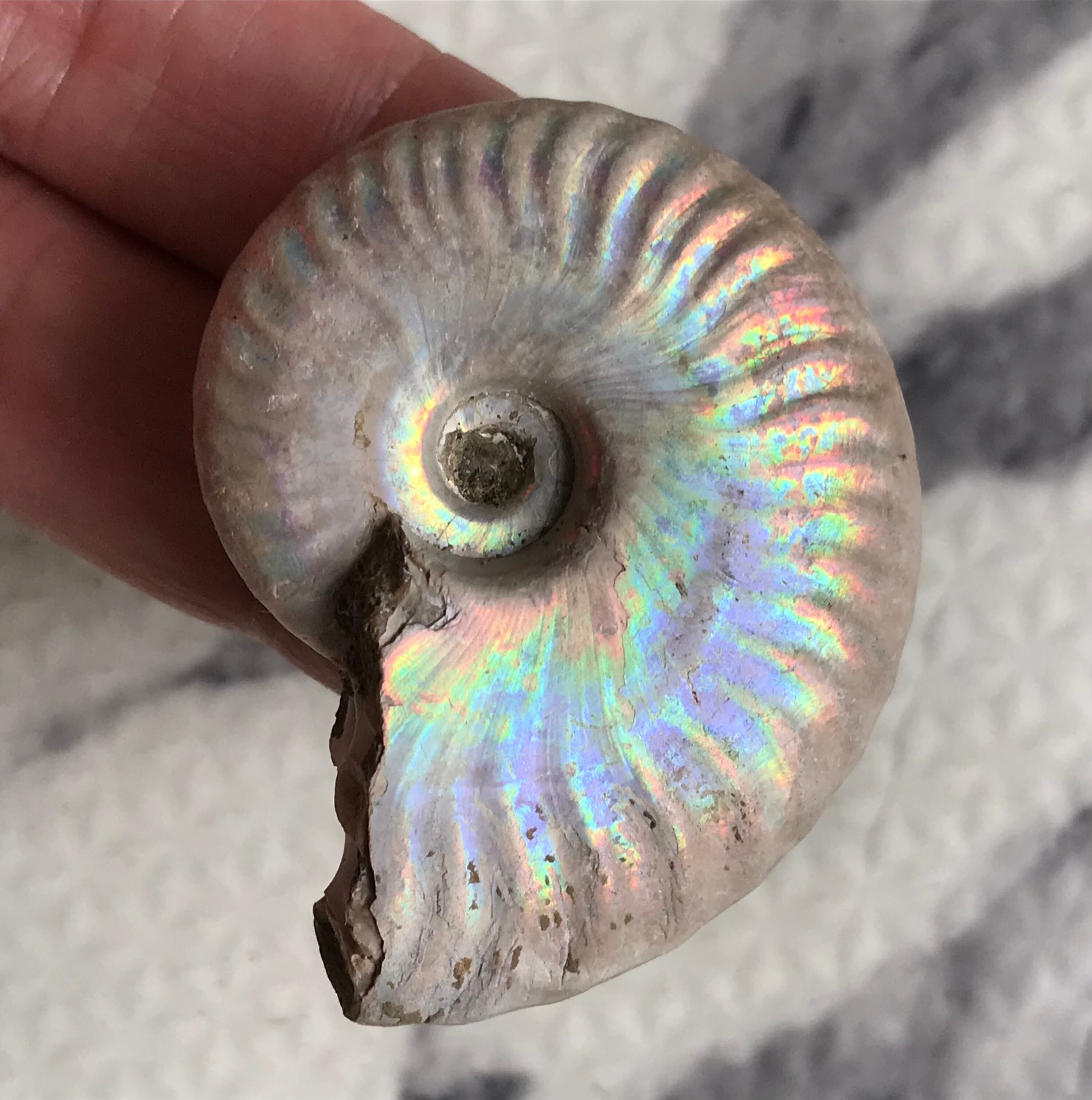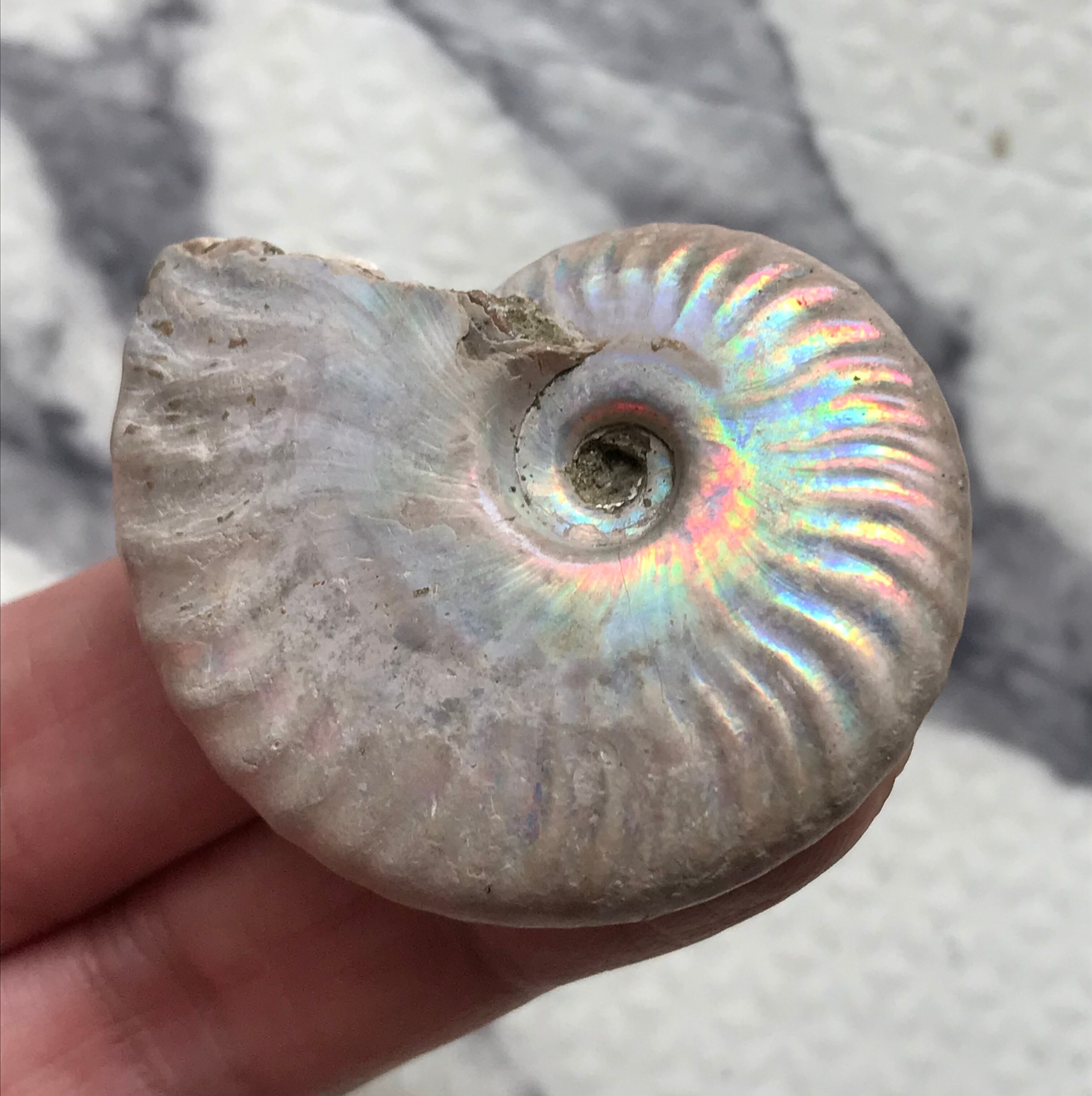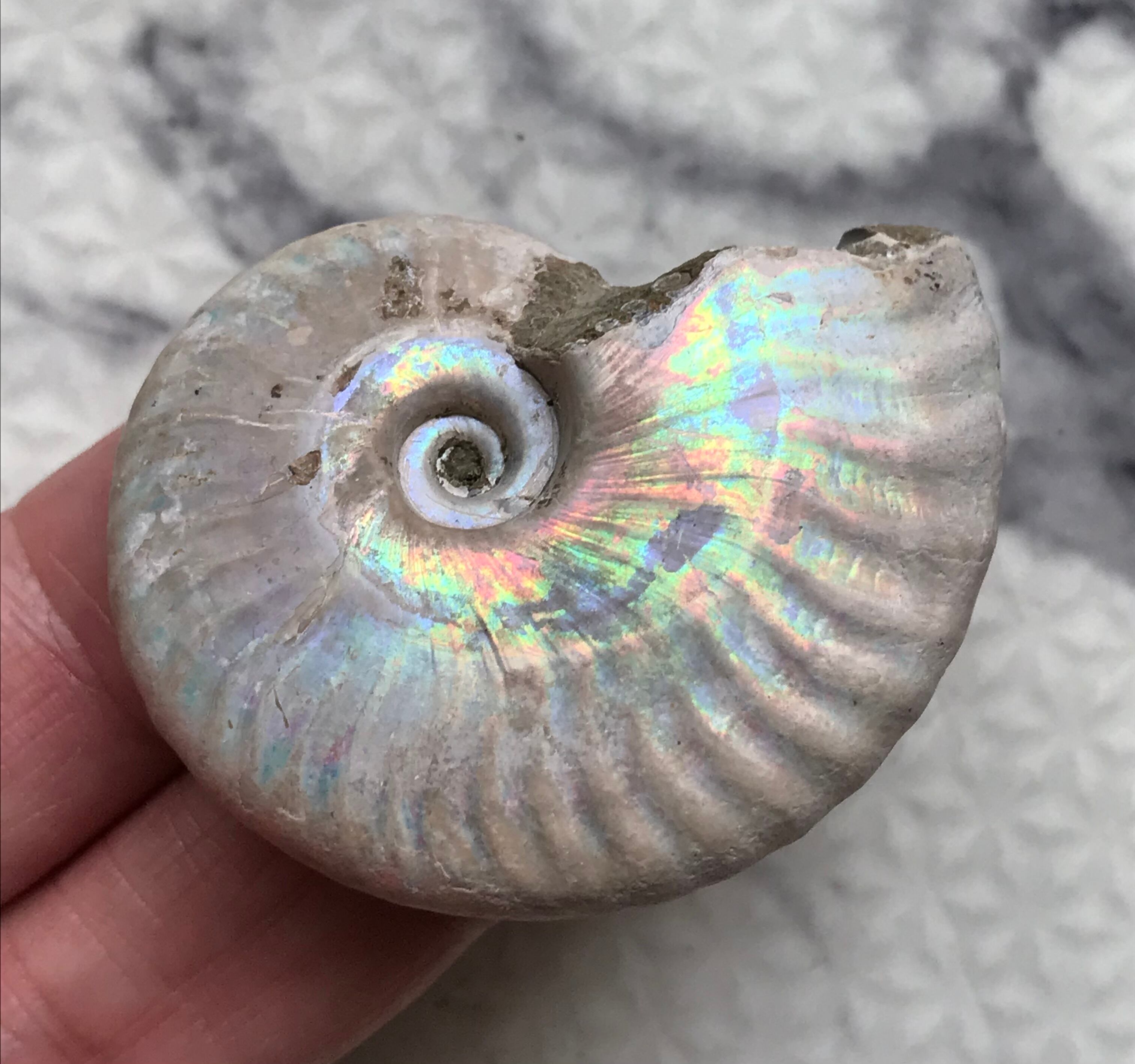 虹色の遊色効果があるアンモナイトです。殻表面が日光や照明にあたる角度によって青、緑、紫、ピンク等に輝き飽きがきません。カラフルな色彩の個体をお探しの方や、プレゼントとしての化石をお考えの方はこの機会にいかがでしょうか。
