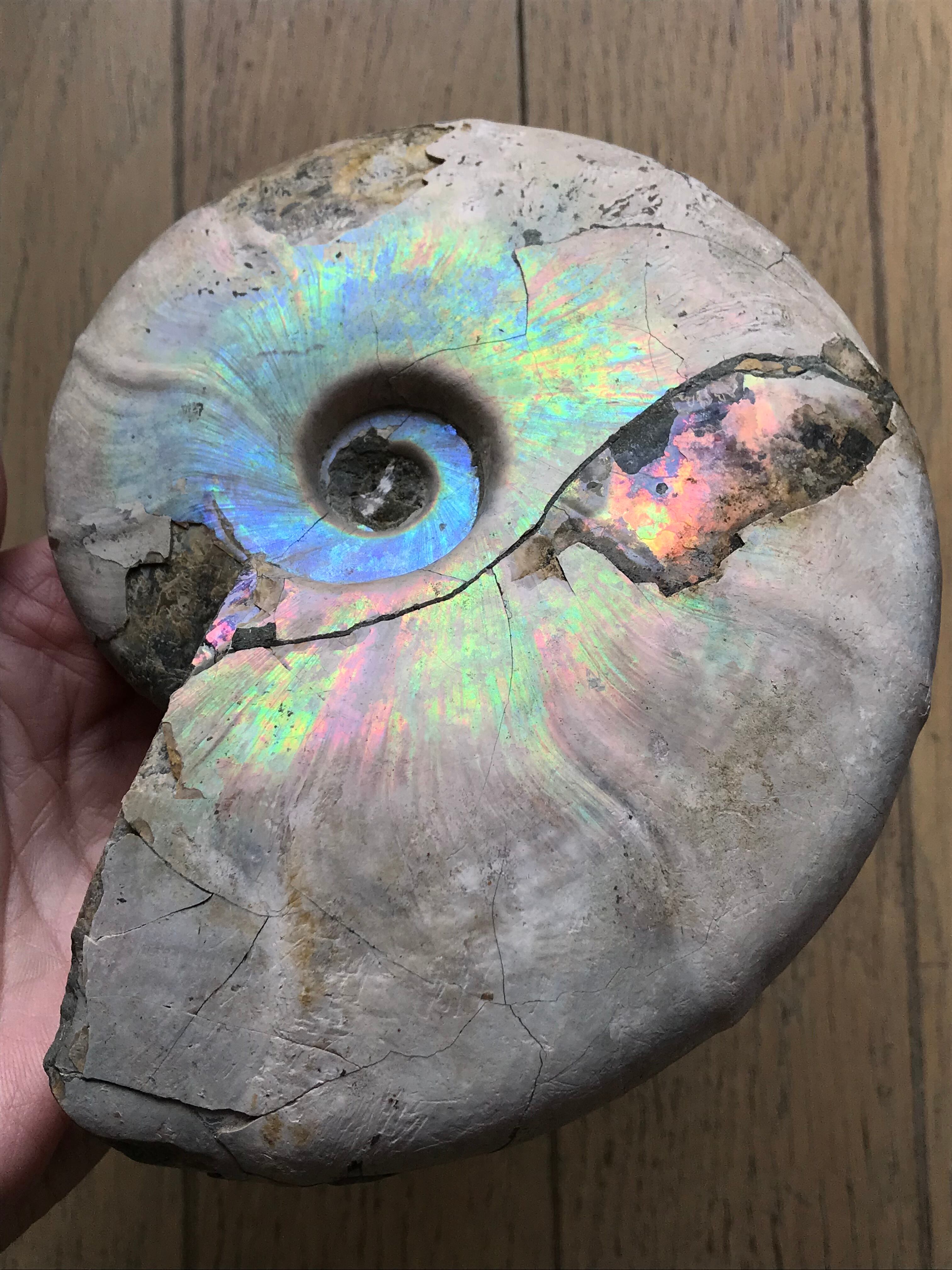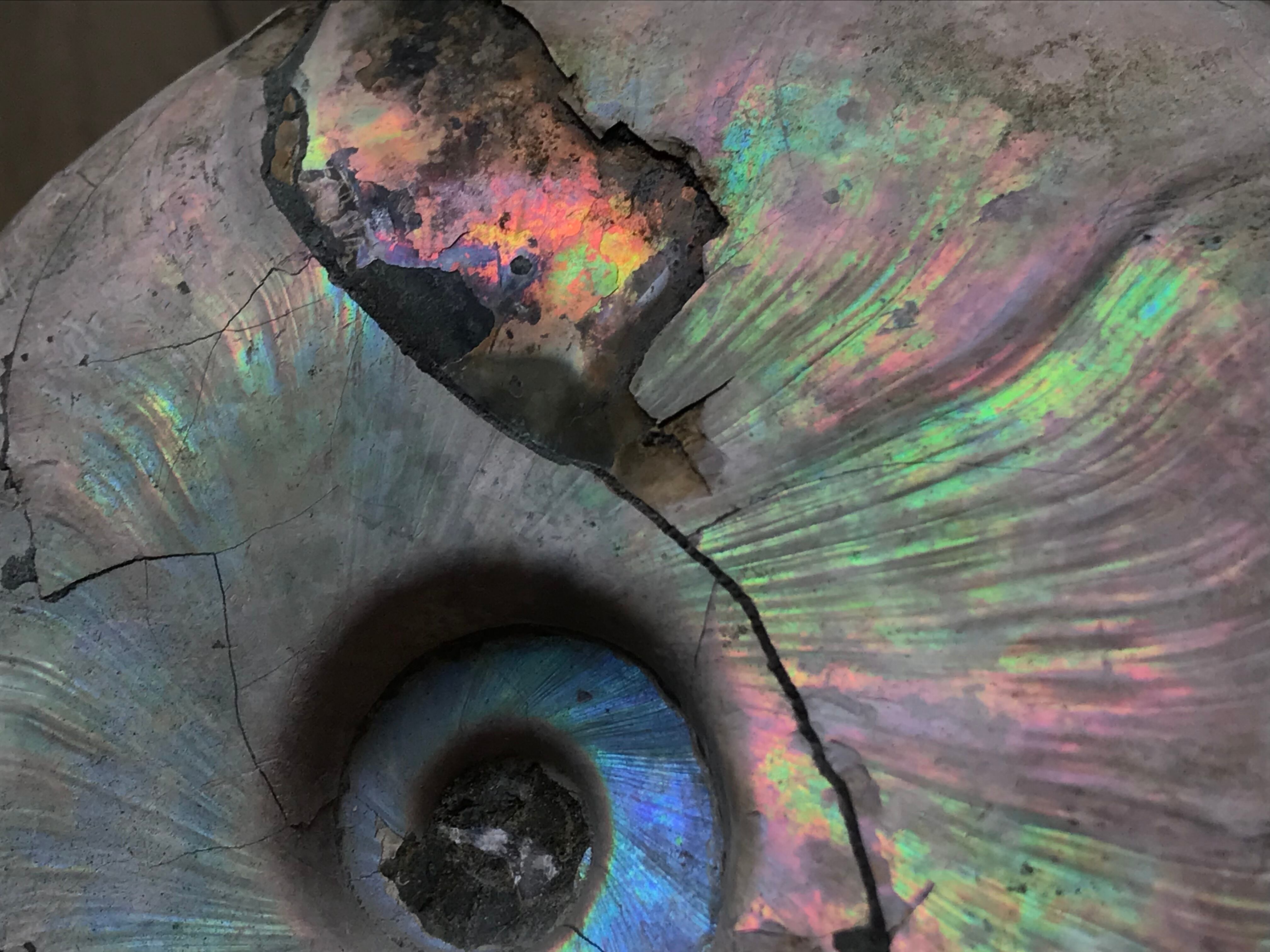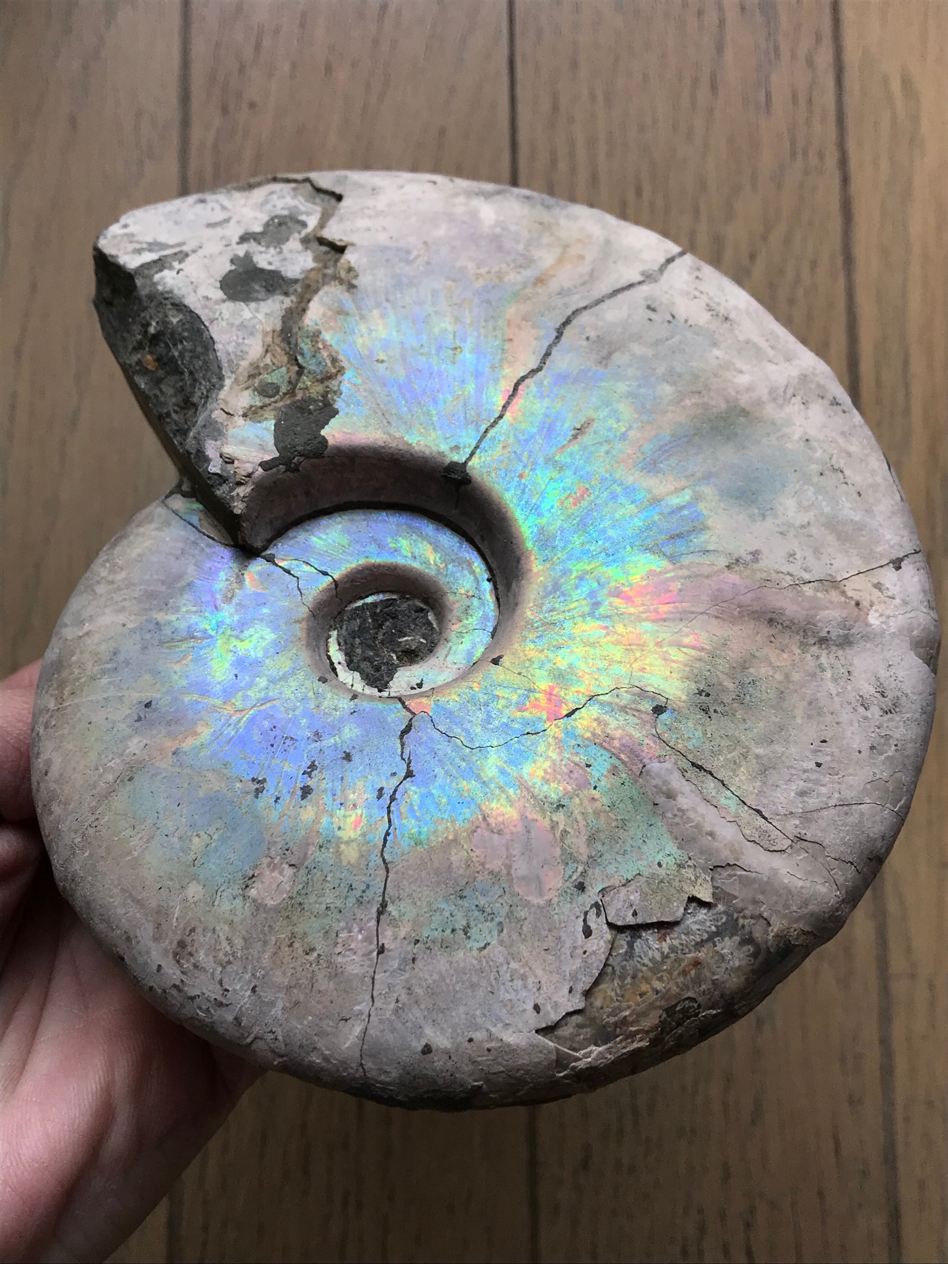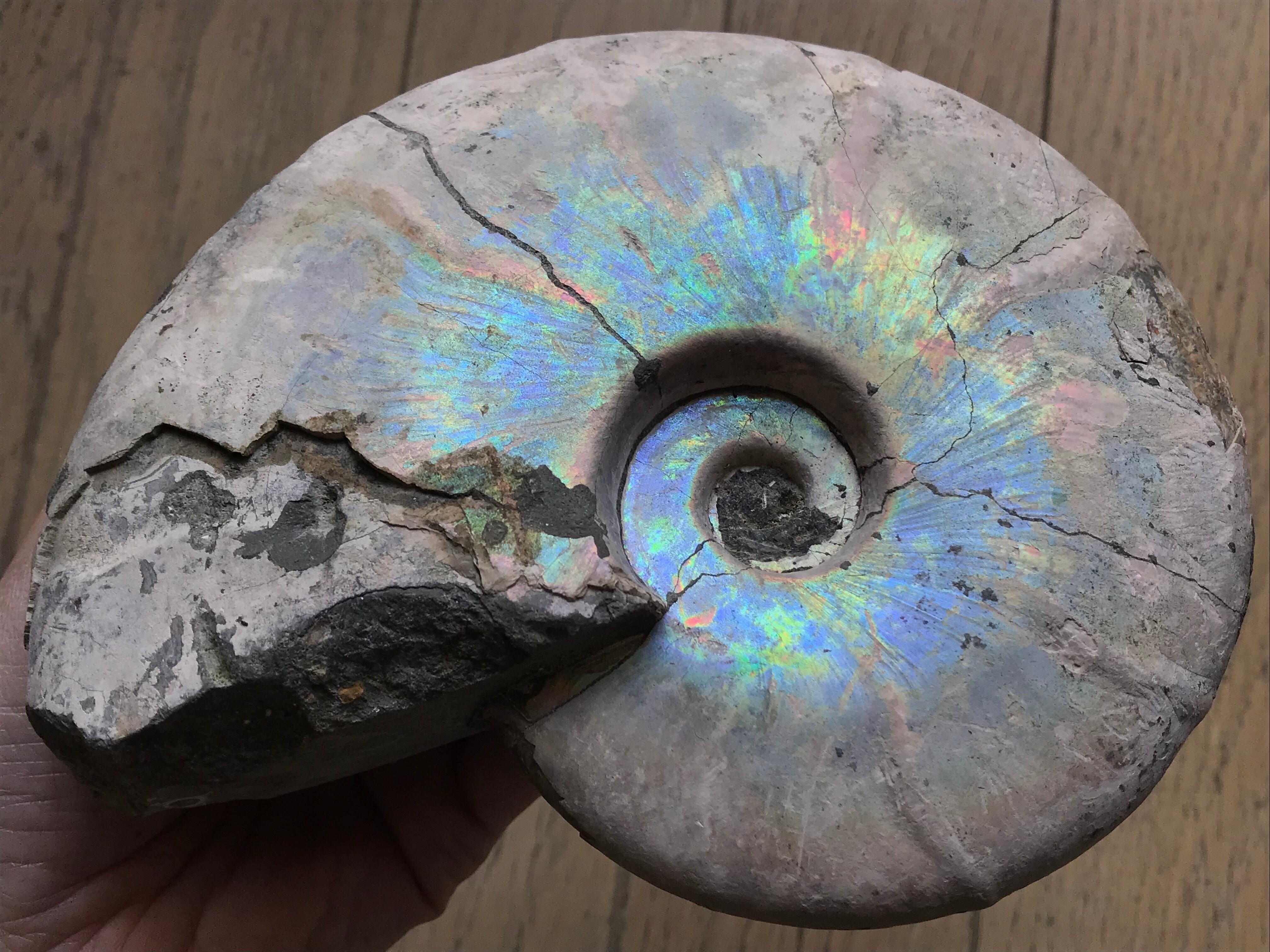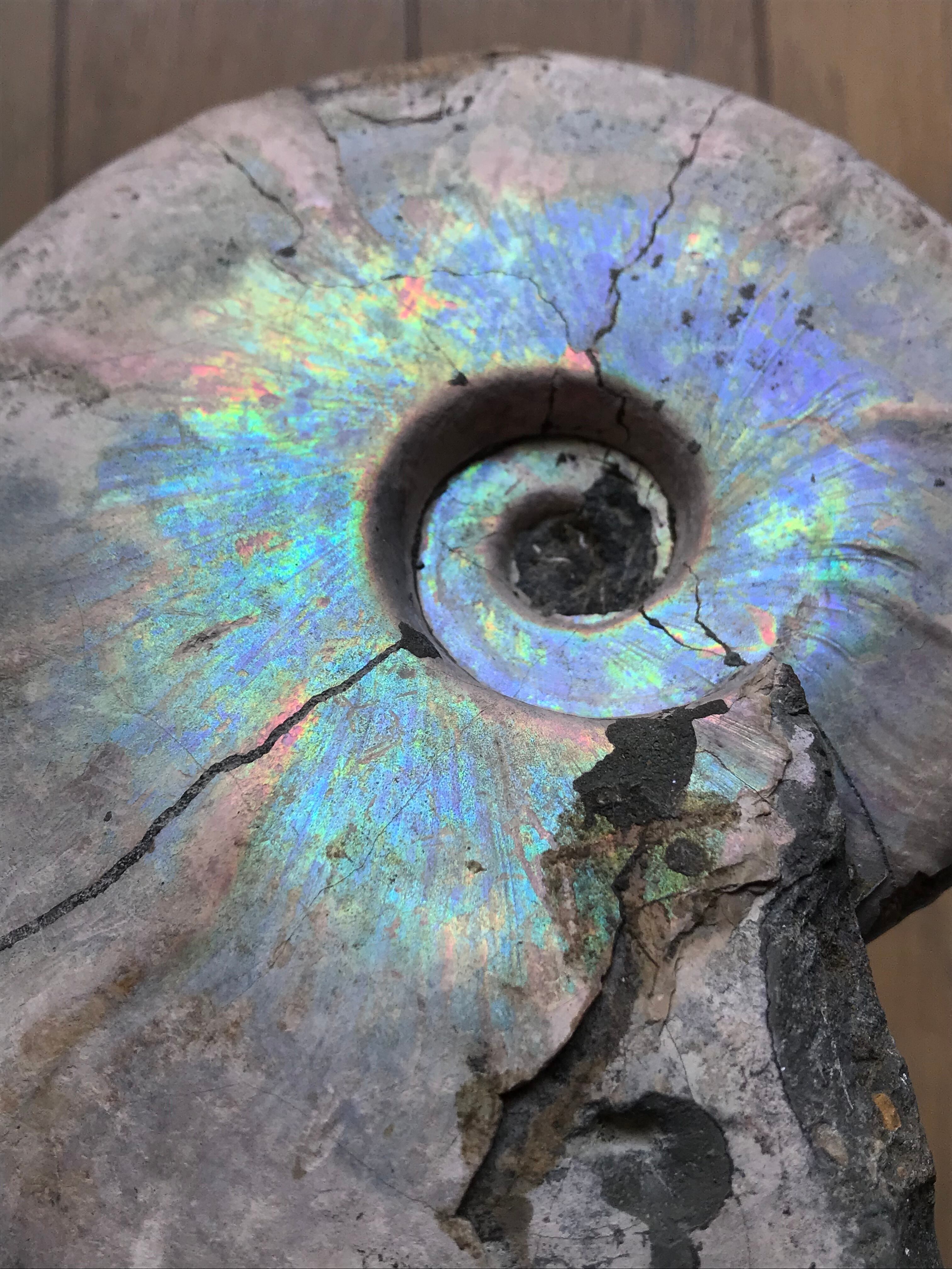 虹色の遊色効果があるアンモナイトです。殻表面が日光や照明にあたる角度によって青、緑、紫、ピンク等に輝き飽きがきません。カラフルな色彩の個体をお探しの方や、プレゼントとしての化石をお考えの方はこの機会にいかがでしょうか。