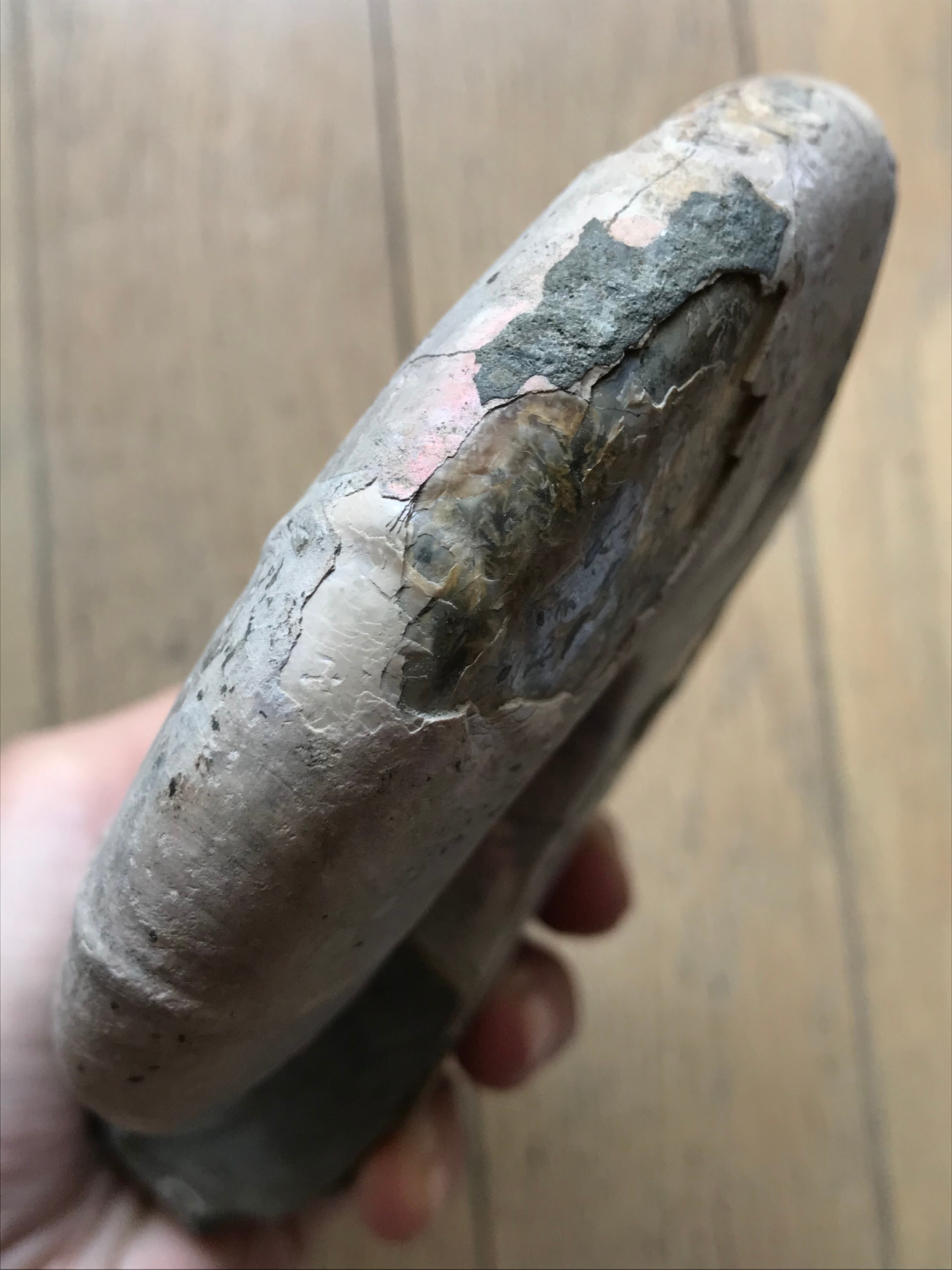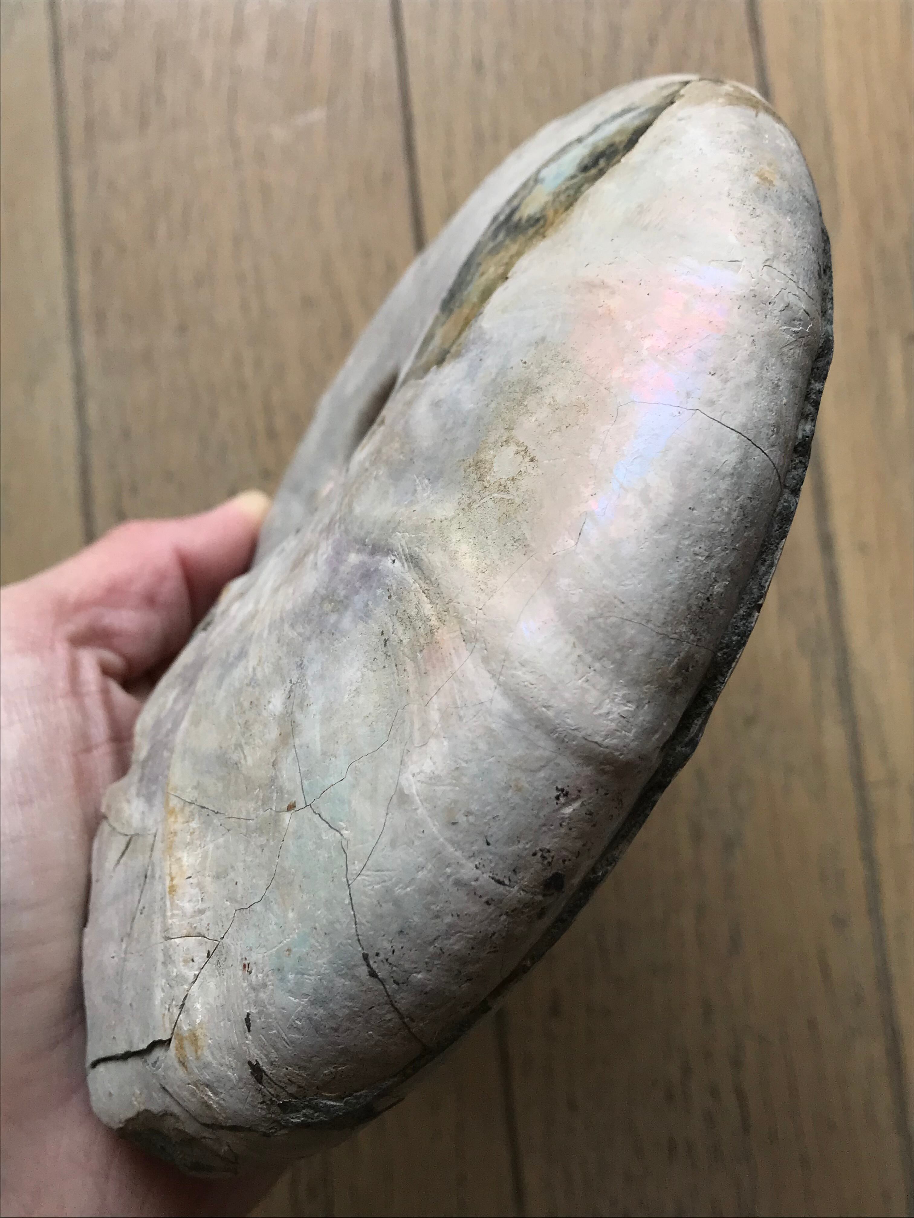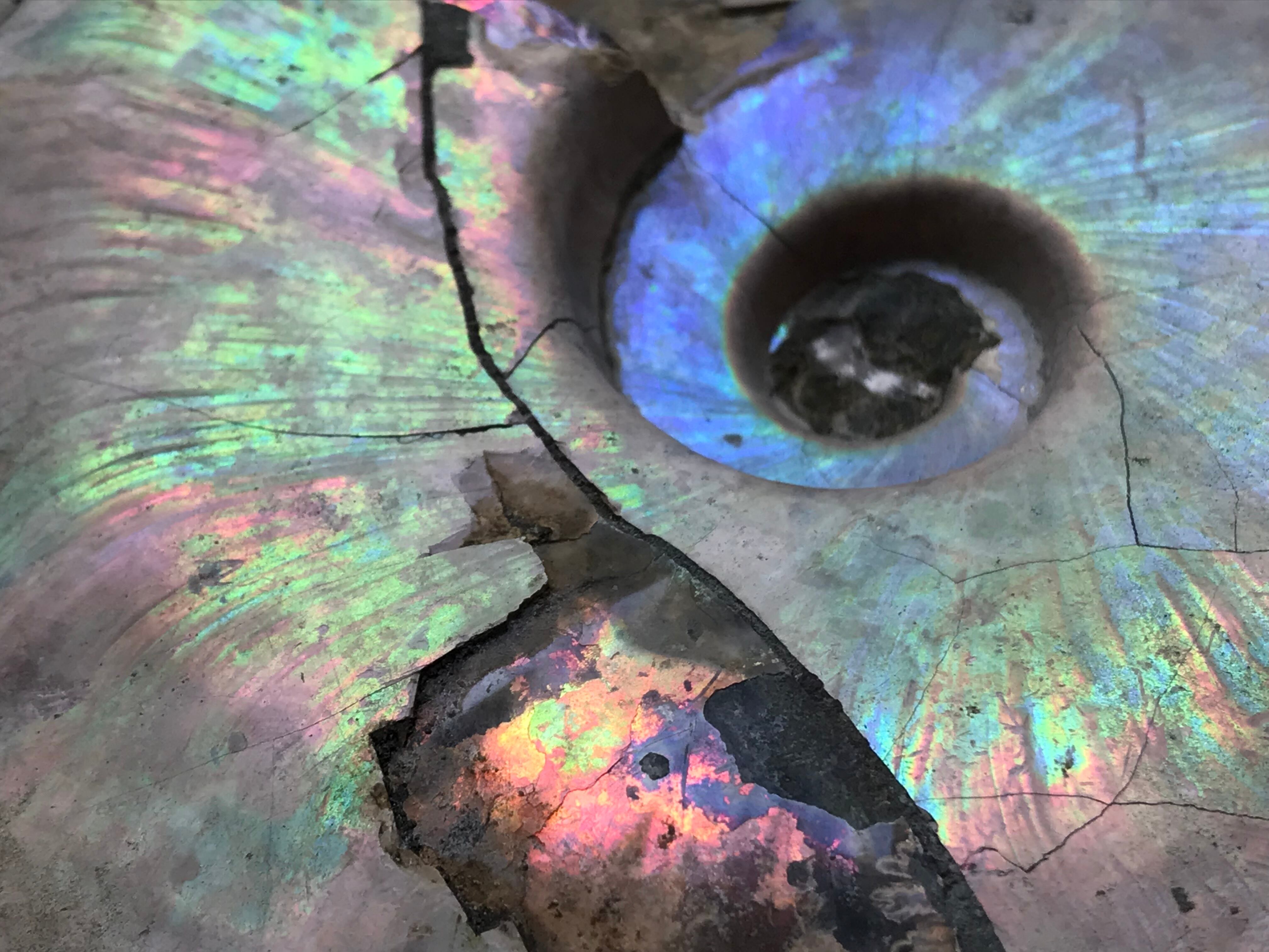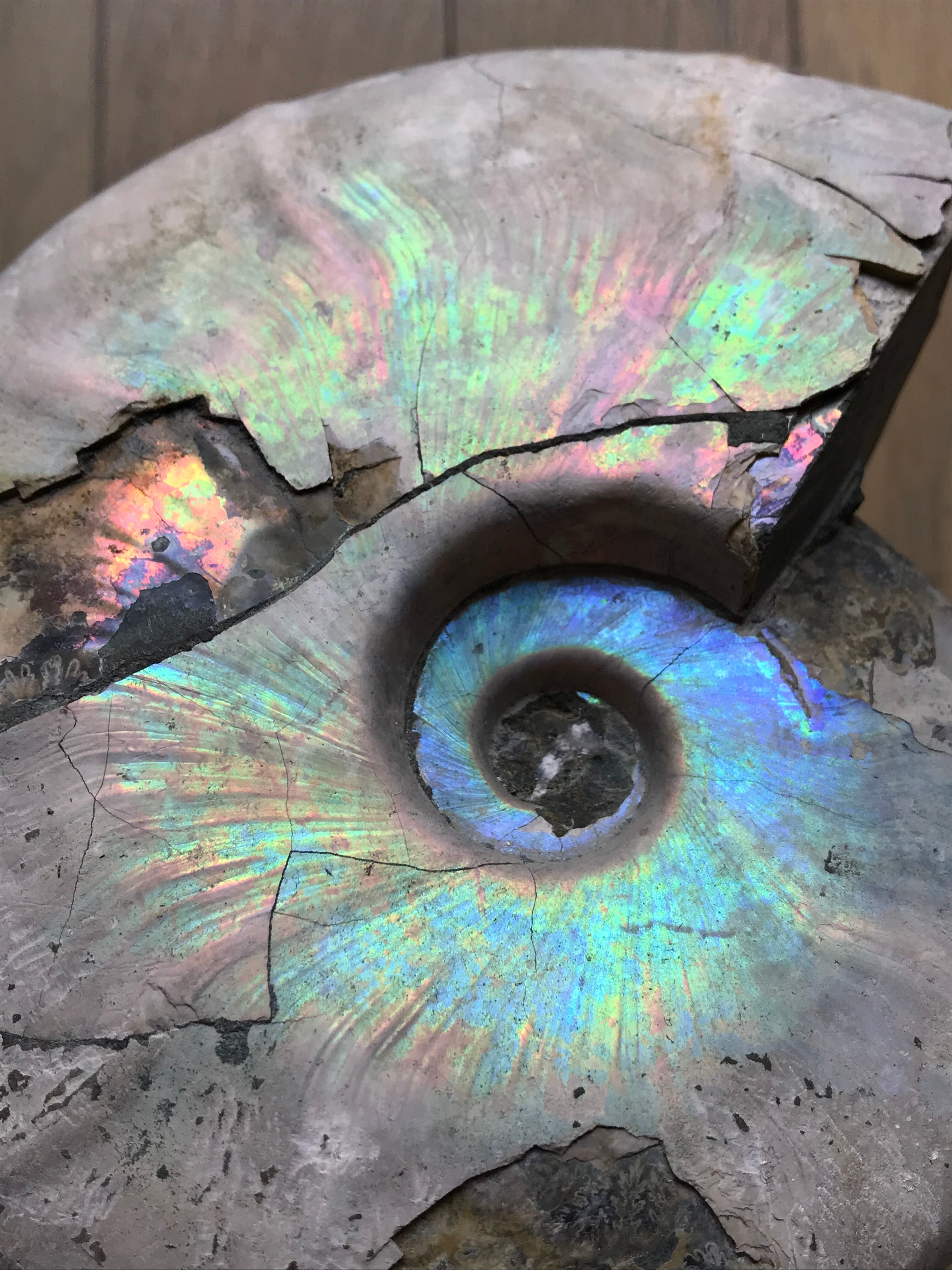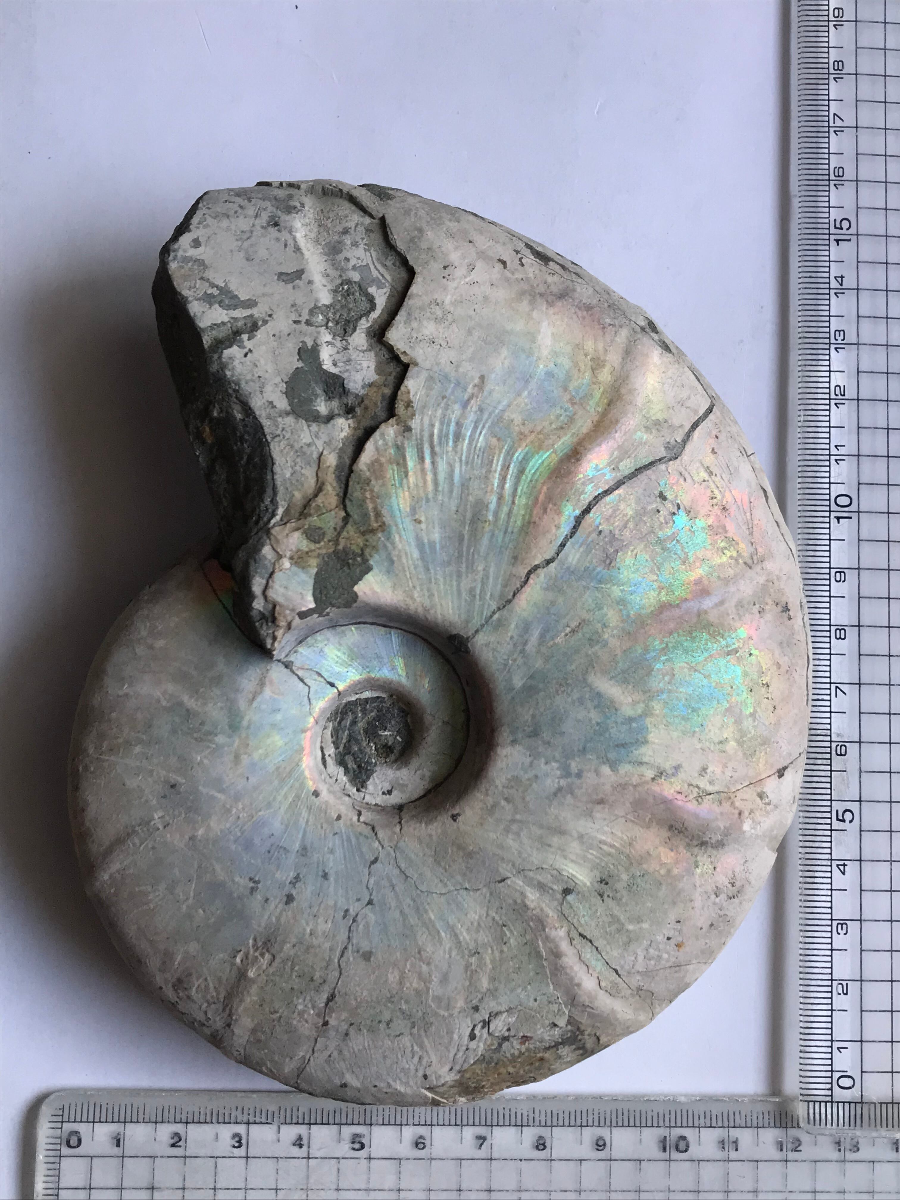虹色の遊色効果があるアンモナイトです。殻表面が日光や照明にあたる角度によって青、緑、紫、ピンク等に輝き飽きがきません。カラフルな色彩の個体をお探しの方や、プレゼントとしての化石をお考えの方はこの機会にいかがでしょうか。