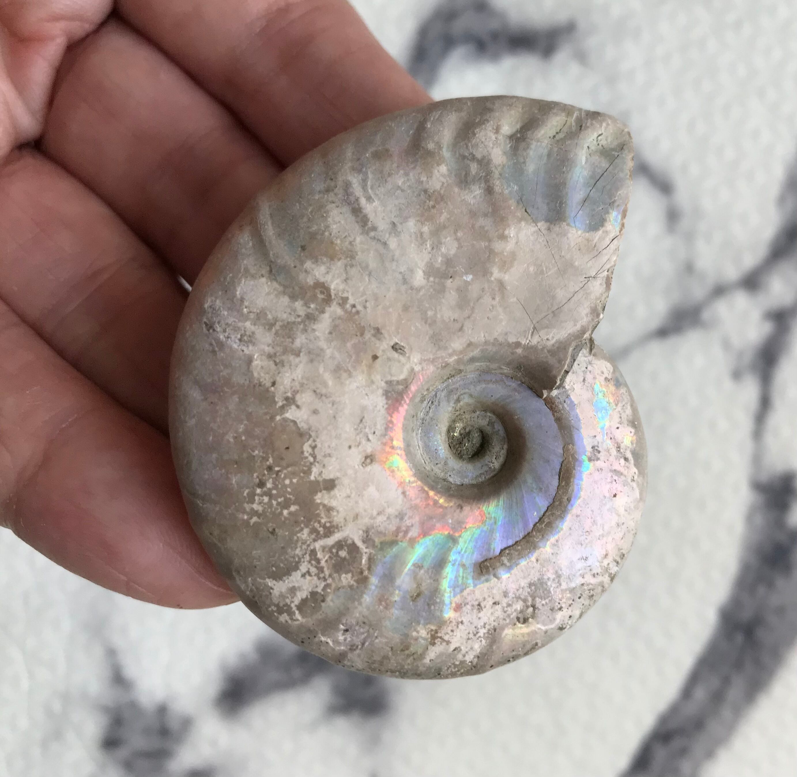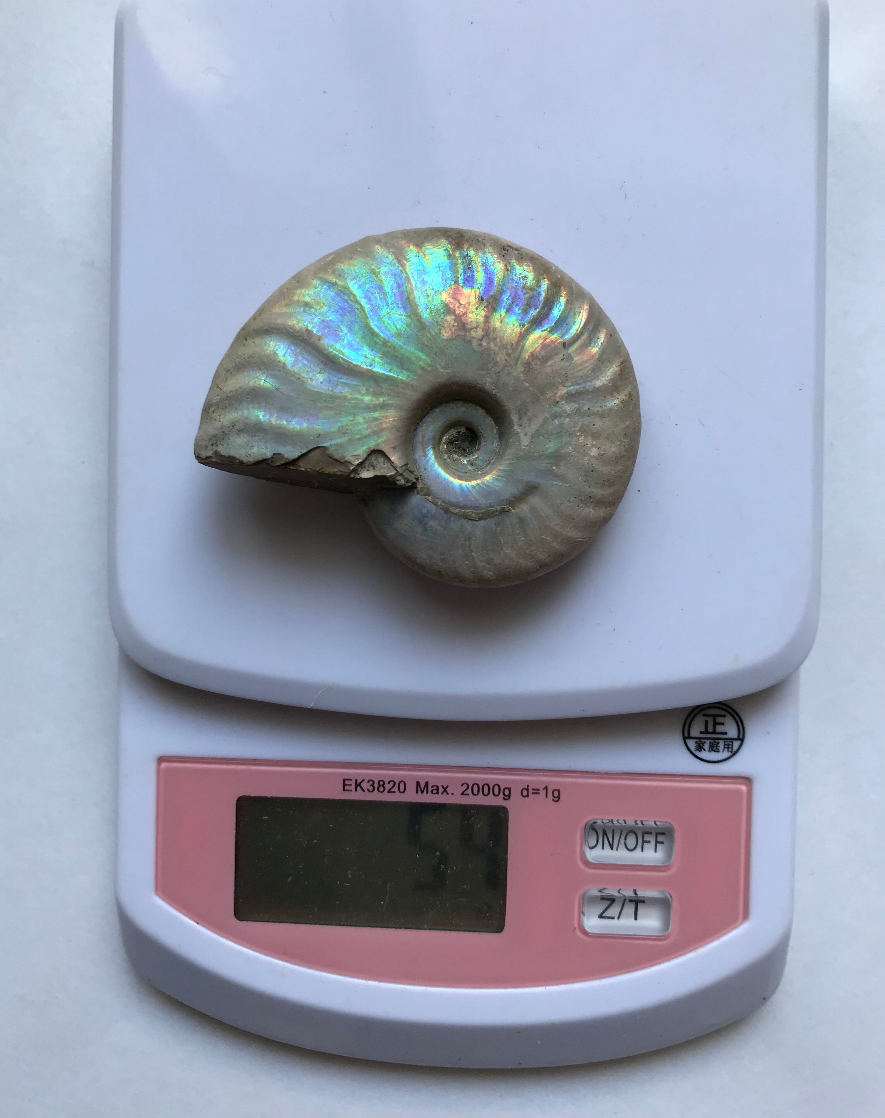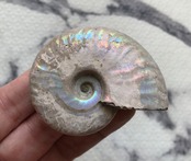 虹色の遊色効果があるアンモナイトです。殻表面が日光や照明にあたる角度によって青、緑、紫、ピンク等に輝き飽きがきません。カラフルな色彩の個体をお探しの方や、プレゼントとしての化石をお考えの方はこの機会にいかがでしょうか。